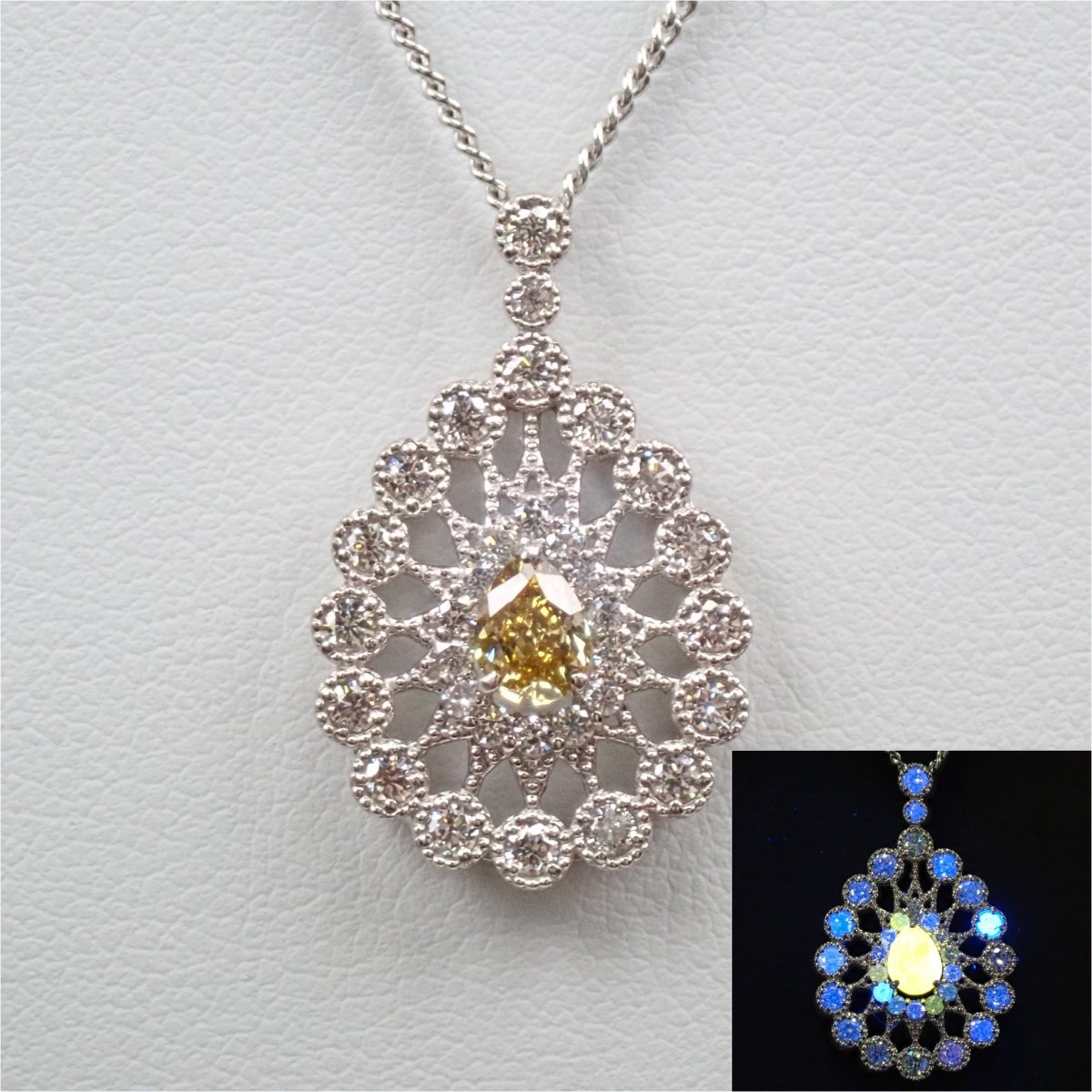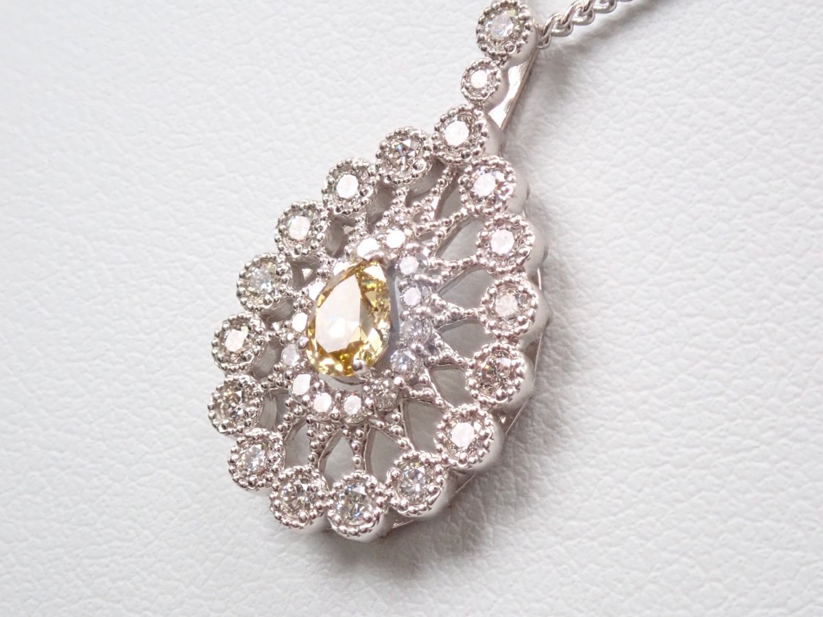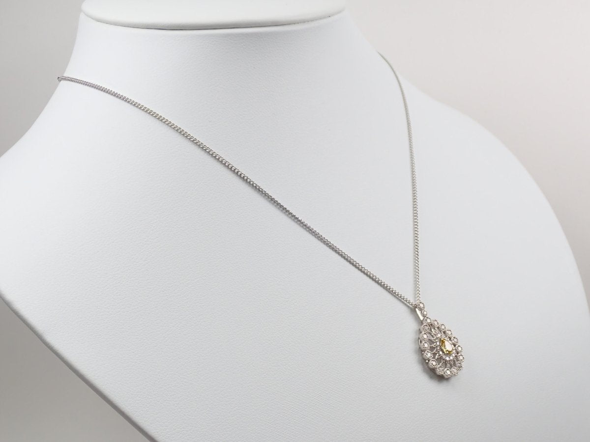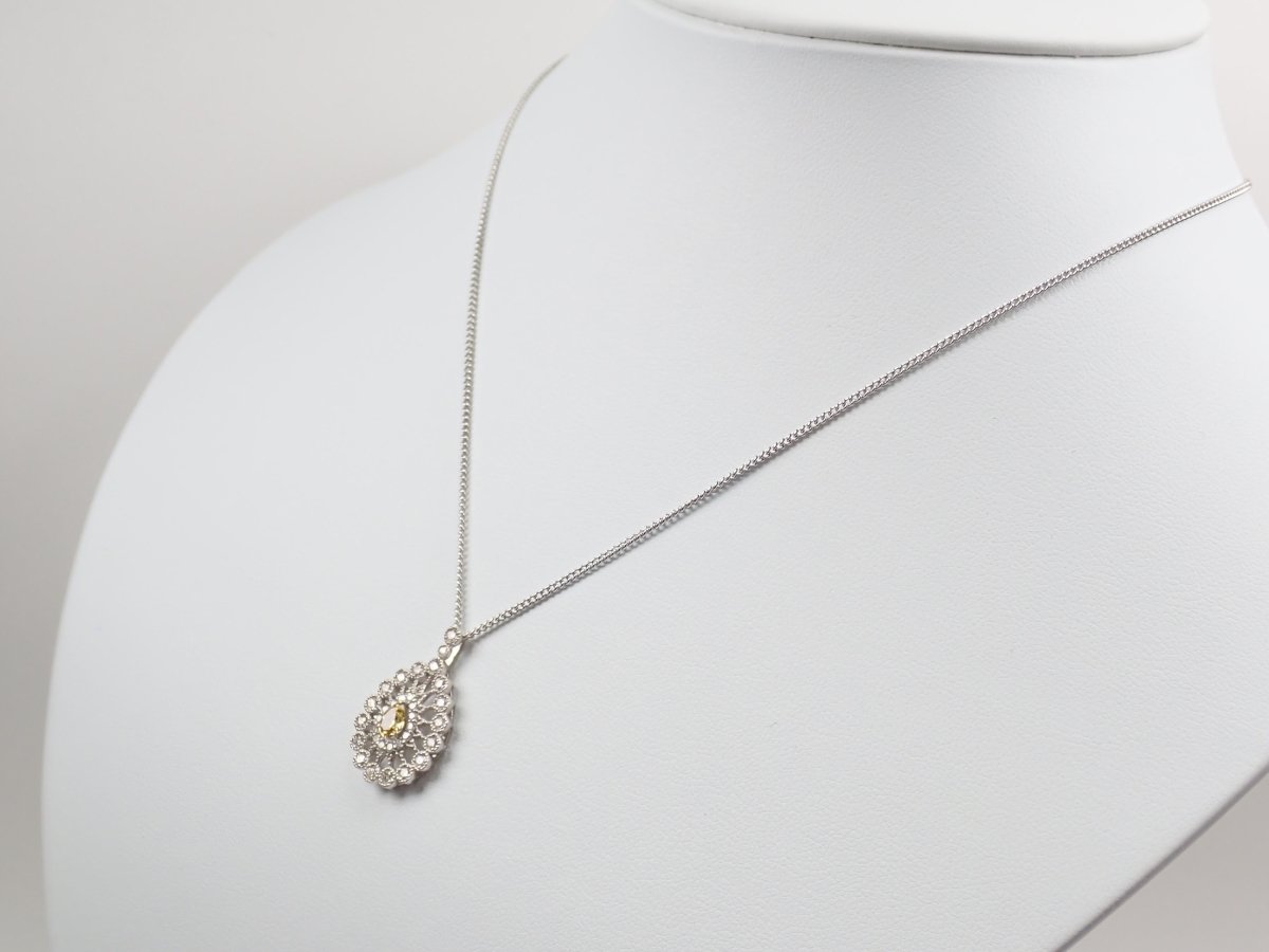 這款項鍊頂部鑲滿了鑽石,其中一顆 0.312 克拉的黃鑽即使從遠處看也呈現出明顯的黃色,周圍環繞著 0.51 克拉的奢華副石。閃閃發光的鑽石採用華麗的設計,就像透過萬花筒觀看一樣。一件精美的珠寶,在您的胸前彰顯個性。