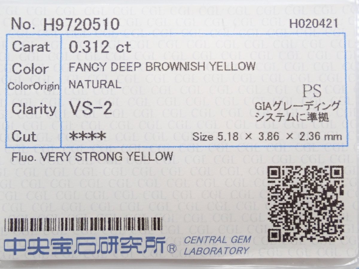 中石鑽石重0.312克拉,顏色為深棕黃色,淨度為VS-2,螢光:非常強的黃色。由中央寶石研究所進行分類。副石重 0.51 克拉。