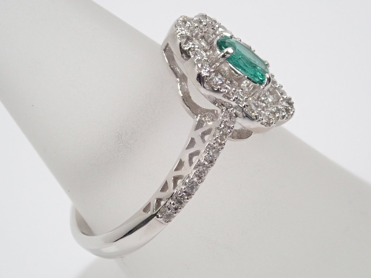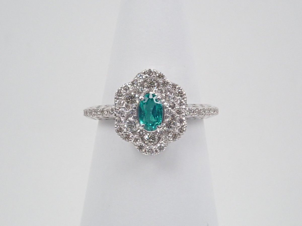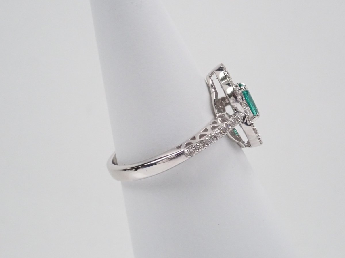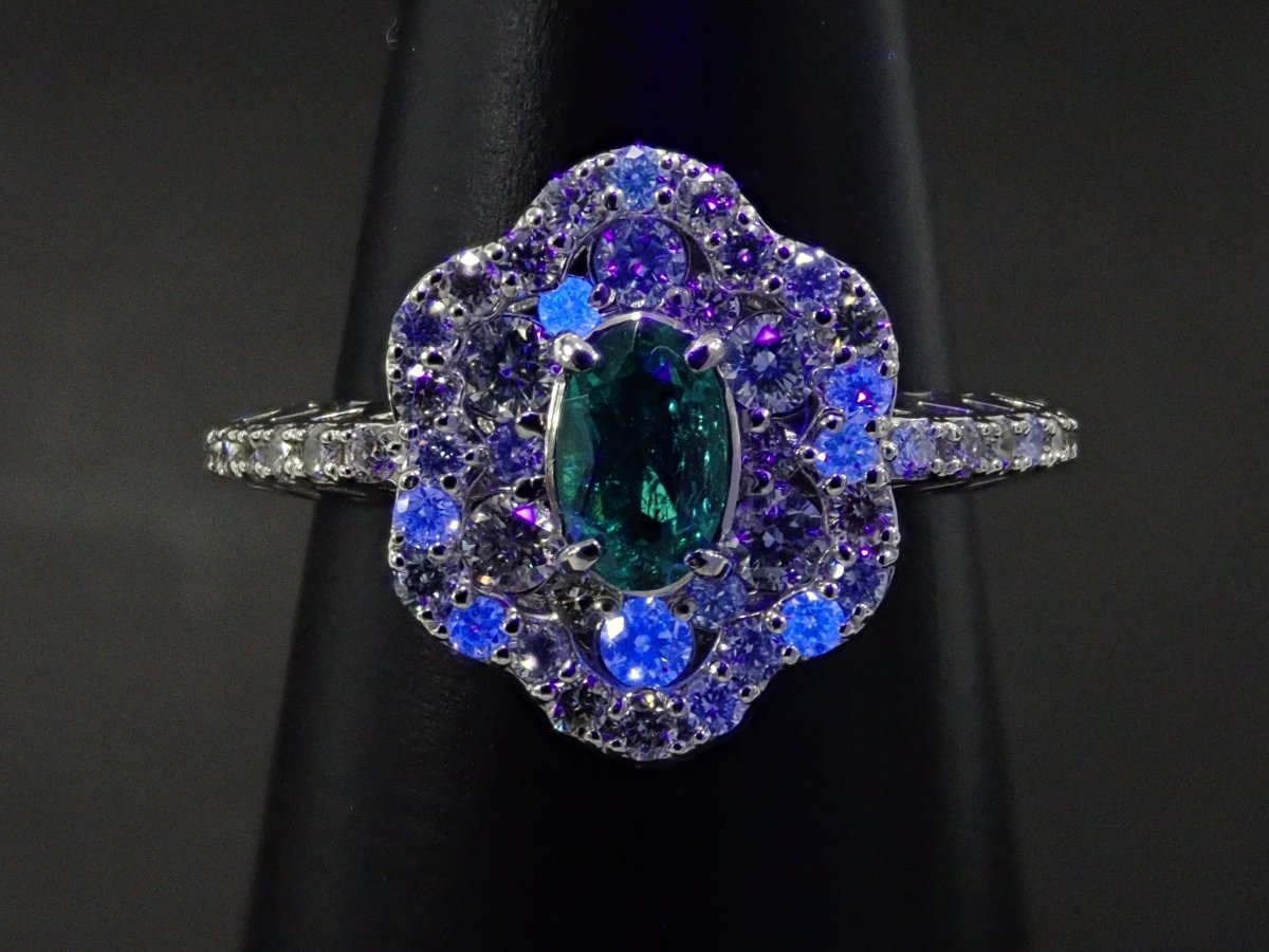 來自巴西巴塔利亞的帕拉伊巴碧璽戒指充滿水分和光澤。帕拉伊巴碧璽尺寸為 0.297 克拉,周圍環繞著透明鑽石。這款戒指的臂部設計非常注重細節,使其成為一件從任何角度看都很漂亮的迷人珠寶。附有中央寶石研究院的分析報告(銅:2.06%,錳:2.41%)。