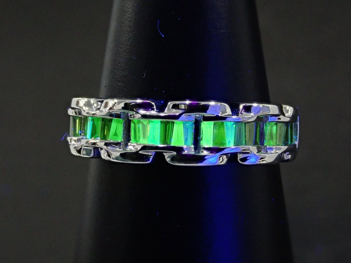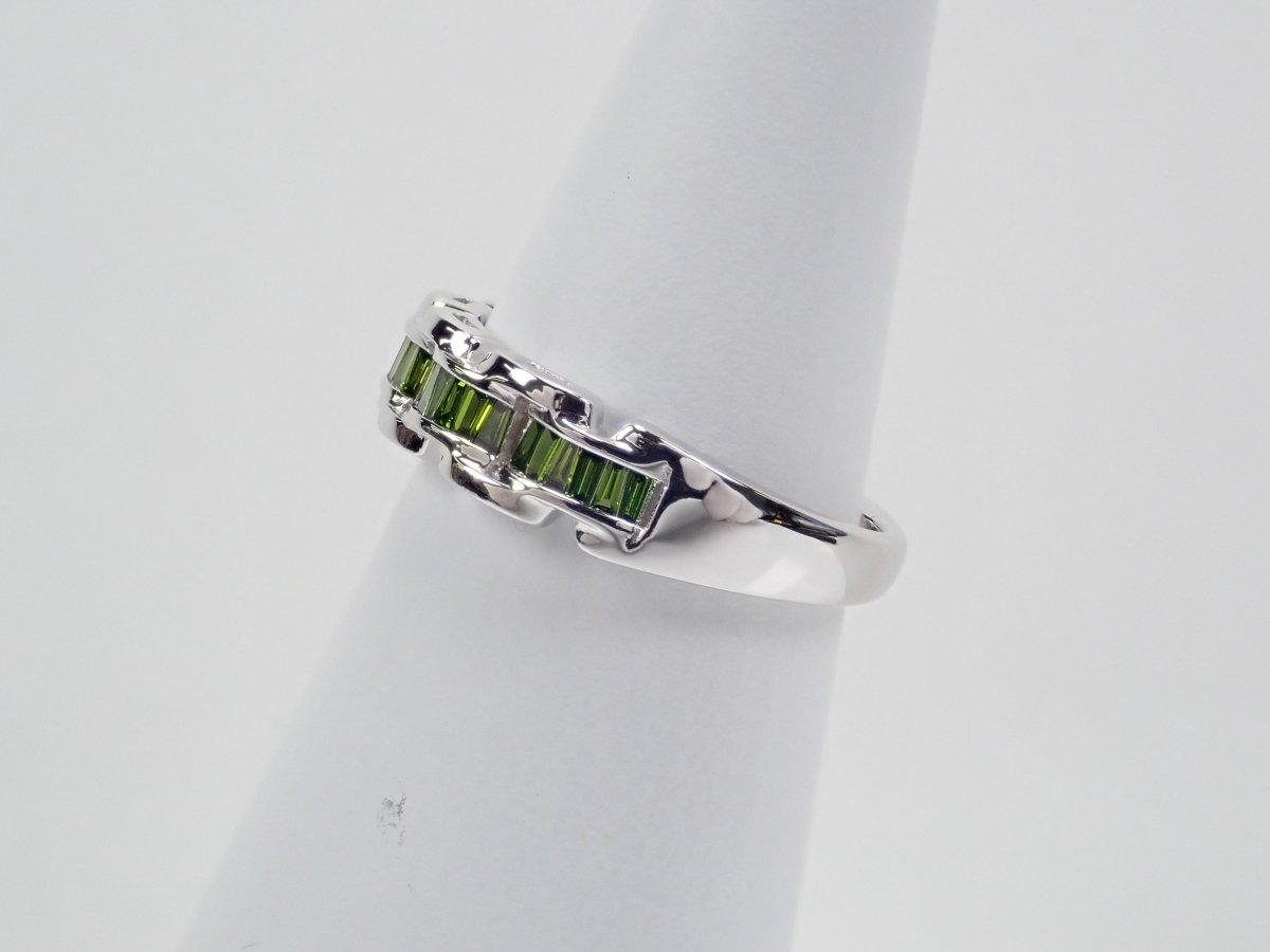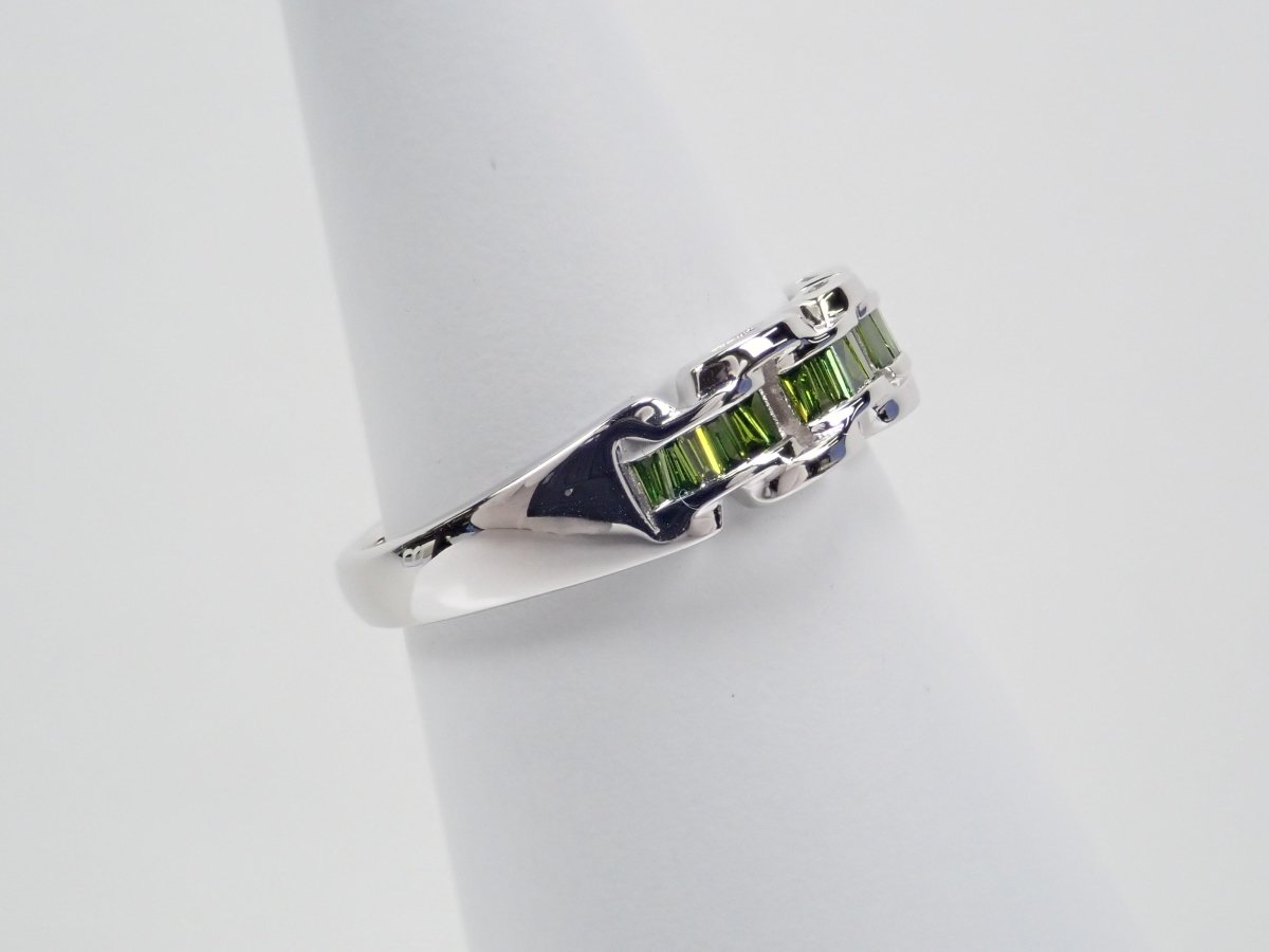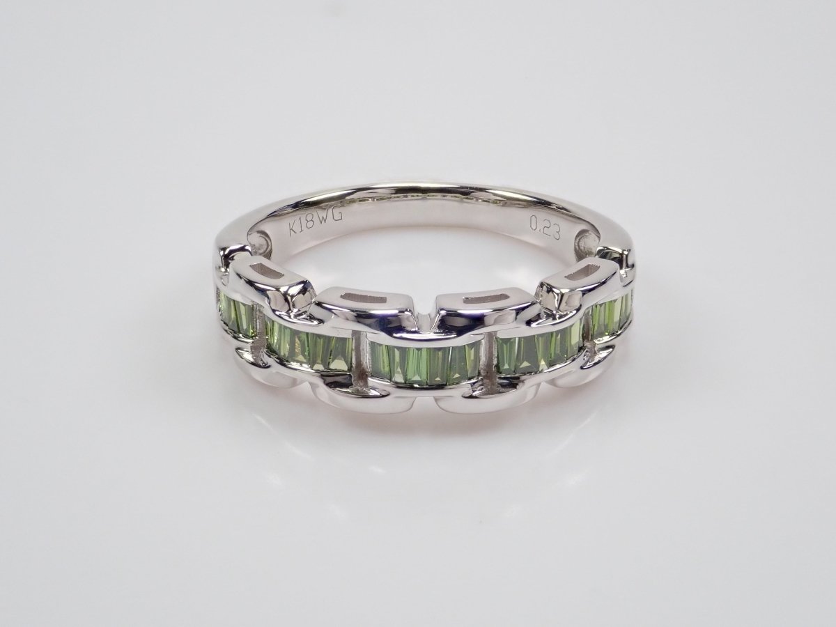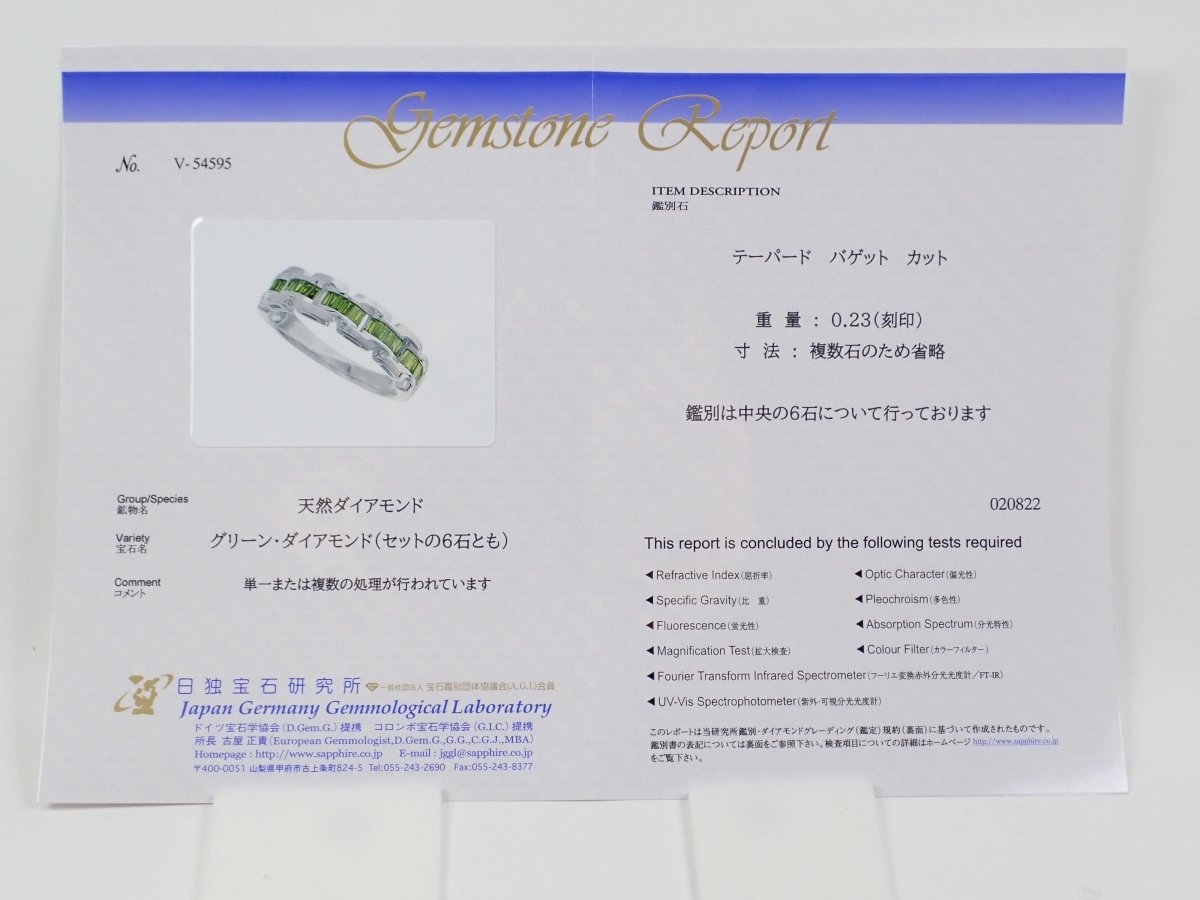 這是一顆綠色鑽石(經過處理)錐形桶形切割鑽石,流通量較小。白金戒指,奢華地裝飾著亮綠色鑽石(處理)。它是相當於VS級的鑽石,因此是一顆美麗的鑽石,透明度高,呈現清澈的綠色。還有螢光鑽石和綠色螢光鑽石,可以二次欣賞。現代的鏈條式設計也很不錯。附有日德寶石研究所頒發的鑑定證書。