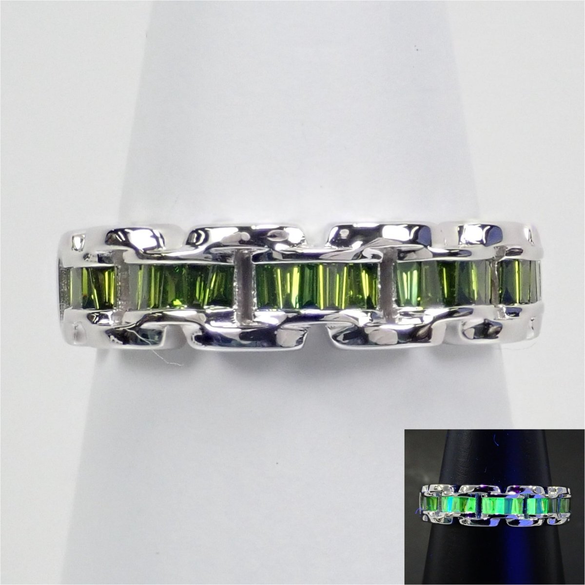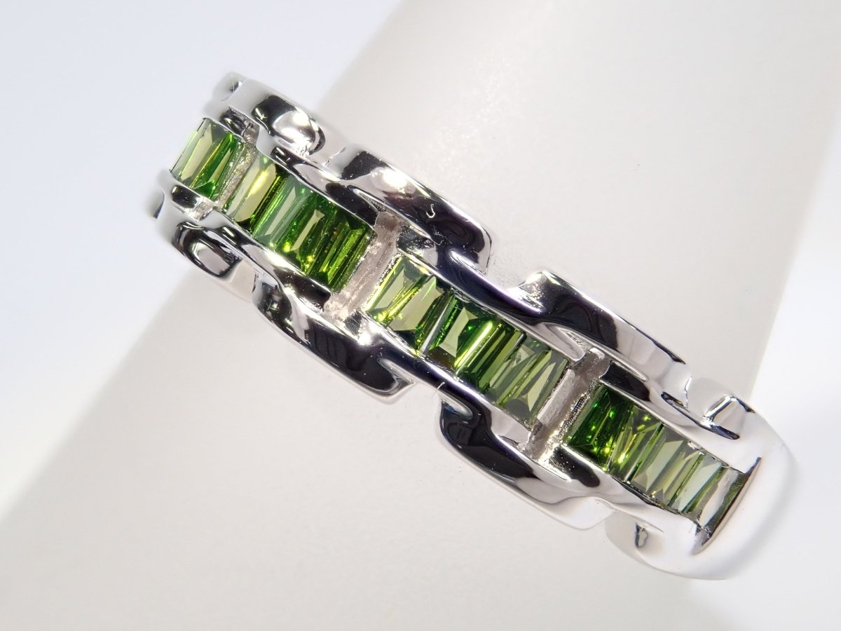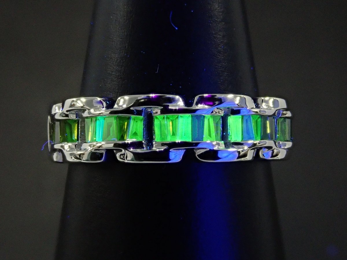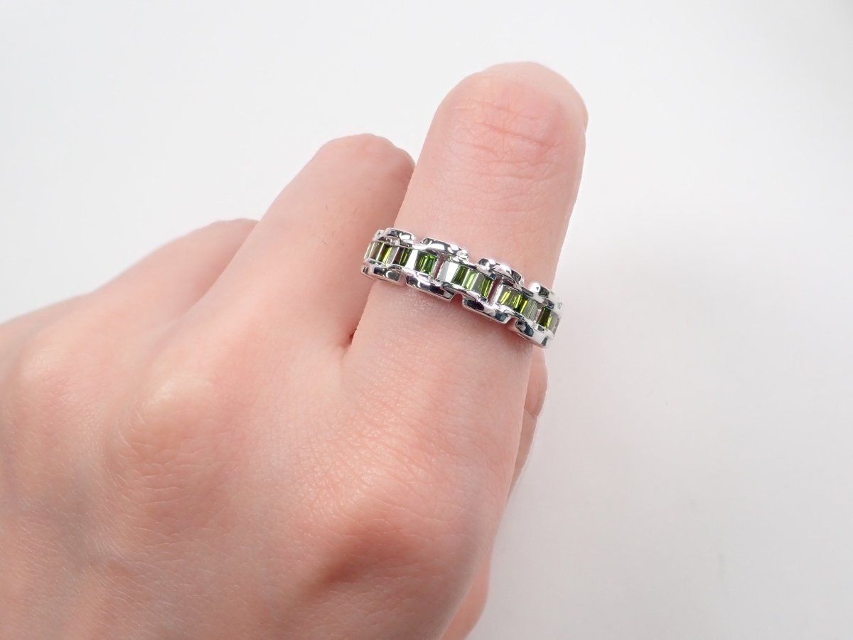 這是一顆綠色鑽石(經過處理)錐形桶形切割鑽石,流通量較小。白金戒指,奢華地裝飾著亮綠色鑽石(處理)。它是相當於VS級的鑽石,因此是一顆美麗的鑽石,透明度高,呈現清澈的綠色。還有螢光鑽石和綠色螢光鑽石,可以二次欣賞。現代的鏈條式設計也很不錯。附有日德寶石研究所頒發的鑑定證書。