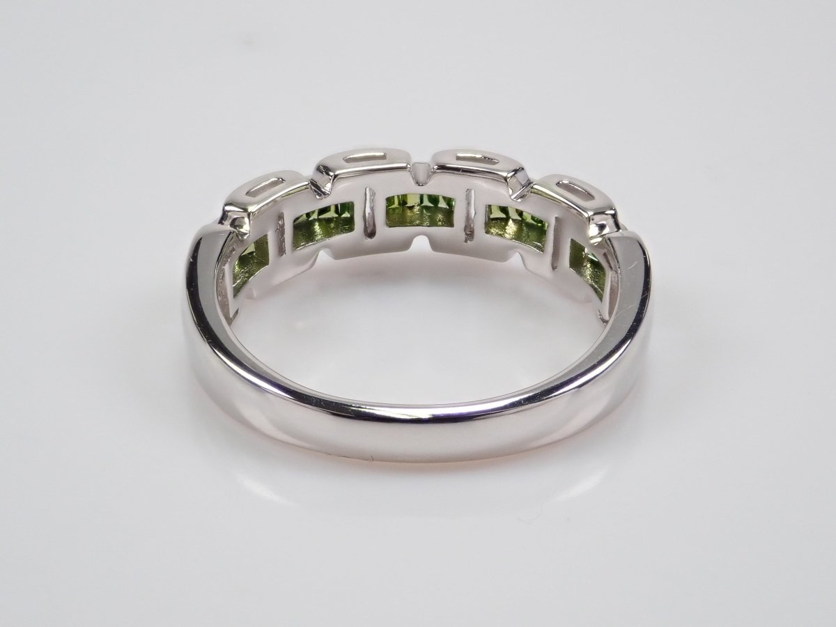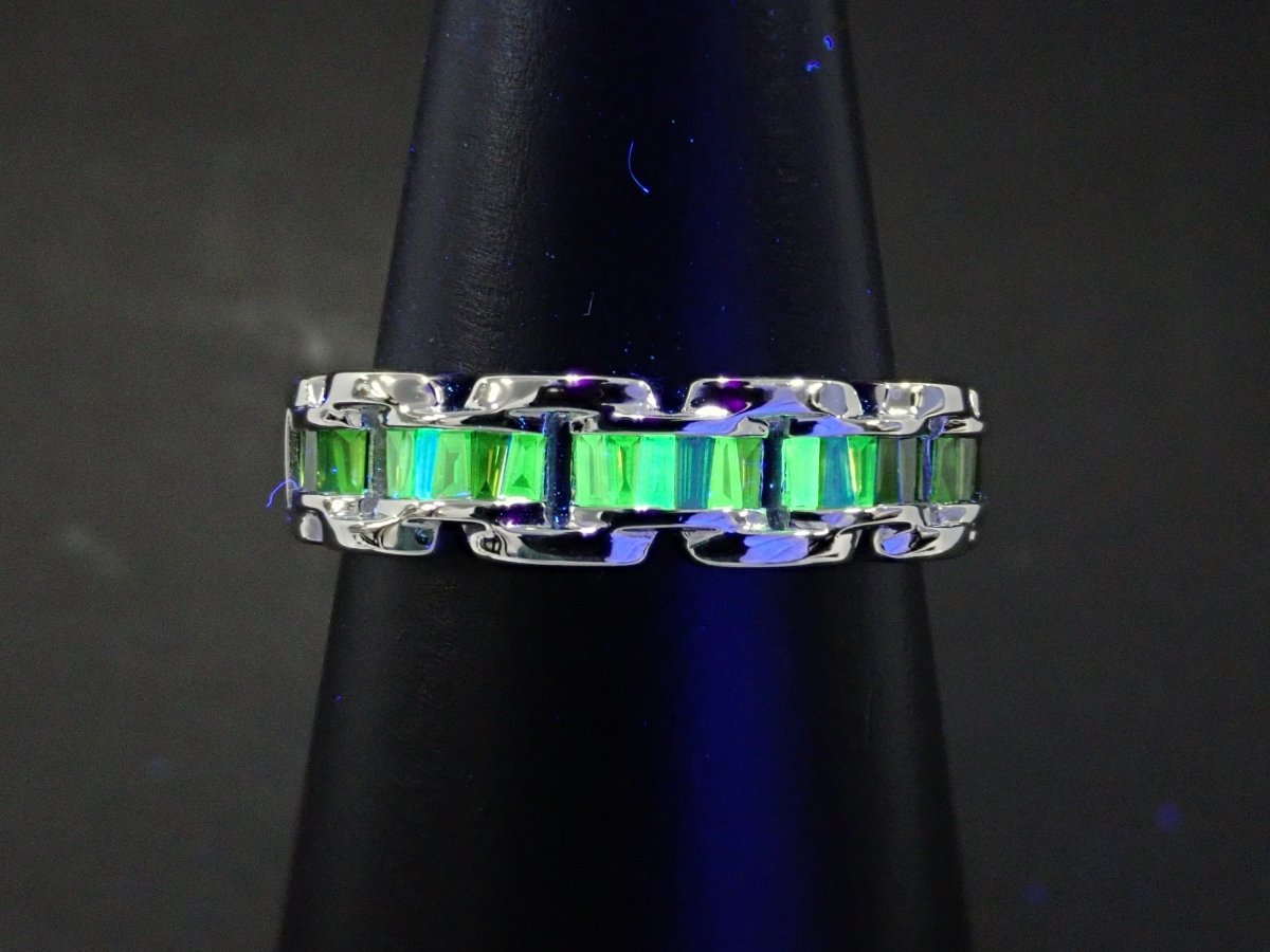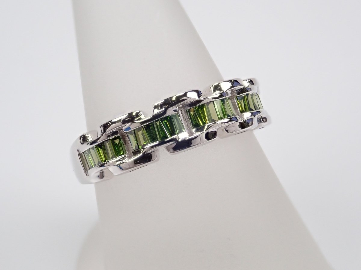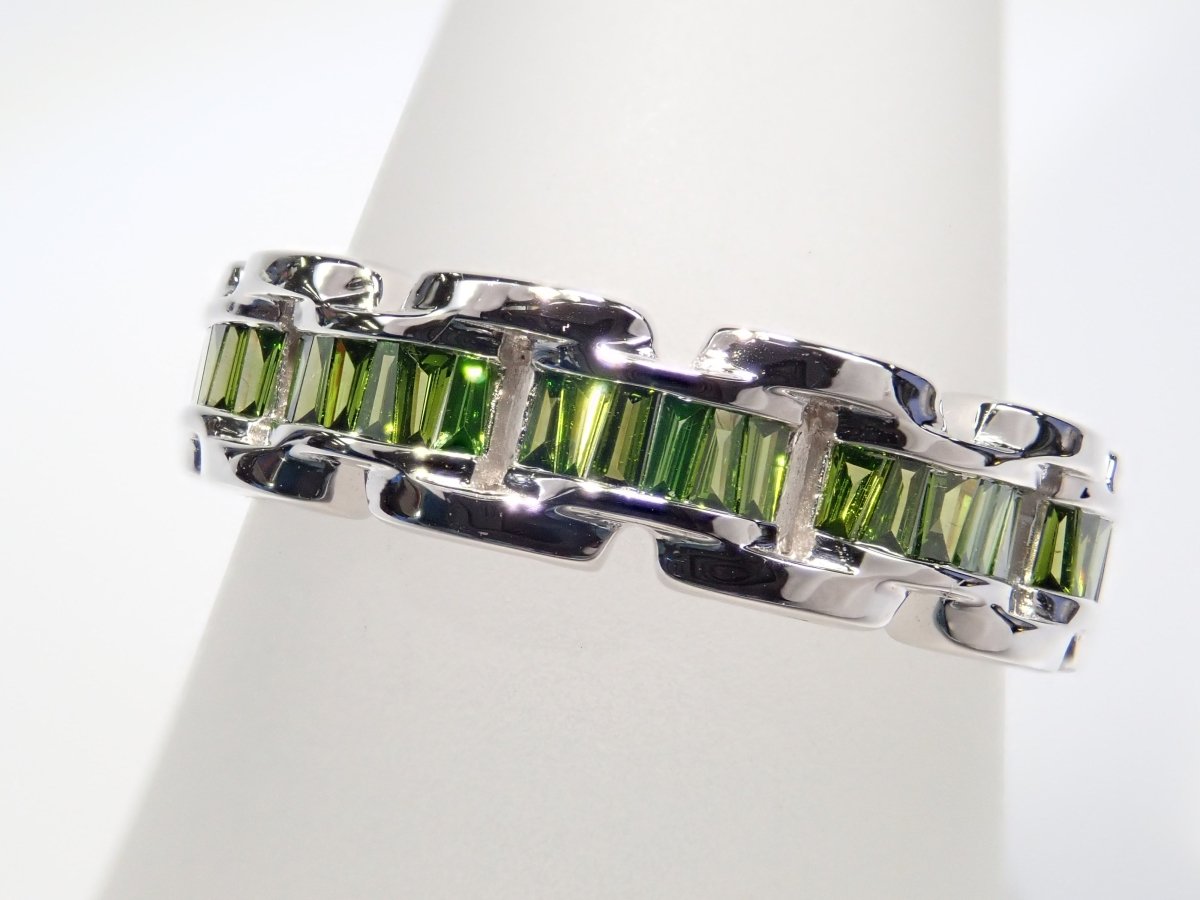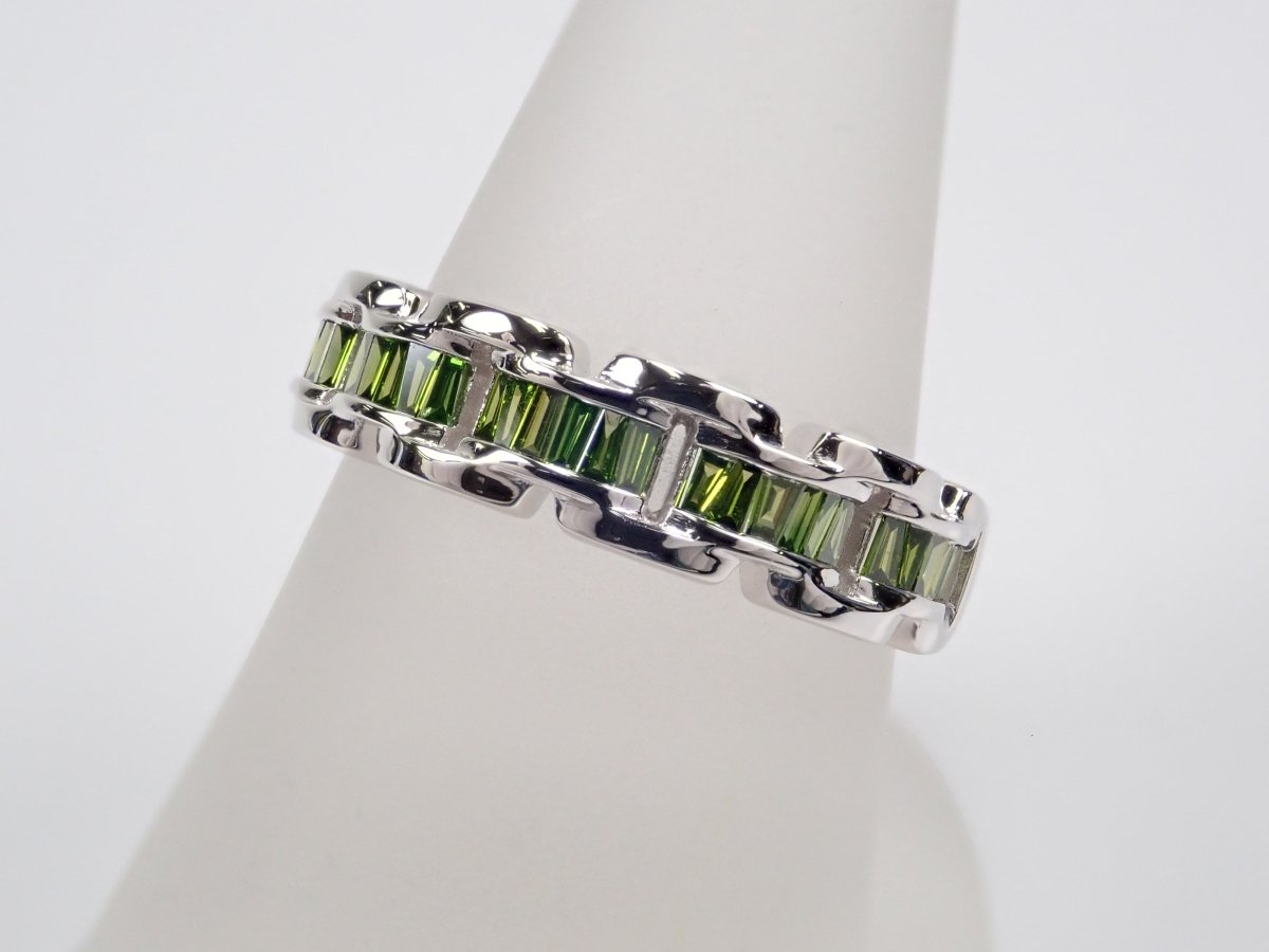 這是一顆綠色鑽石(經過處理)錐形桶形切割鑽石,流通量較小。白金戒指,奢華地裝飾著亮綠色鑽石(處理)。它是相當於VS級的鑽石,因此是一顆美麗的鑽石,透明度高,呈現清澈的綠色。還有螢光鑽石和綠色螢光鑽石,可以二次欣賞。現代的鏈條式設計也很不錯。附有日德寶石研究所頒發的鑑定證書。