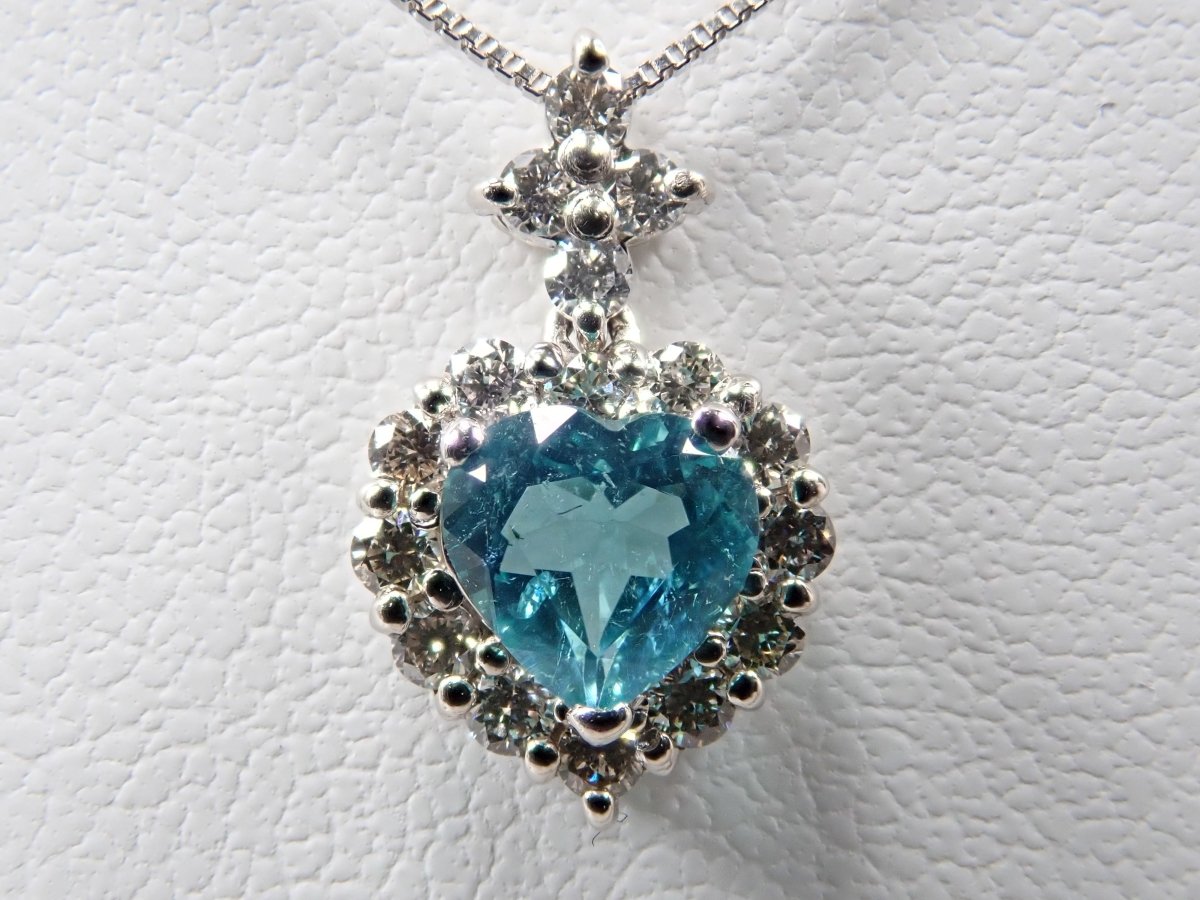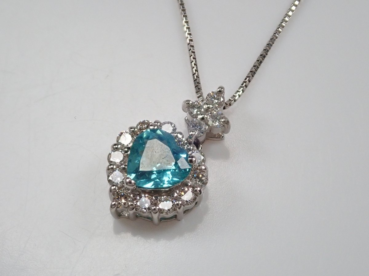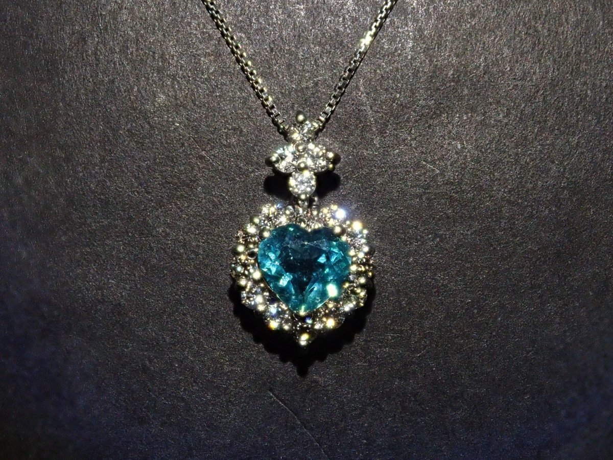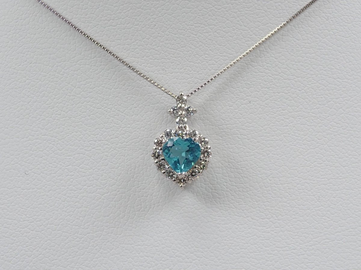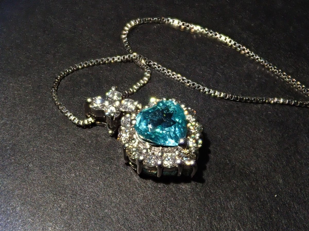 美麗的藍色帕拉伊巴碧璽,看起來就像晴朗的天空。重 0.43 克拉,這種透明度和心形非常有價值。這是一個可愛的設計,使用適合高品質帕拉伊巴碧璽的 VS 至 SI 級美麗鑽石,並由心形框架包圍。這個有一條鍊子。 帕拉伊巴碧璽含 CuO:0.2%,MnO:1.9%。包括來自珠寶和貴金屬協會的分類資訊。