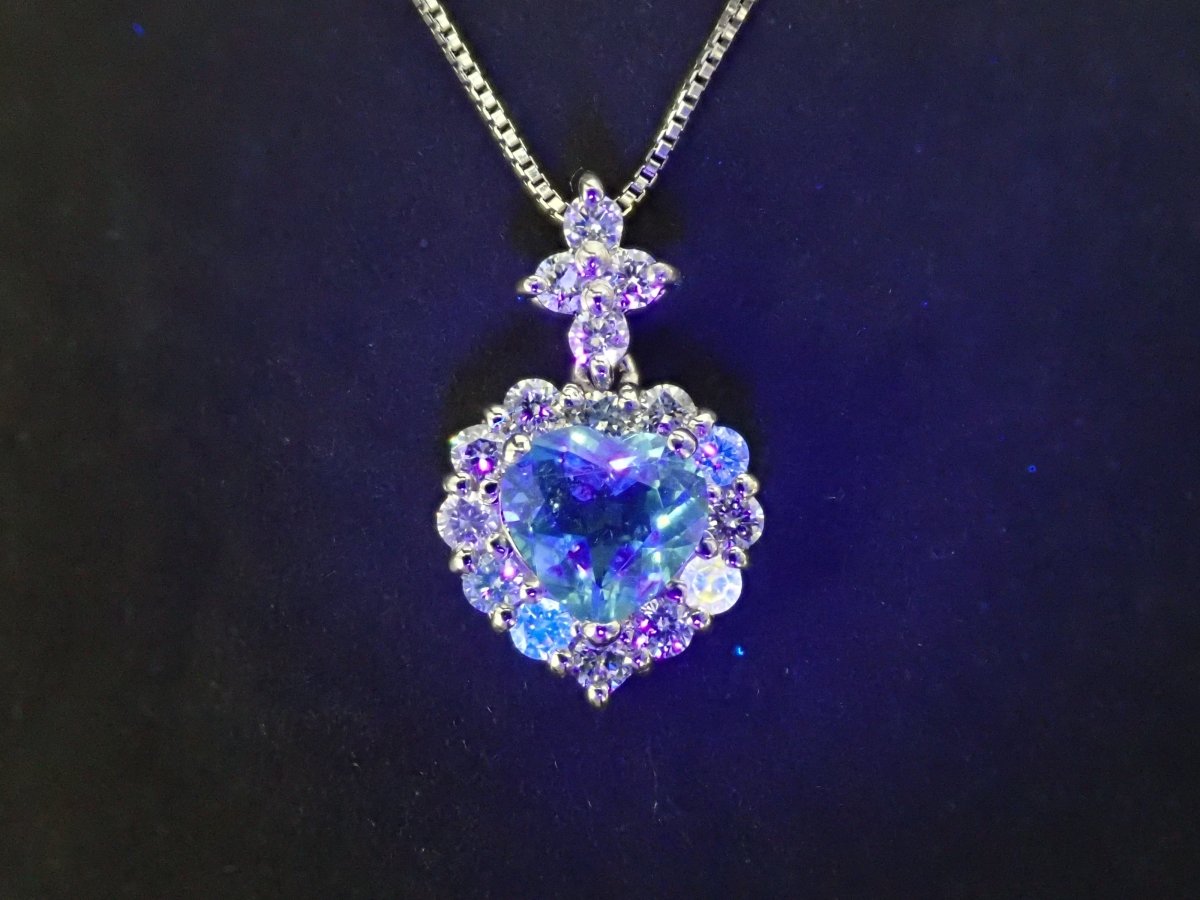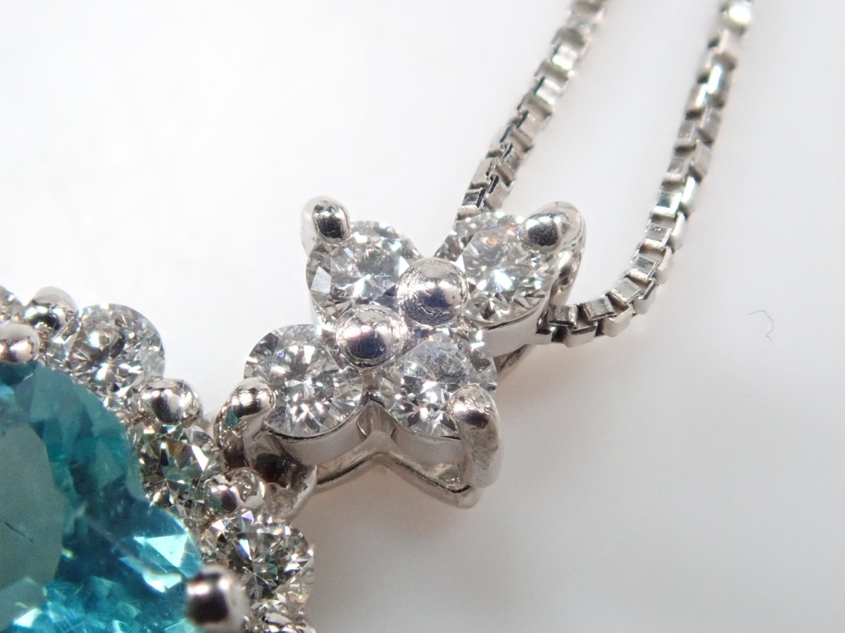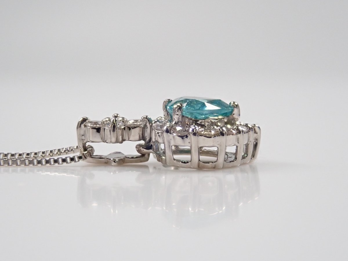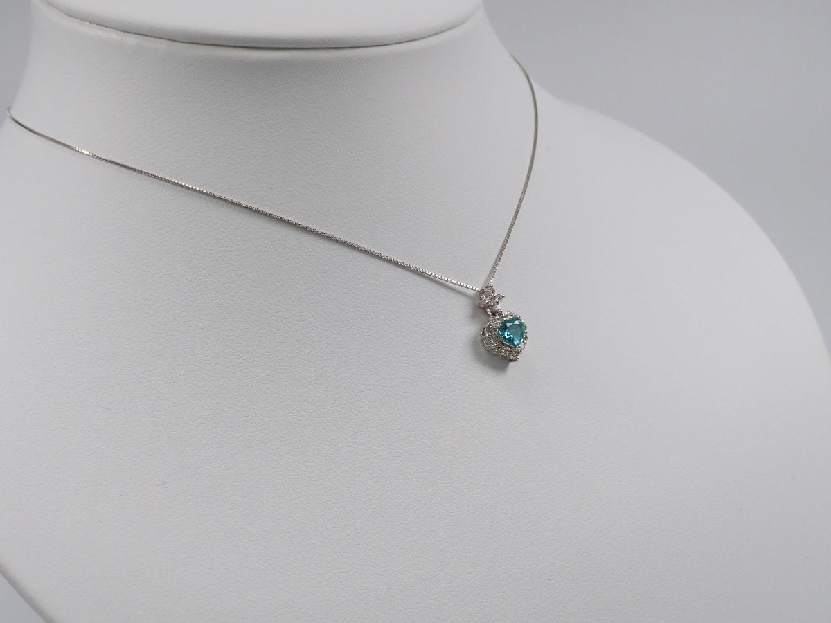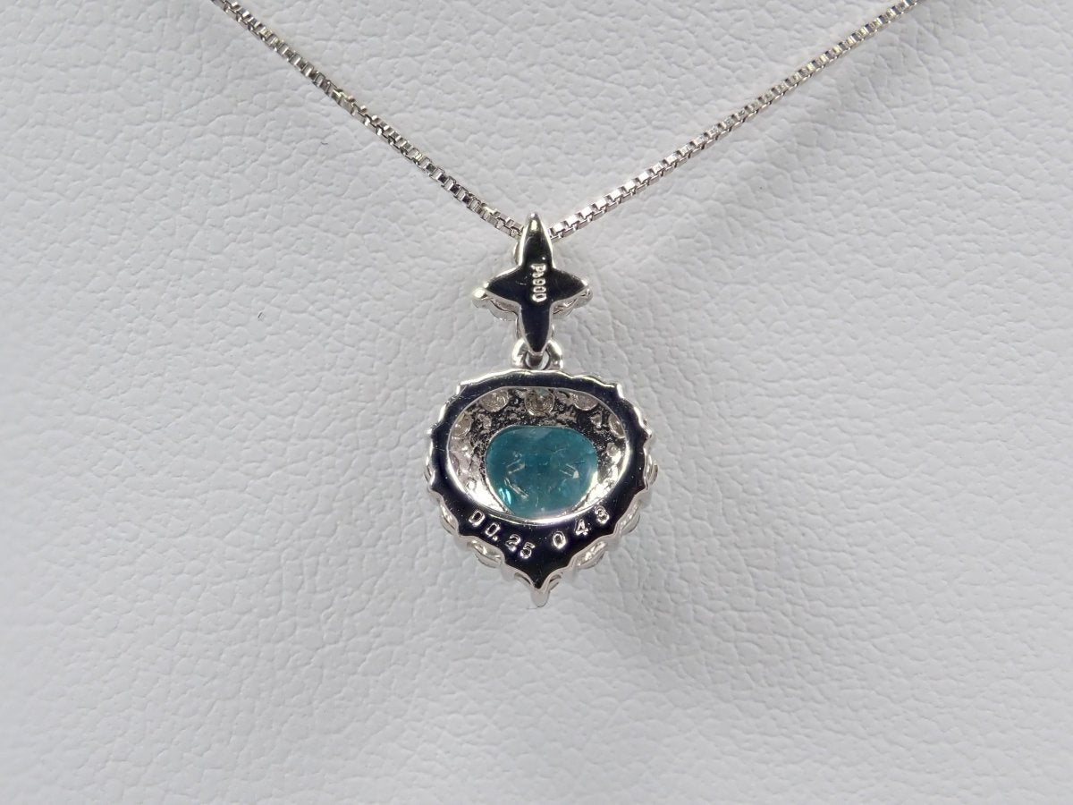 美麗的藍色帕拉伊巴碧璽,看起來就像晴朗的天空。重 0.43 克拉,這種透明度和心形非常有價值。這是一個可愛的設計,使用適合高品質帕拉伊巴碧璽的 VS 至 SI 級美麗鑽石,並由心形框架包圍。這個有一條鍊子。 帕拉伊巴碧璽含 CuO:0.2%,MnO:1.9%。包括來自珠寶和貴金屬協會的分類資訊。
