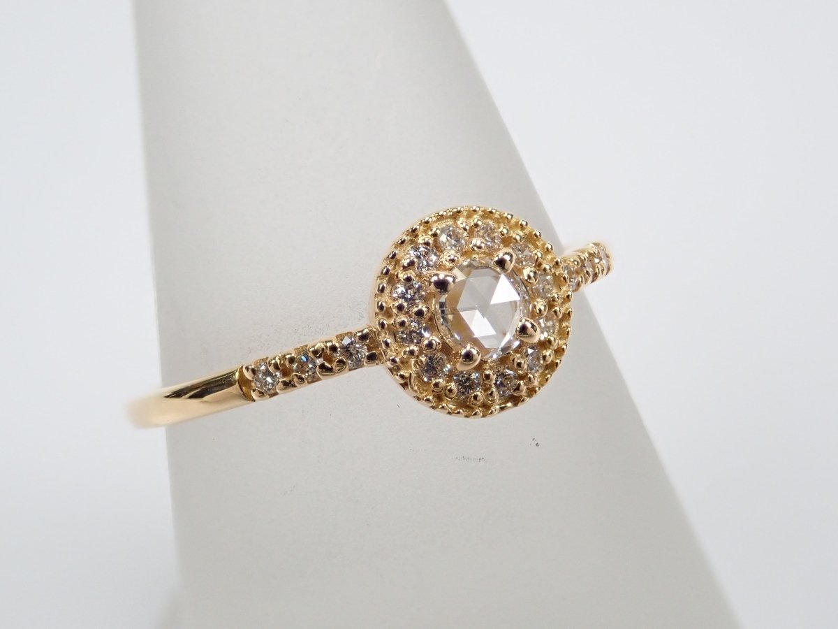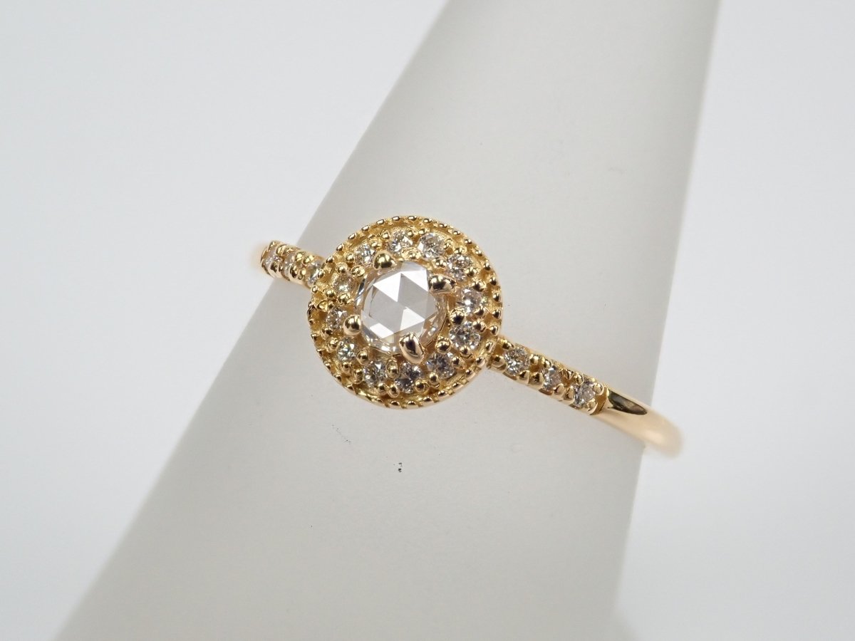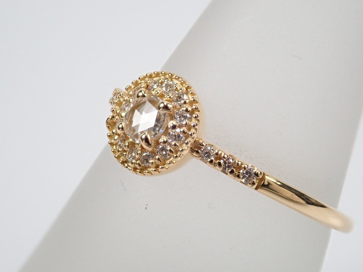 大家都知道的鑽石。很多人都被它的美麗所吸引。主石為玫瑰切割工,可以感受到鑽石的透明度和古董感。週邊飾以米粒鑽,讓您享受鑽石的光澤、透明度和魅力。纖細的線條凸顯寶石之美。