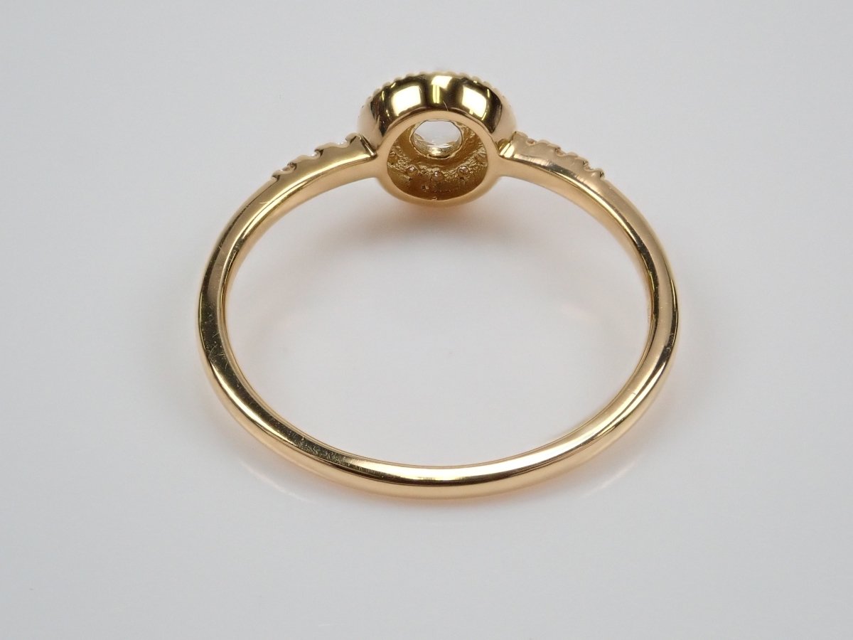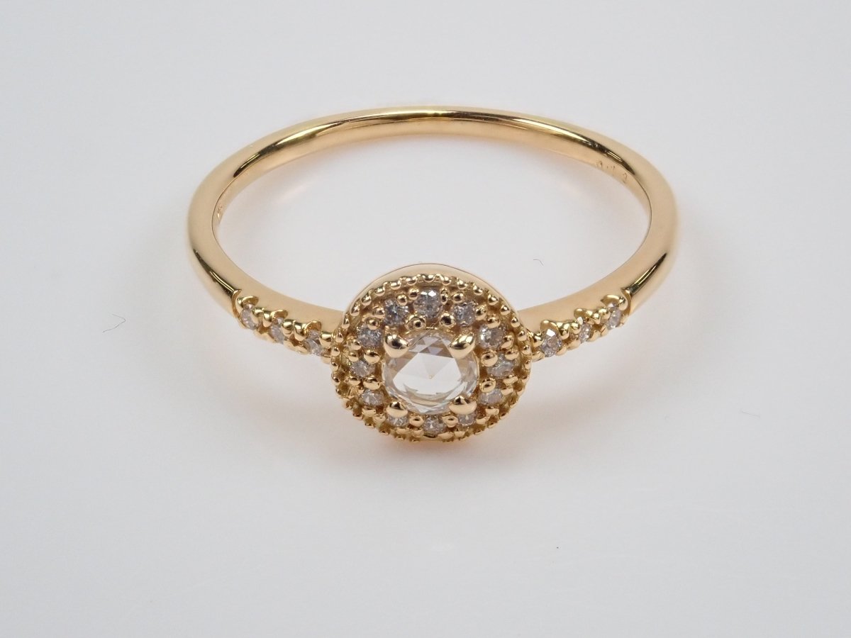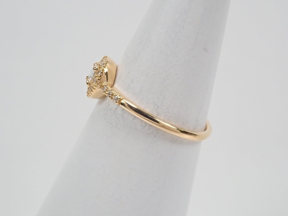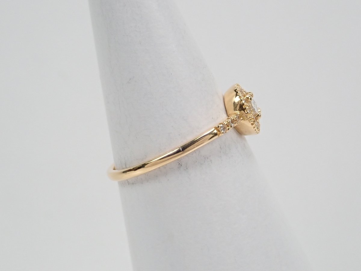 大家都知道的鑽石。很多人都被它的美麗所吸引。主石為玫瑰切割工,可以感受到鑽石的透明度和古董感。週邊飾以米粒鑽,讓您享受鑽石的光澤、透明度和魅力。纖細的線條凸顯寶石之美。