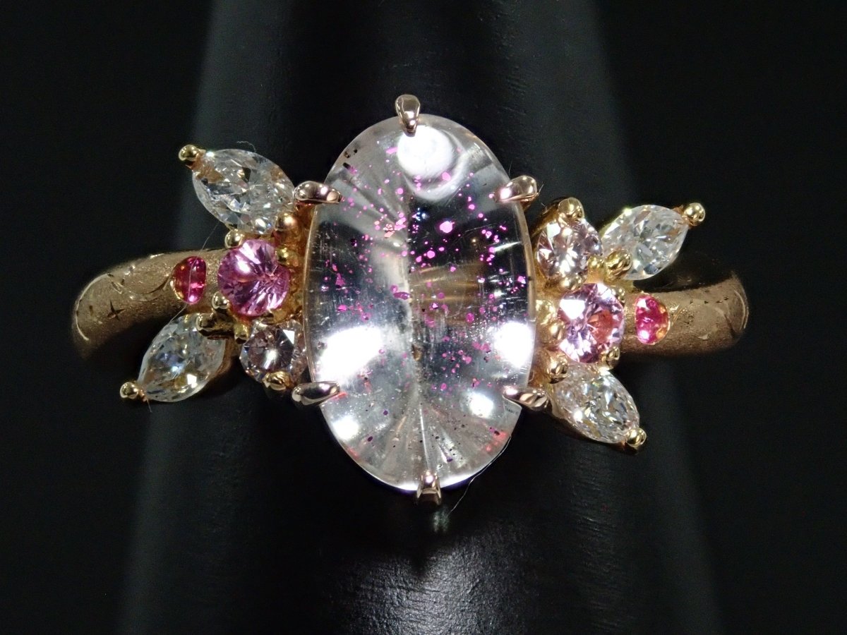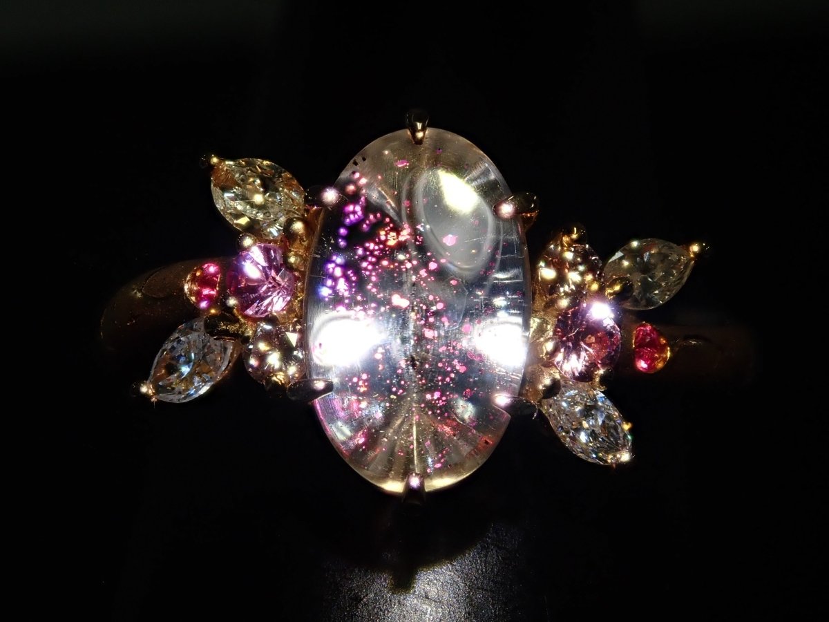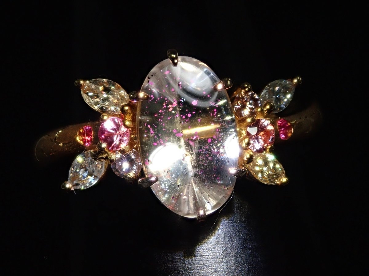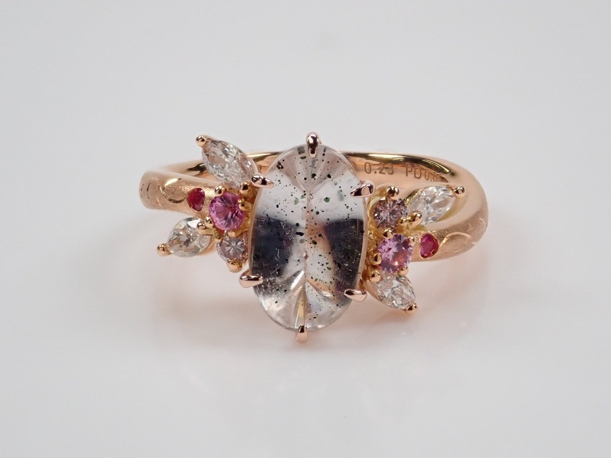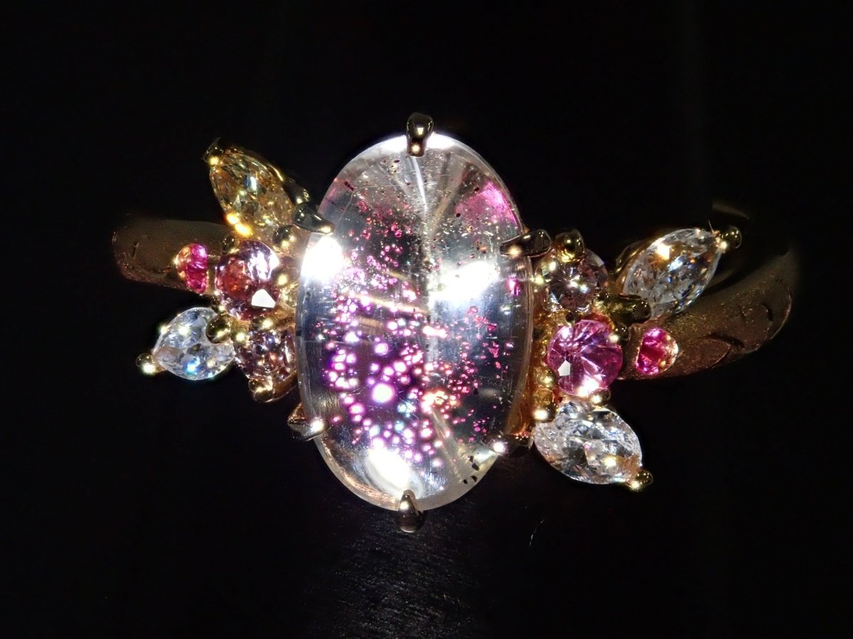 一枚鑲有 Tinkerbell 石英的戒指。這件作品由卡拉茨的設計師瓦穆 (Wamu) 監製,其側石像羽毛一樣圍繞著中間的石頭。 Inkerbell 石英閃閃發光,彷彿著了魔。這是一枚夢幻般的戒指,周圍環繞著粉紅色藍寶石和粉紅色鑽石。