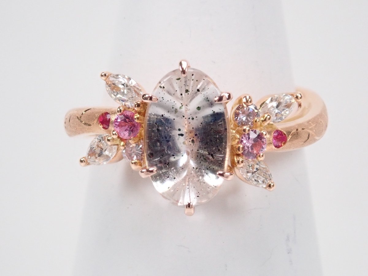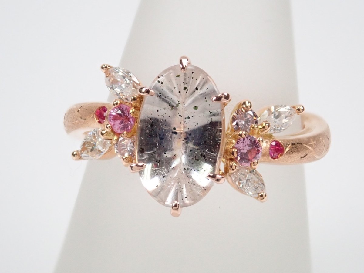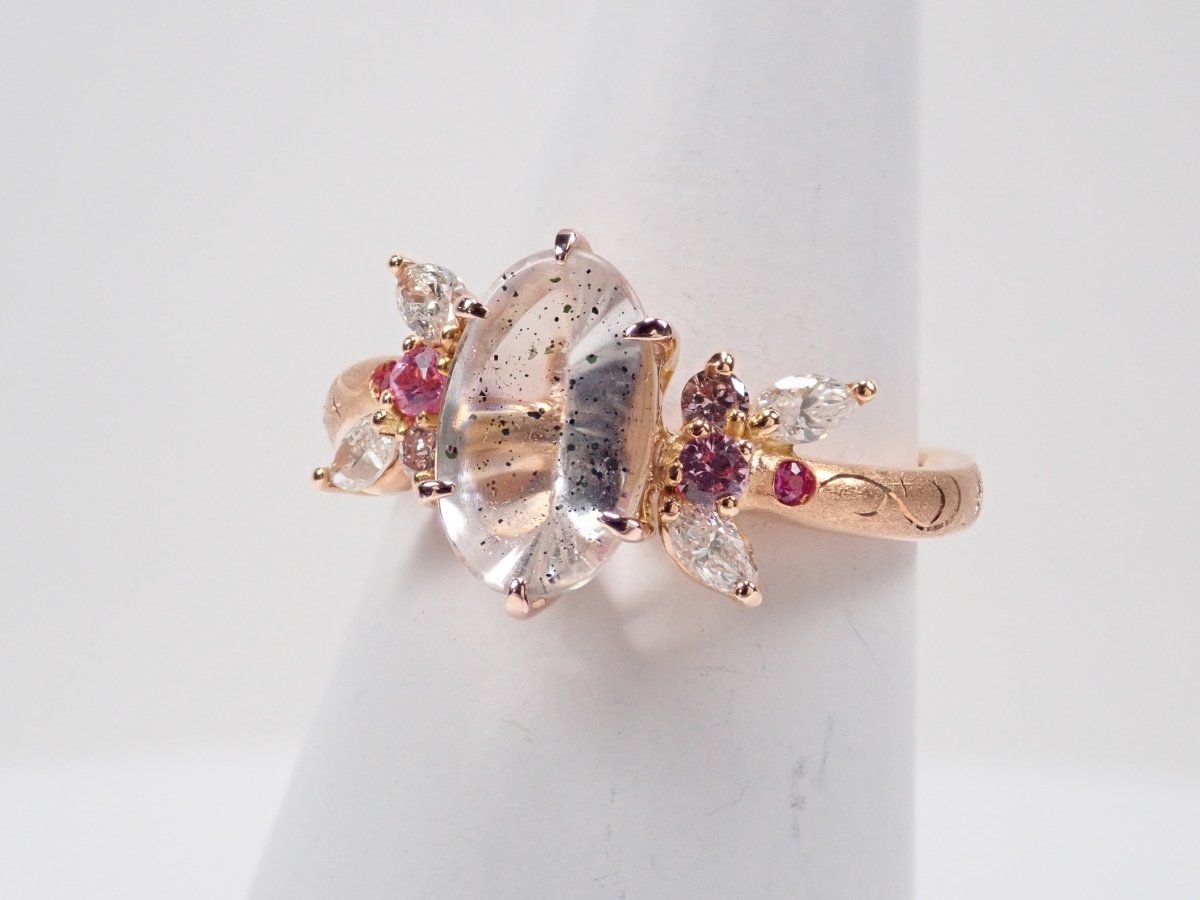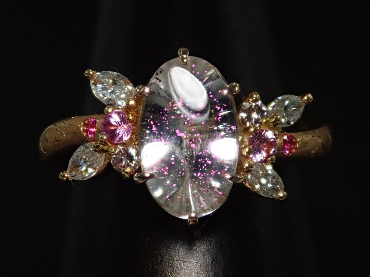 一枚鑲有 Tinkerbell 石英的戒指。這件作品由卡拉茨的設計師瓦穆 (Wamu) 監製,其側石像羽毛一樣圍繞著中間的石頭。 Inkerbell 石英閃閃發光,彷彿著了魔。這是一枚夢幻般的戒指,周圍環繞著粉紅色藍寶石和粉紅色鑽石。
