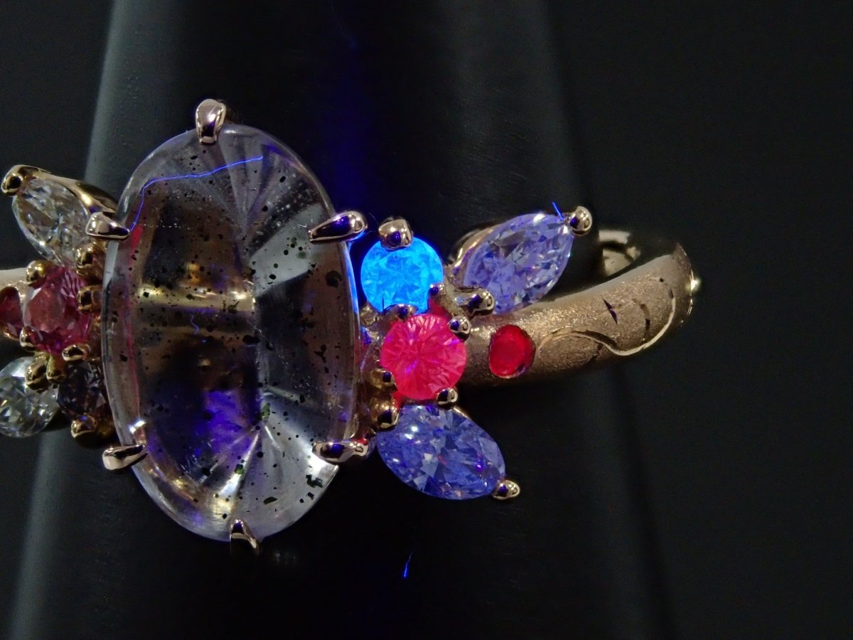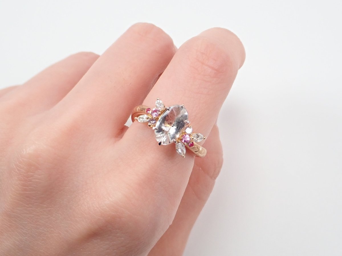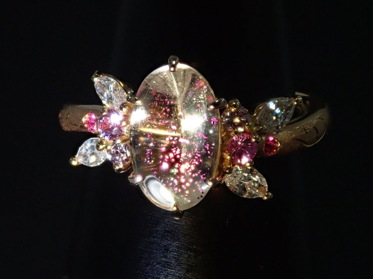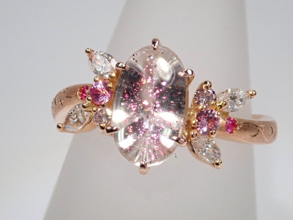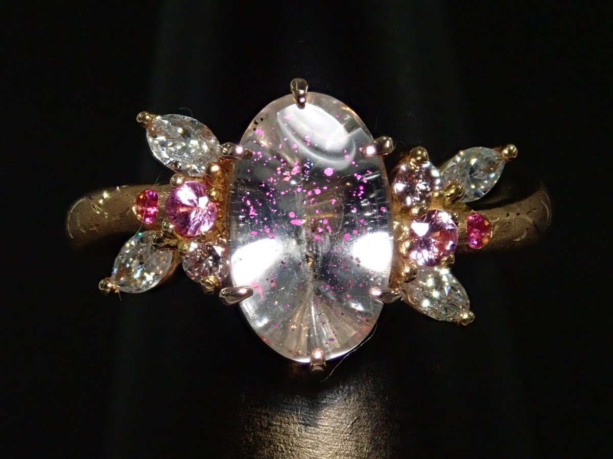 一枚鑲有 Tinkerbell 石英的戒指。這件作品由卡拉茨的設計師瓦穆 (Wamu) 監製,其側石像羽毛一樣圍繞著中間的石頭。 Inkerbell 石英閃閃發光,彷彿著了魔。這是一枚夢幻般的戒指,周圍環繞著粉紅色藍寶石和粉紅色鑽石。
