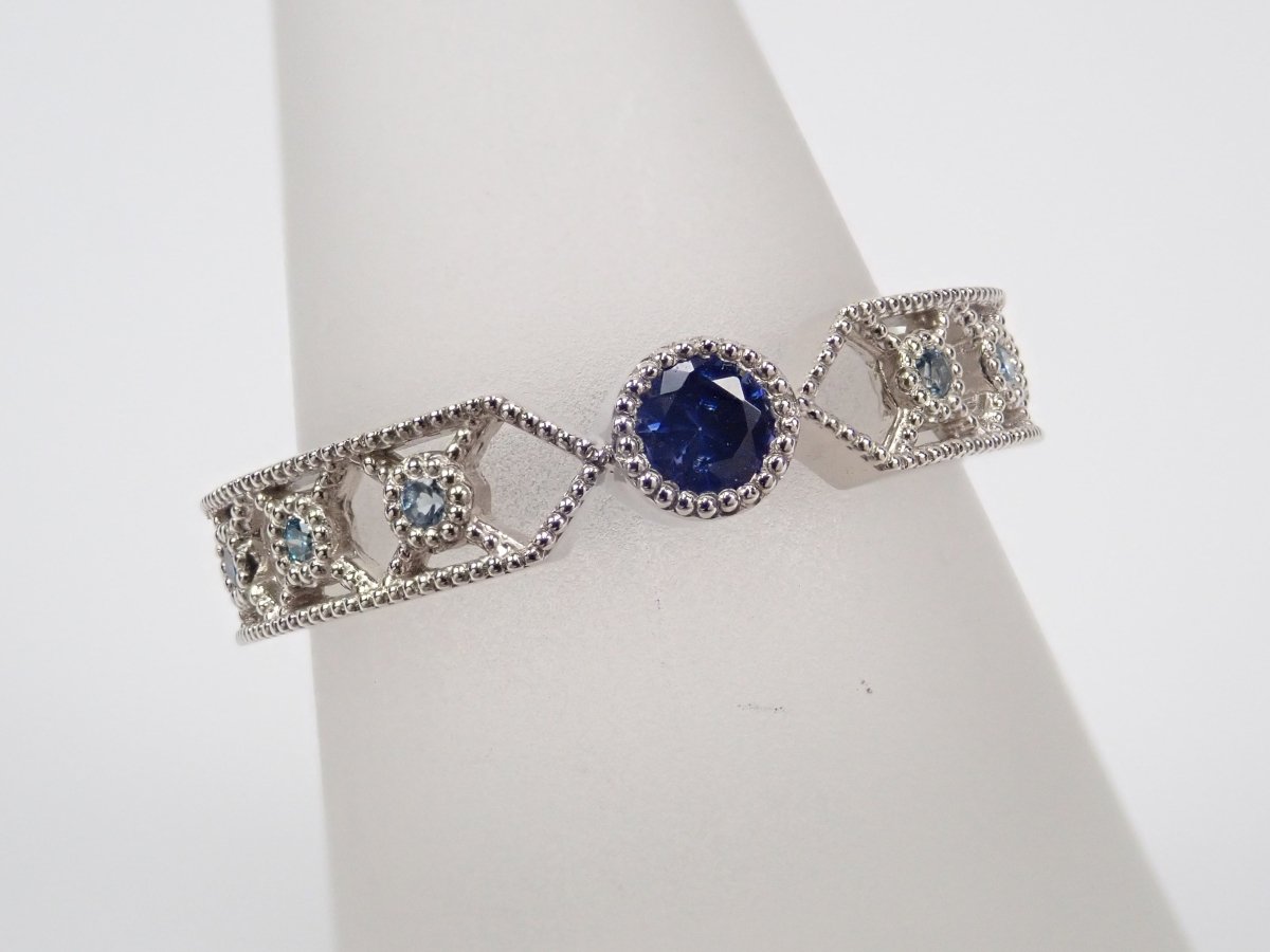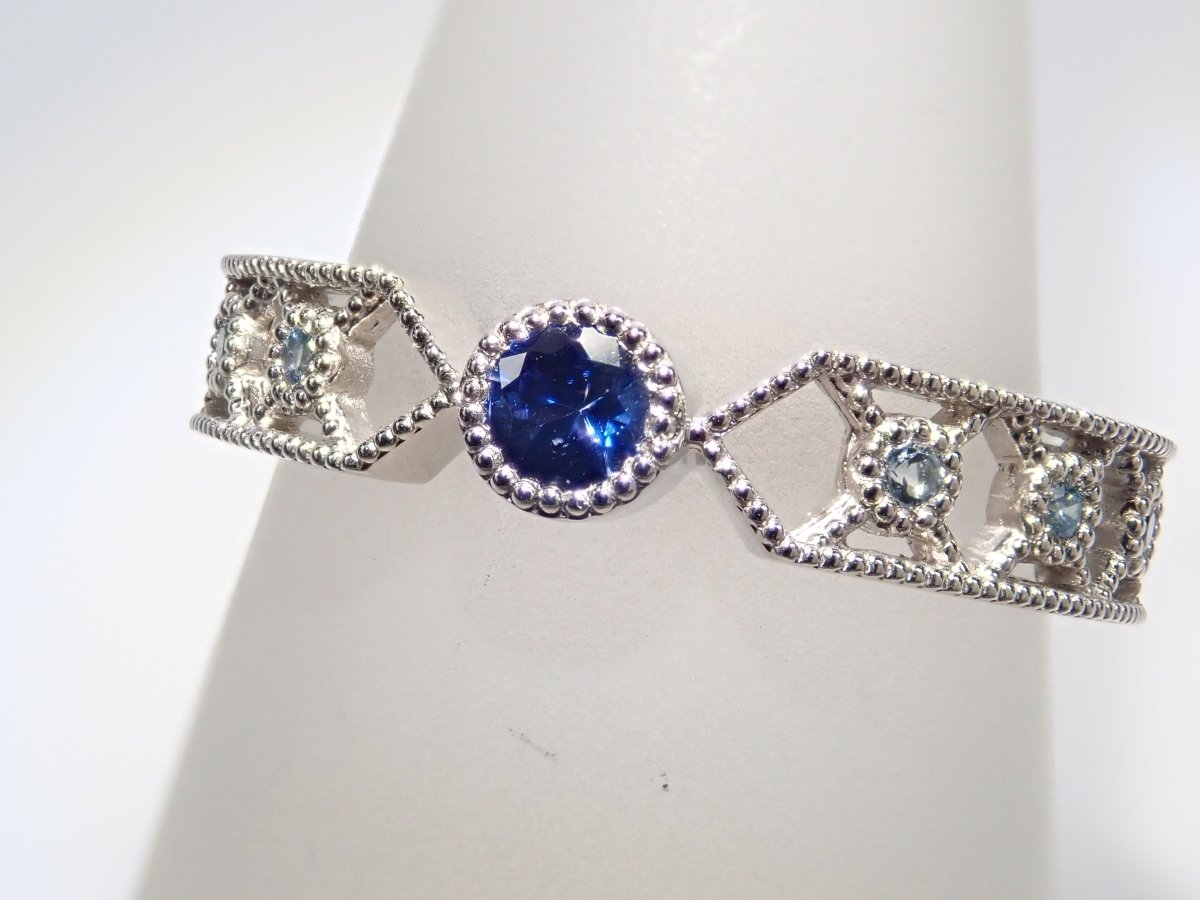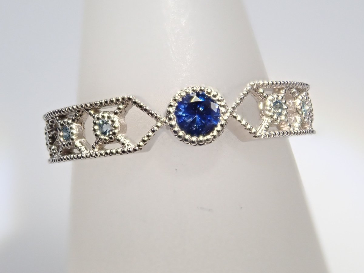 這枚戒指由藍錐礦製成,藍錐礦是美國三種稀有寶石之一。副石為海藍寶石和處理色藍鑽,統一為藍色,看起來很美妙。每顆寶石都經過精心打磨,佩戴時可以清楚地看到您的手指,使其成為一款輕盈、令人賞心悅目的戒指,而且不會太重。