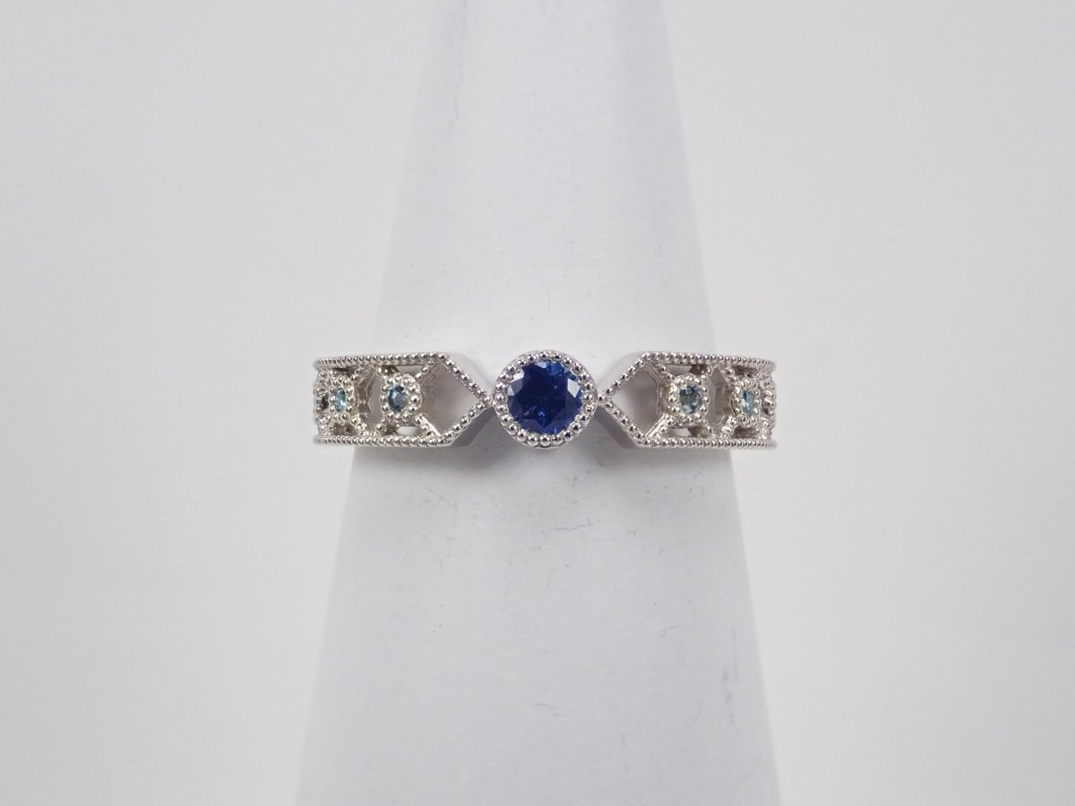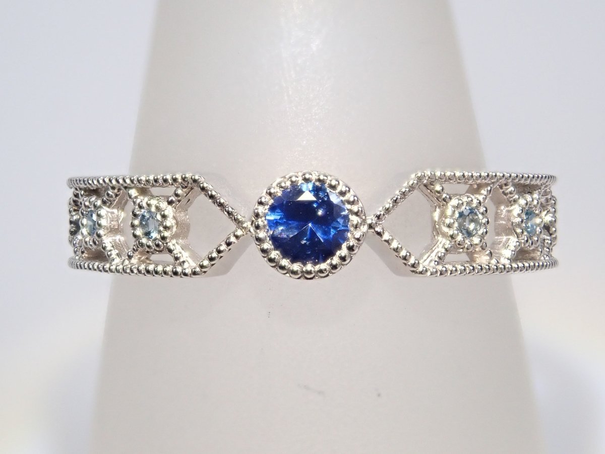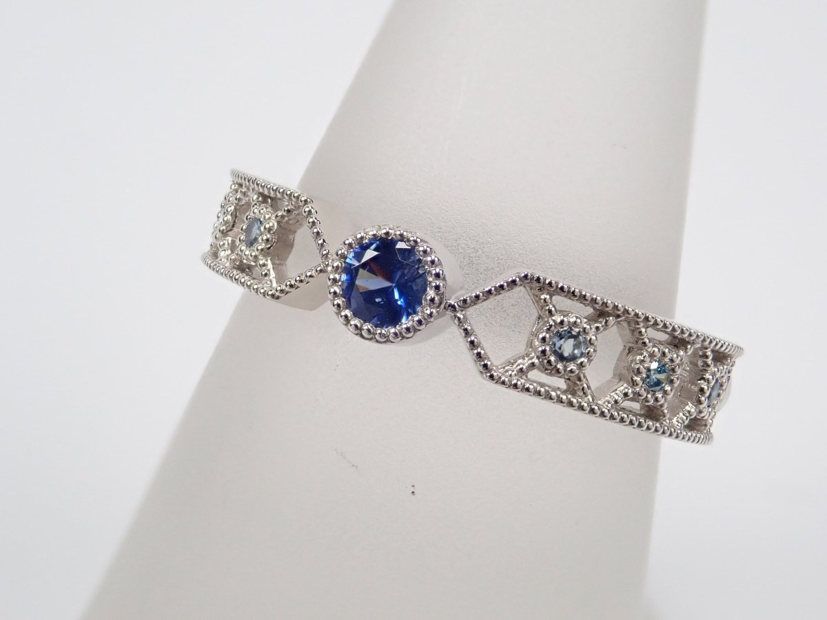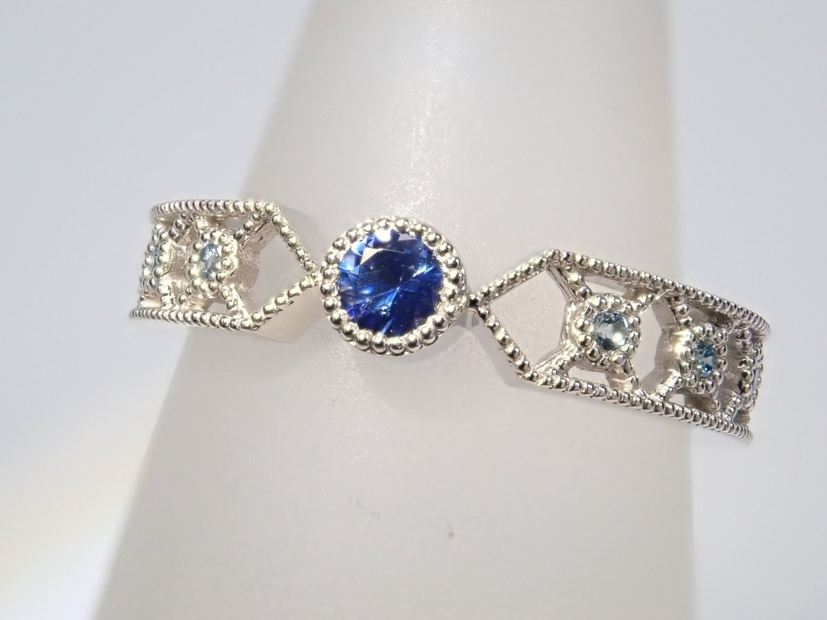 這枚戒指由藍錐礦製成,藍錐礦是美國三種稀有寶石之一。副石為海藍寶石和處理色藍鑽,統一為藍色,看起來很美妙。每顆寶石都經過精心打磨,佩戴時可以清楚地看到您的手指,使其成為一款輕盈、令人賞心悅目的戒指,而且不會太重。
