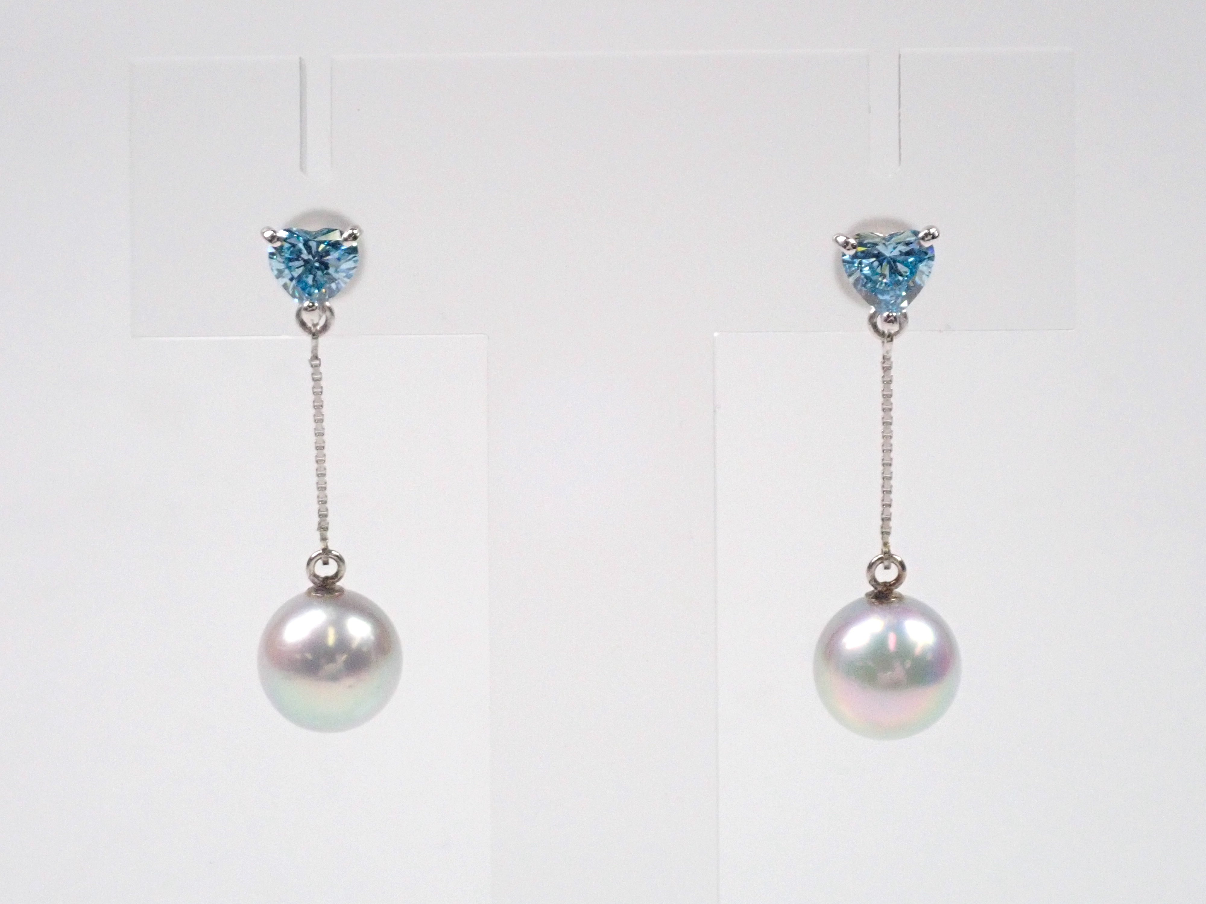 鑽石 x Akoya 珍珠耳環。每顆心形鑽石的尺寸高達 0.3 克拉以上,令人印象深刻。製作得非常豪華。 (鑽石的藍色為處理色。)珍珠是美麗的珍珠,散發著明亮的光澤,鍊子末端搖曳的優雅設計極具吸引力。