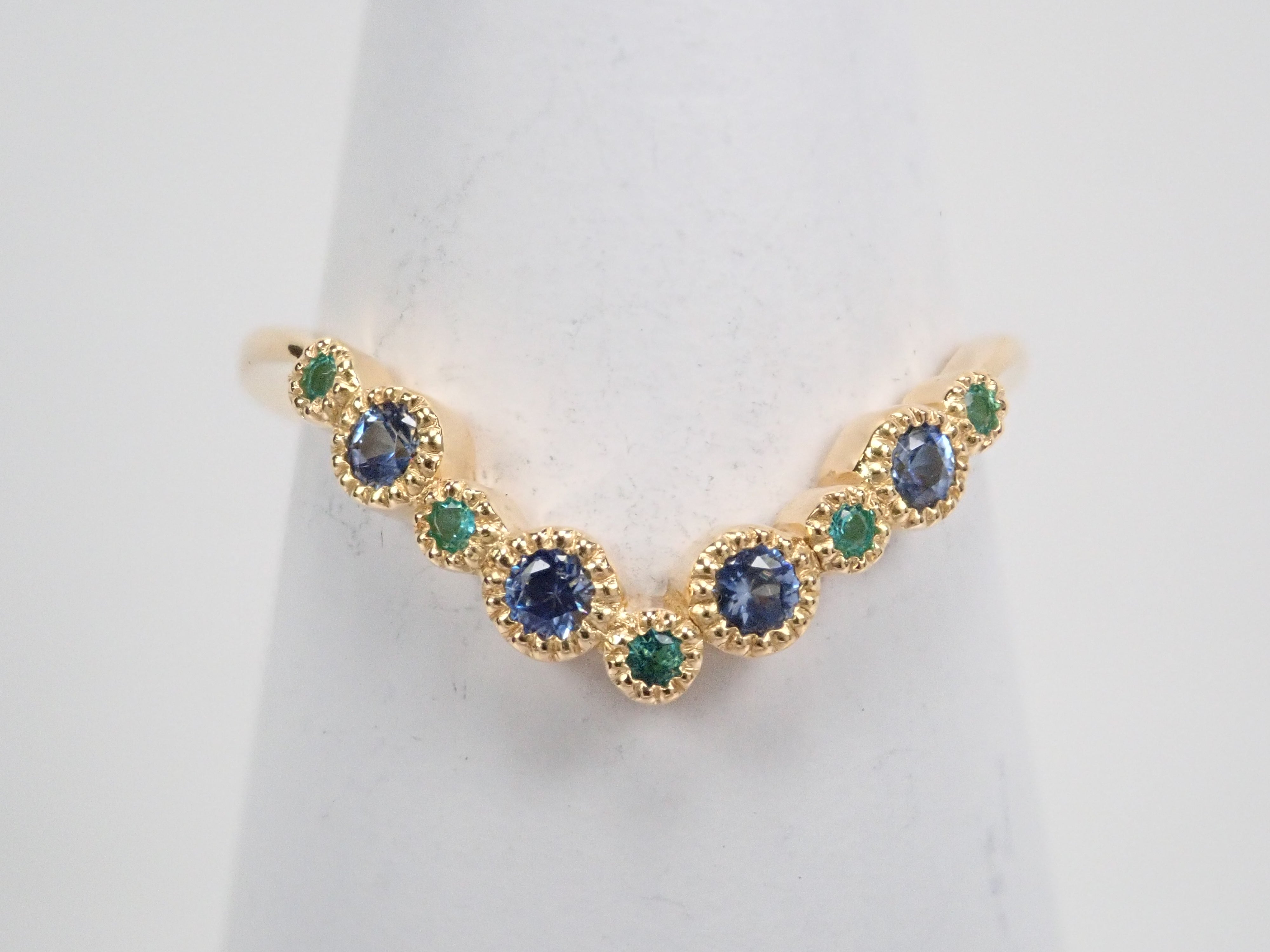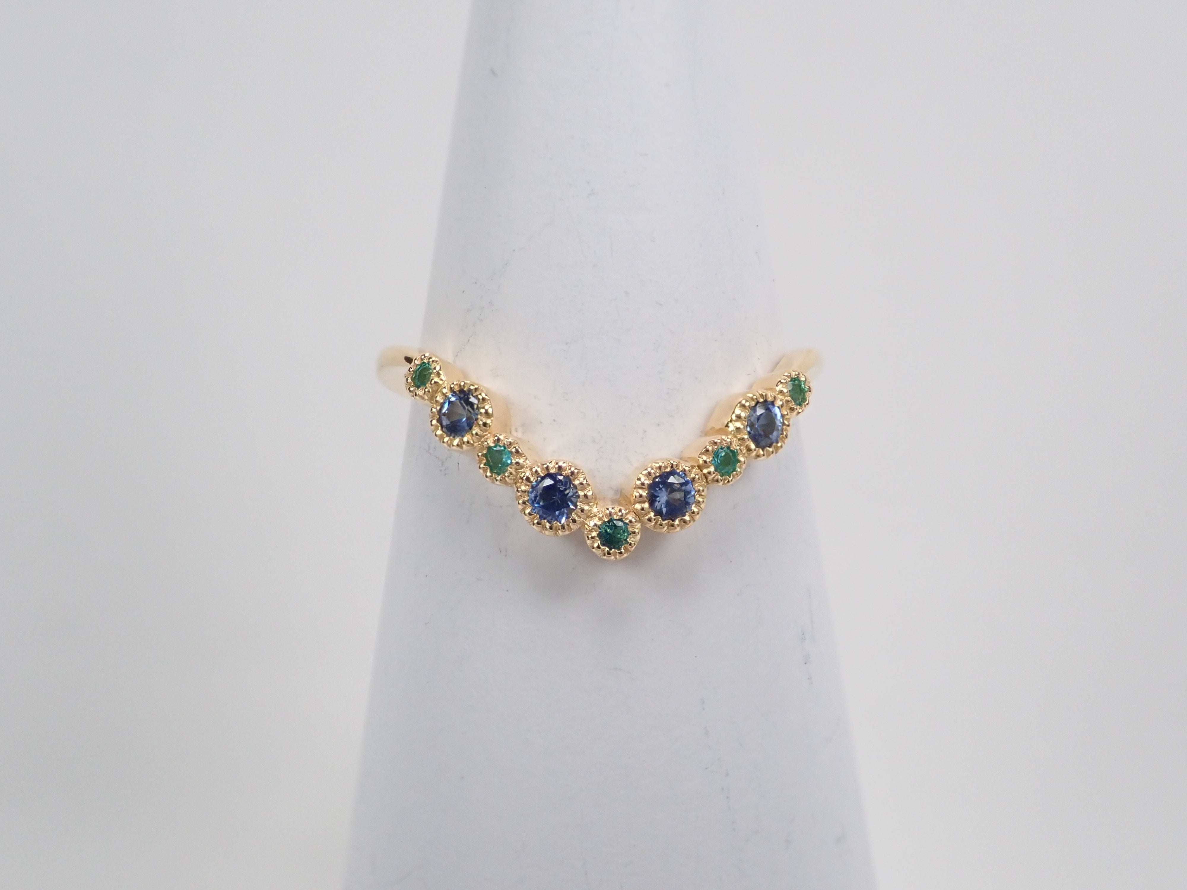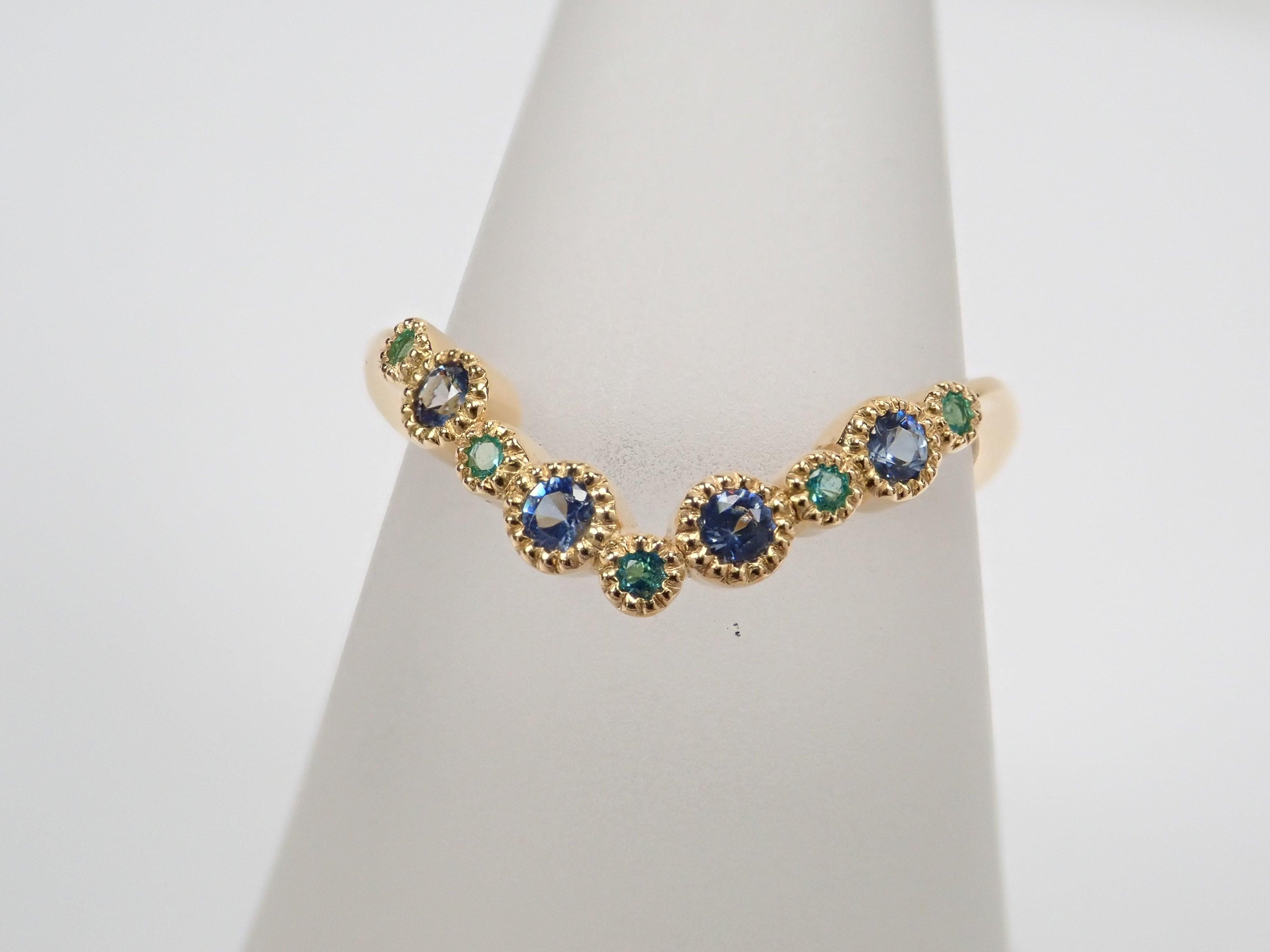 由藍錐礦和巴西帕拉伊巴碧璽製成的戒指。交替使用不同的藍色藍錐礦和巴西帕拉伊巴碧璽,營造出流行的氛圍。因為V字型的設計,也建議疊穿。藍錐礦和帕拉伊巴碧璽均經過精心挑選,品質最高,在 Karatz 散裝產品中透明度最高。