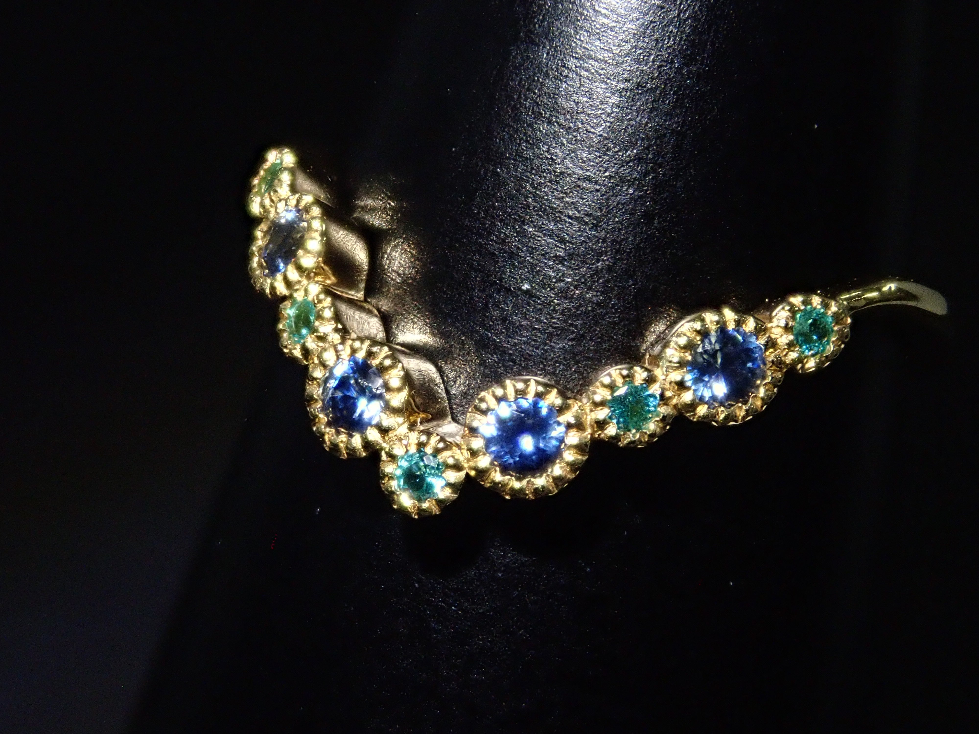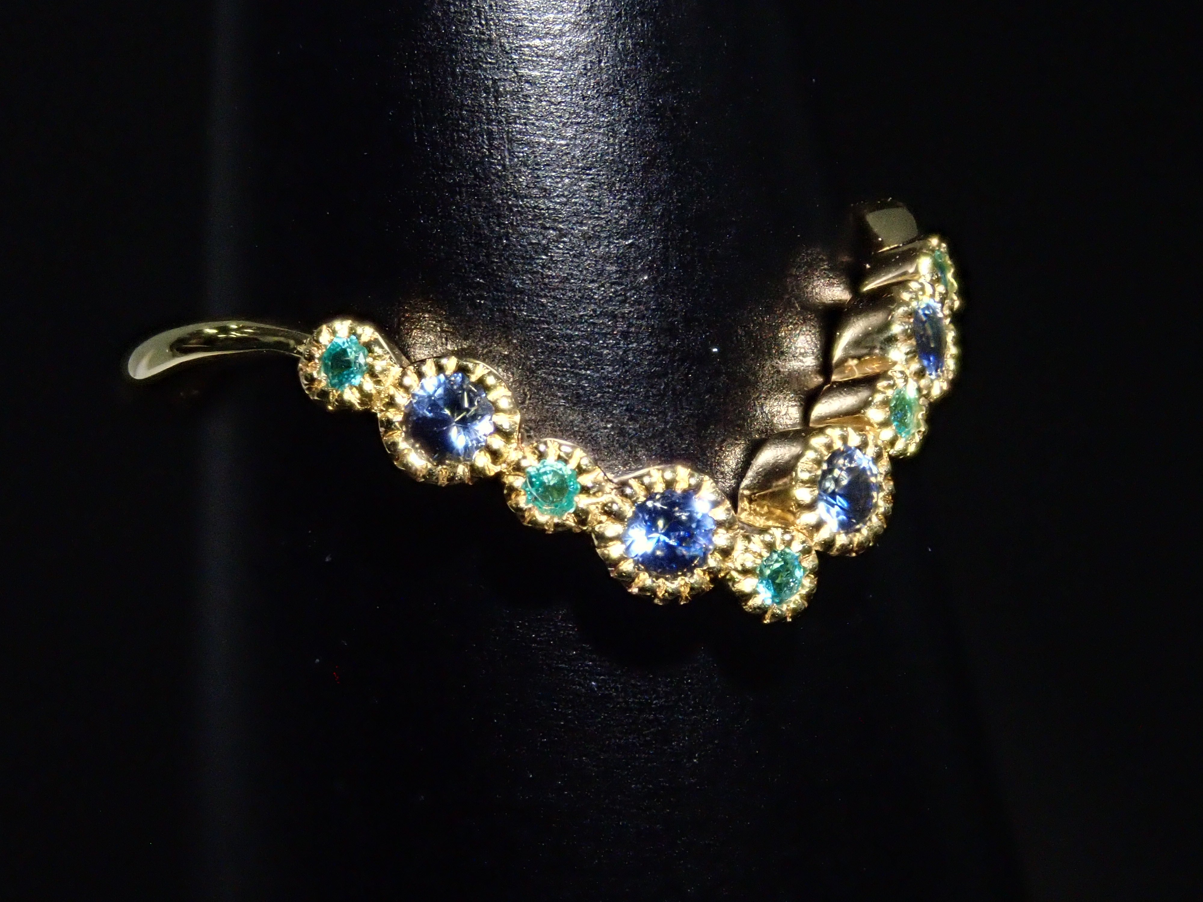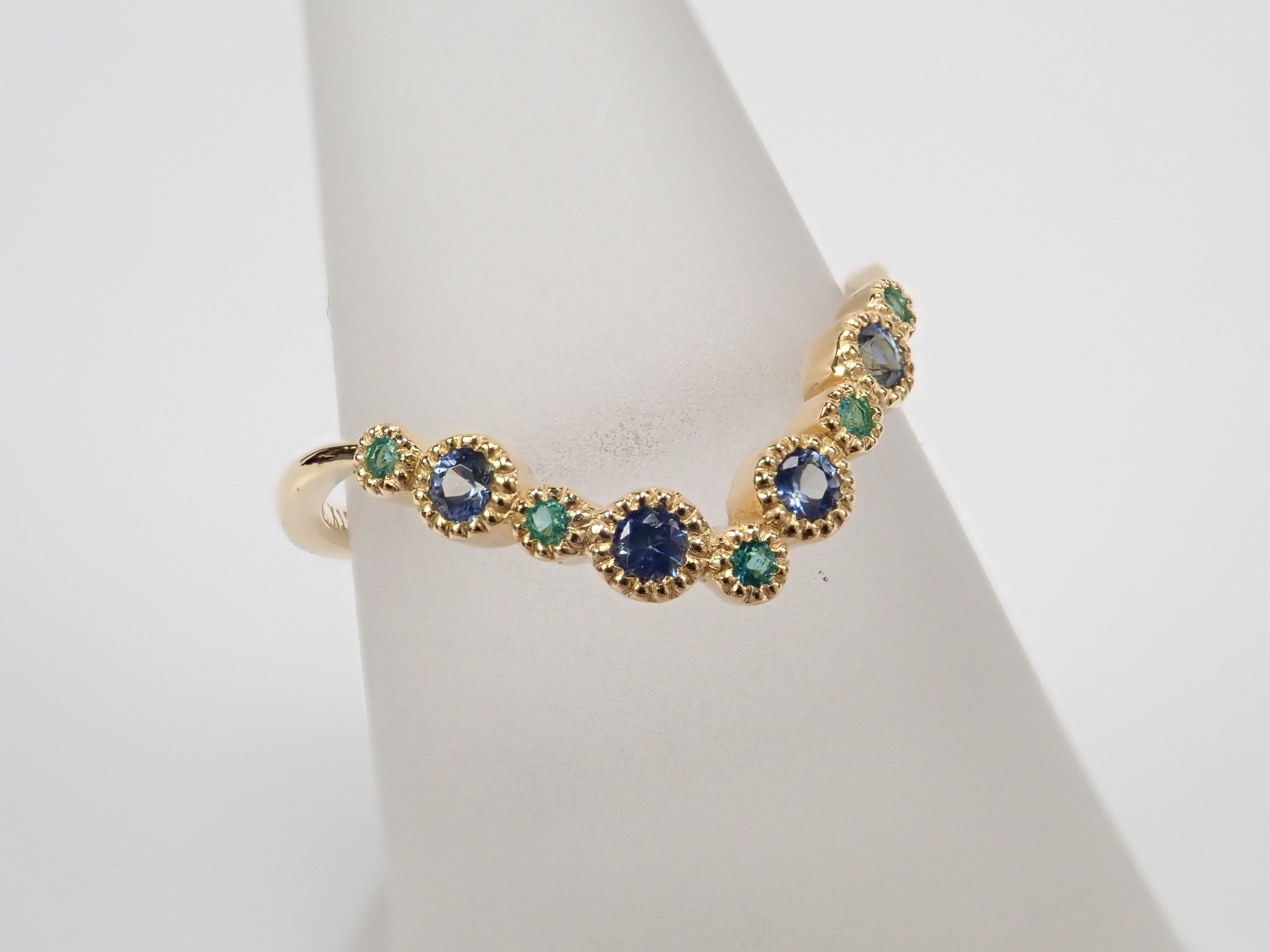 由藍錐礦和巴西帕拉伊巴碧璽製成的戒指。交替使用不同的藍色藍錐礦和巴西帕拉伊巴碧璽,營造出流行的氛圍。因為V字型的設計,也建議疊穿。藍錐礦和帕拉伊巴碧璽均經過精心挑選,品質最高,在 Karatz 散裝產品中透明度最高。