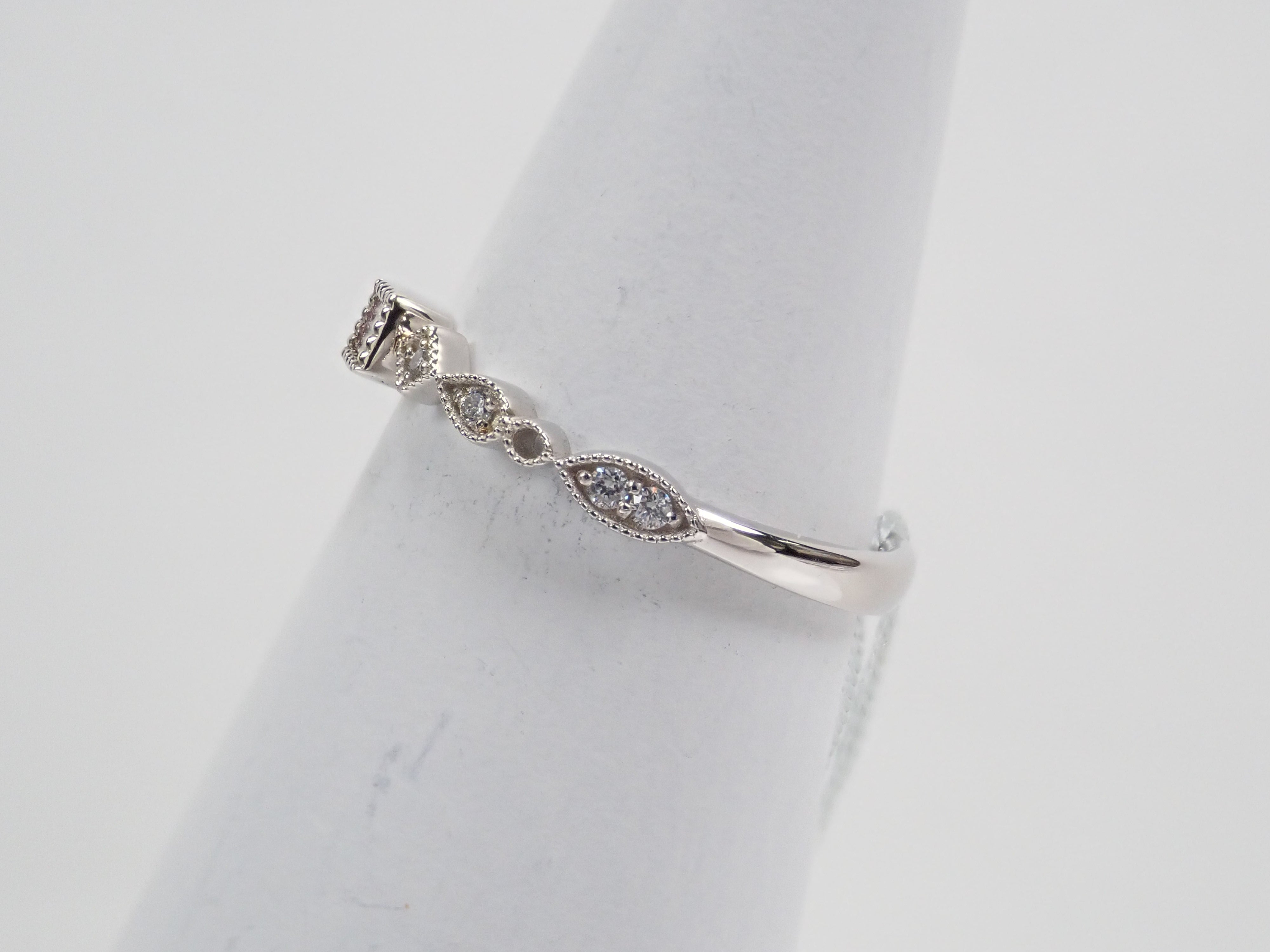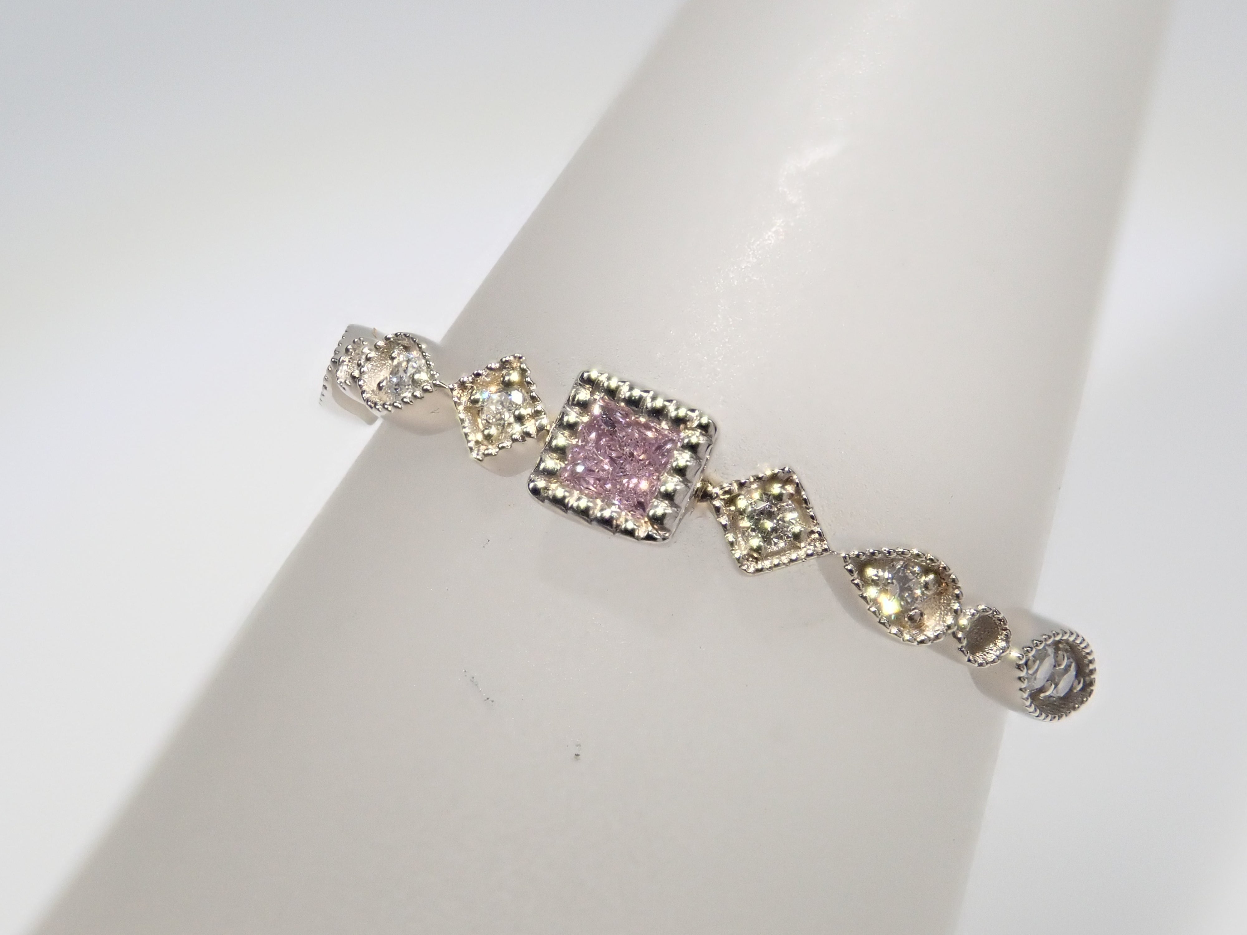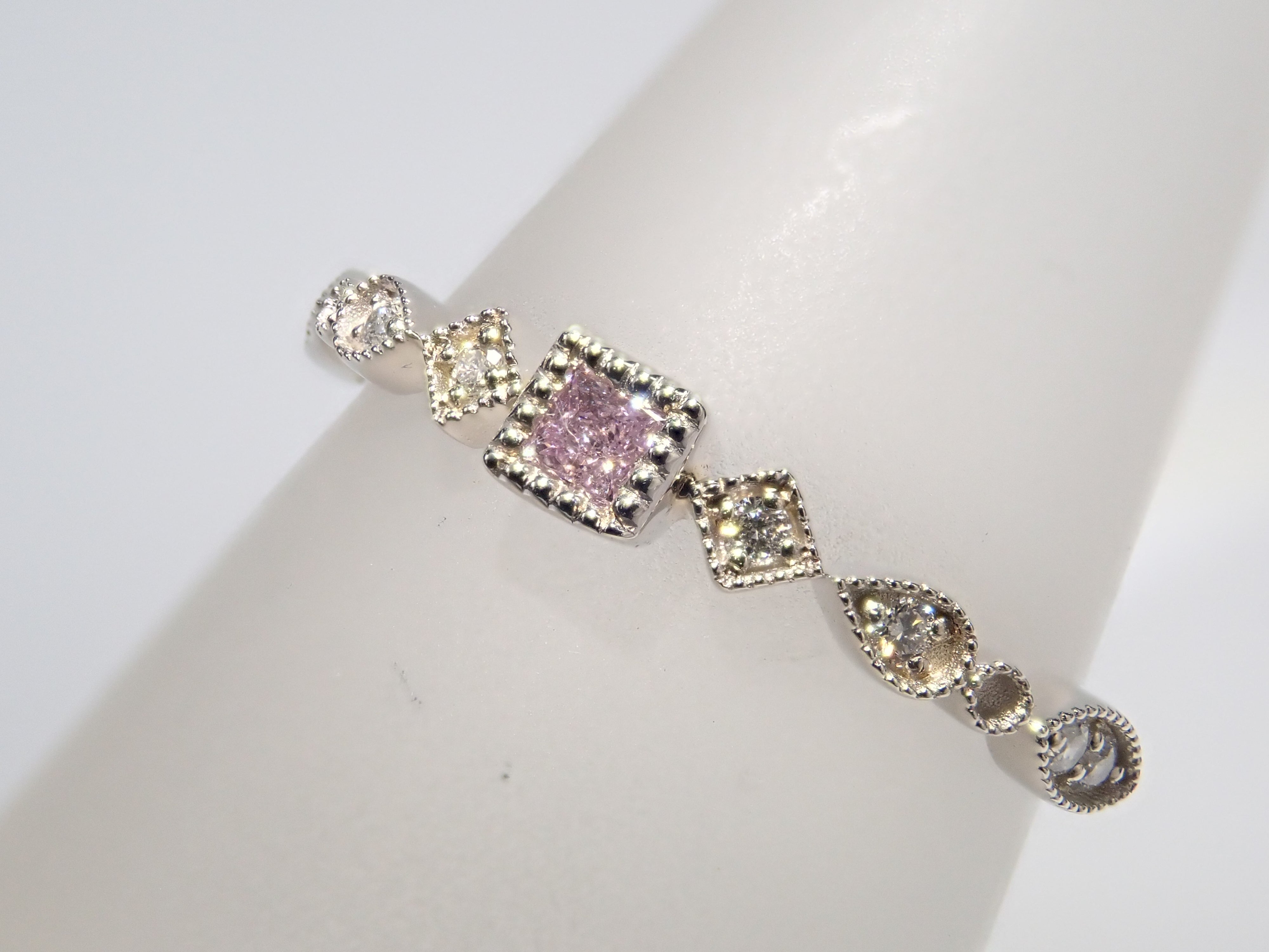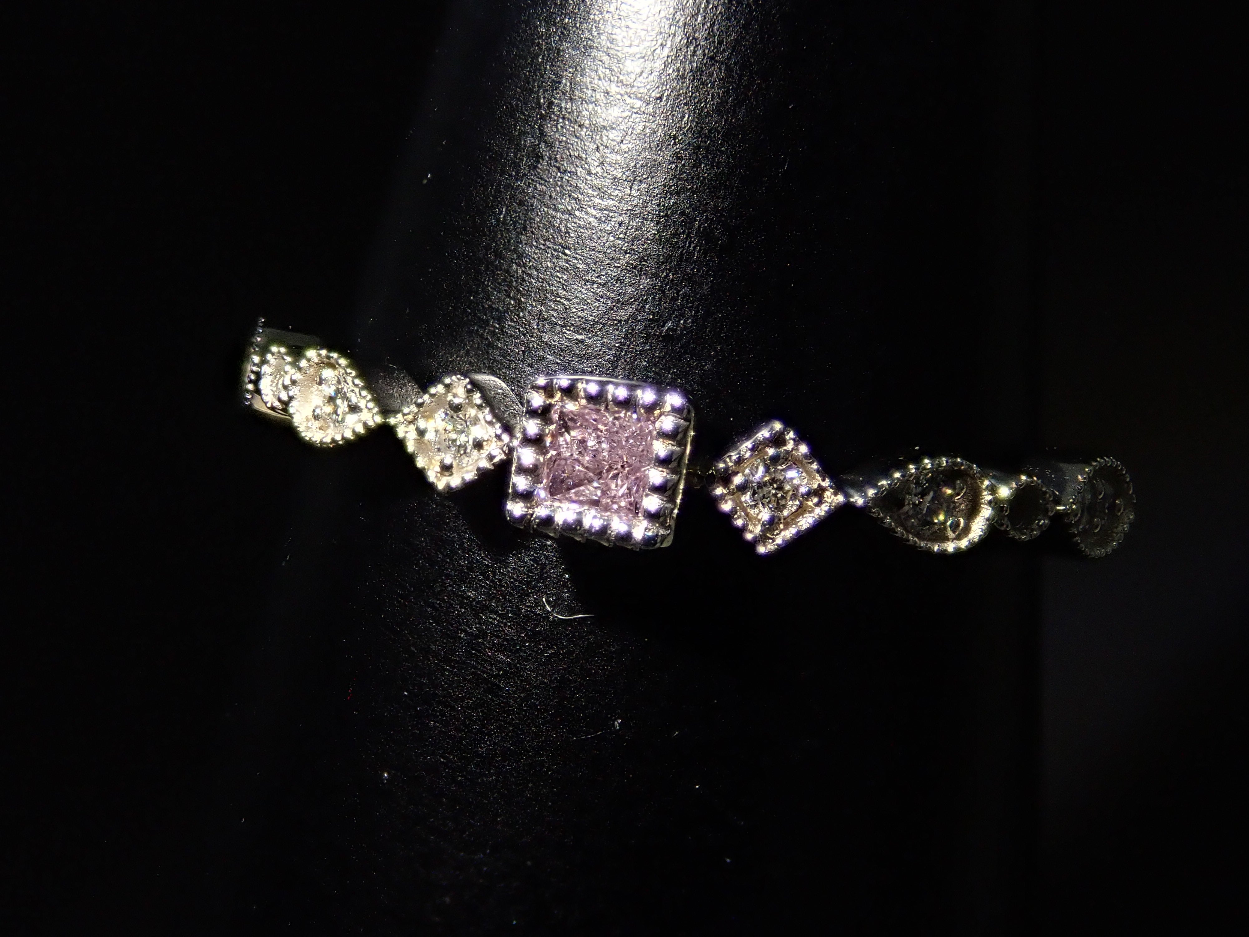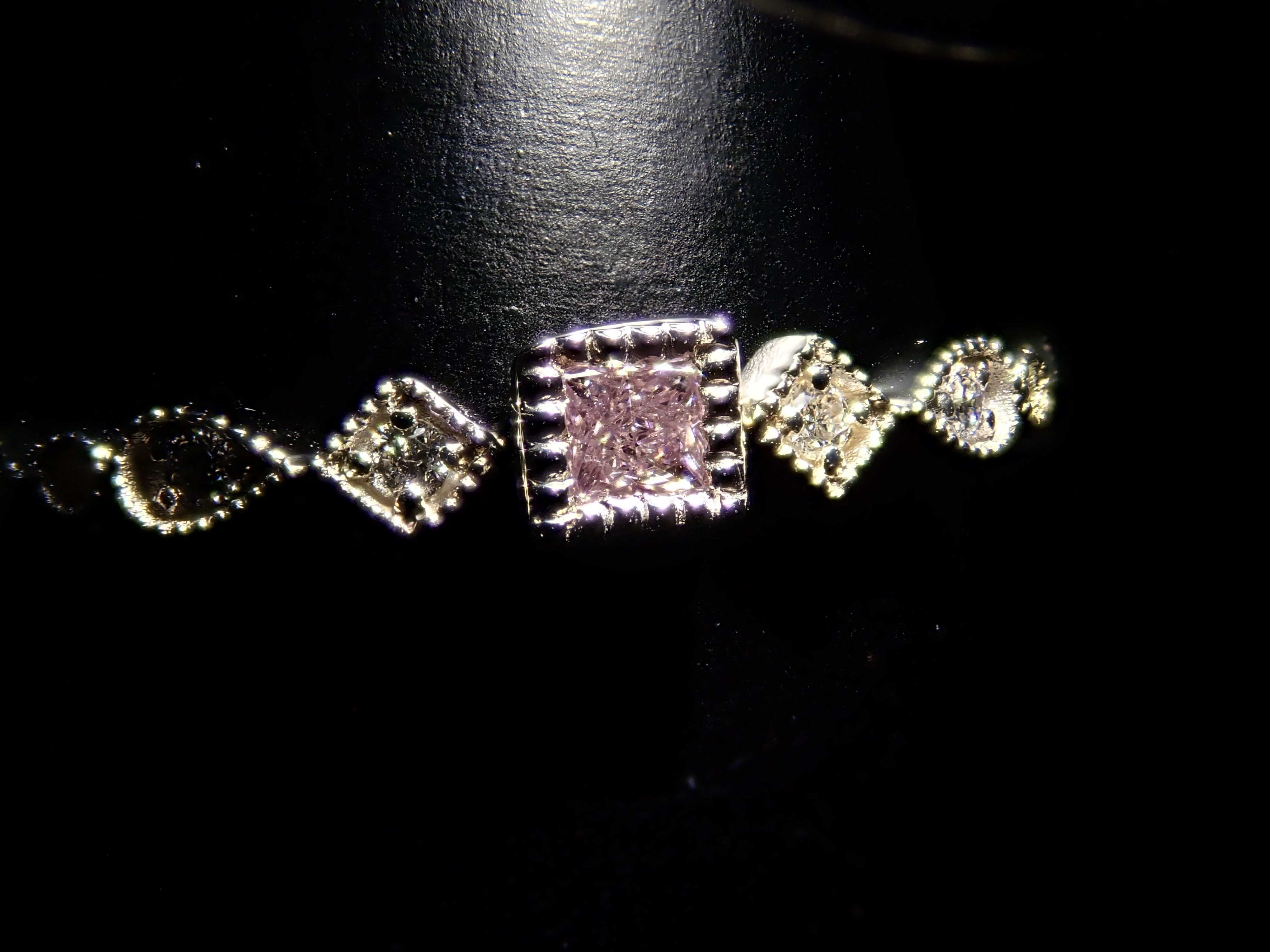 主石是粉紅色鑽石,副石也是鑽石。中石鑽石已由中央寶石研究院分選。 精美淺紫粉紅/SI-1/無。鋸狀滾邊包圍的設計很可愛。