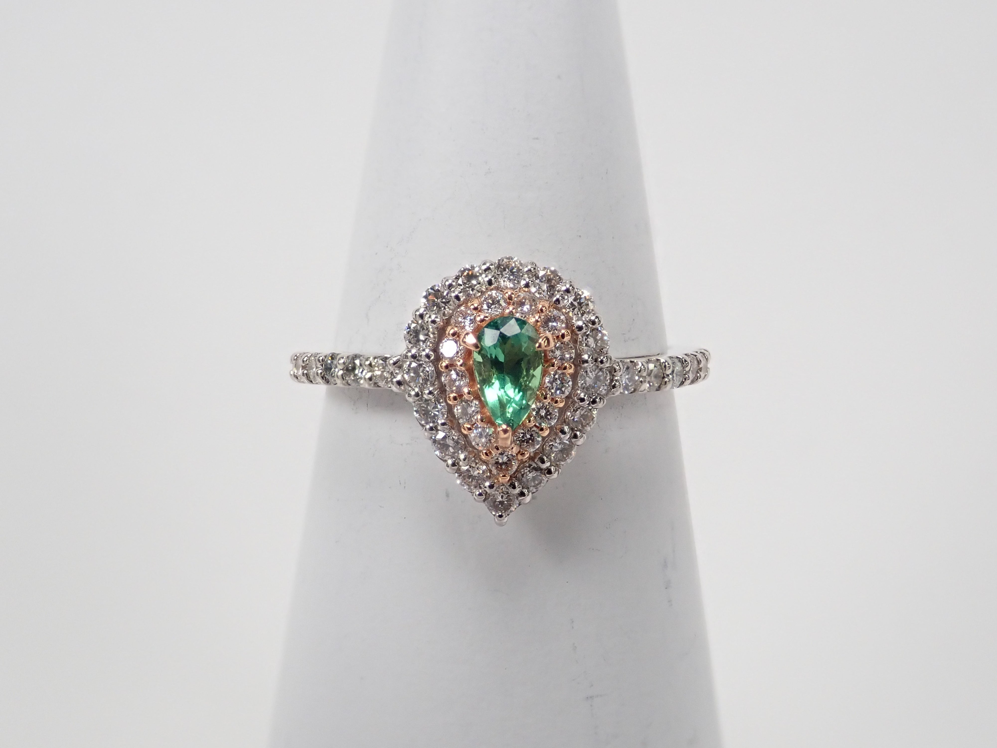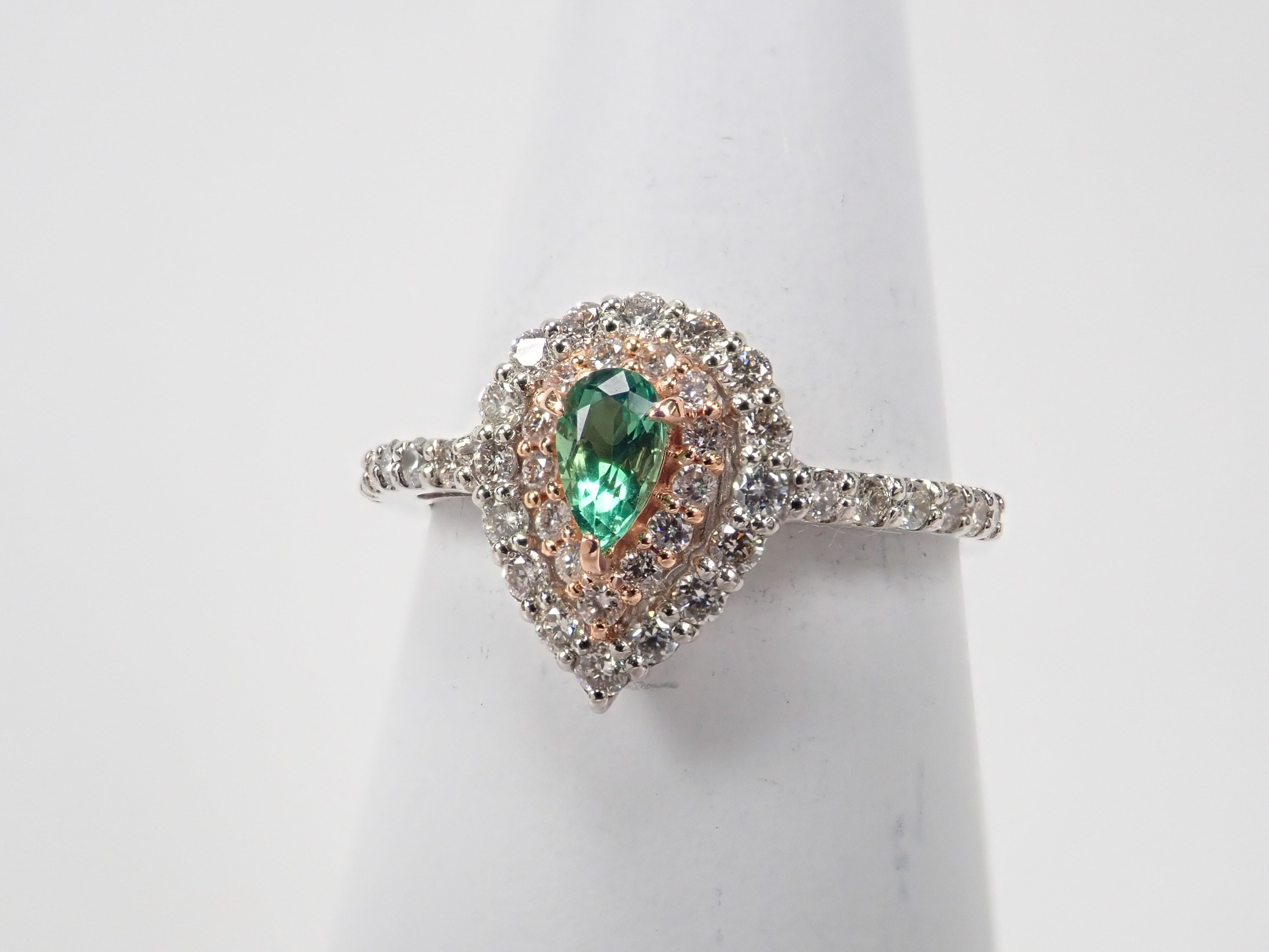 來自阿富汗的Green Ouinite是近幾年才上市的。一般來說,寶石品質的綠色奧恩石非常稀有,但這是一種高品質的綠色奧恩石,淨度極佳。質地疏鬆,即使用肉眼也很難看到內含物。這是一枚用綠夜做珠寶的戒指。透明清爽的綠色主石周圍環繞著兩層璀璨鑽石。