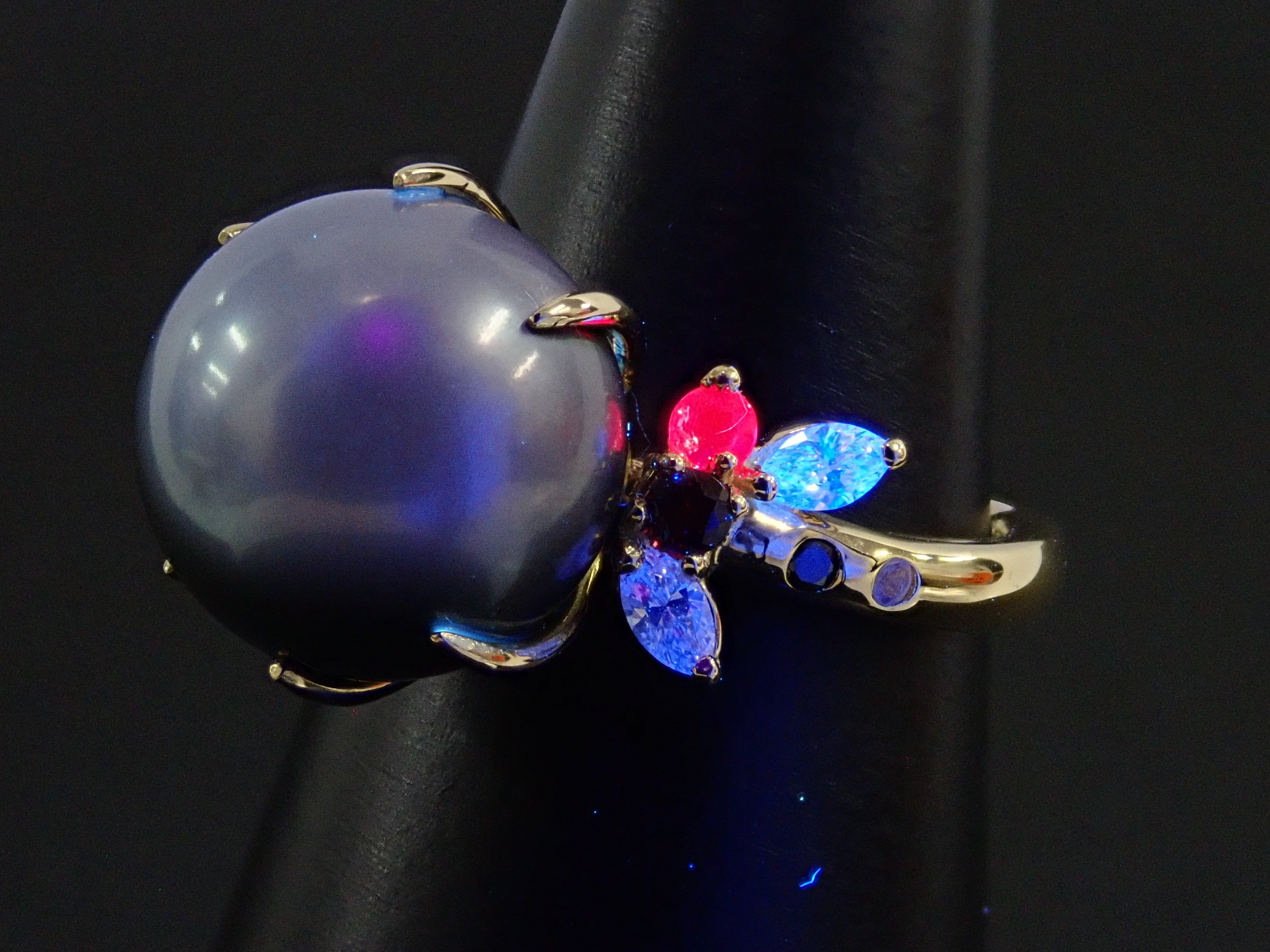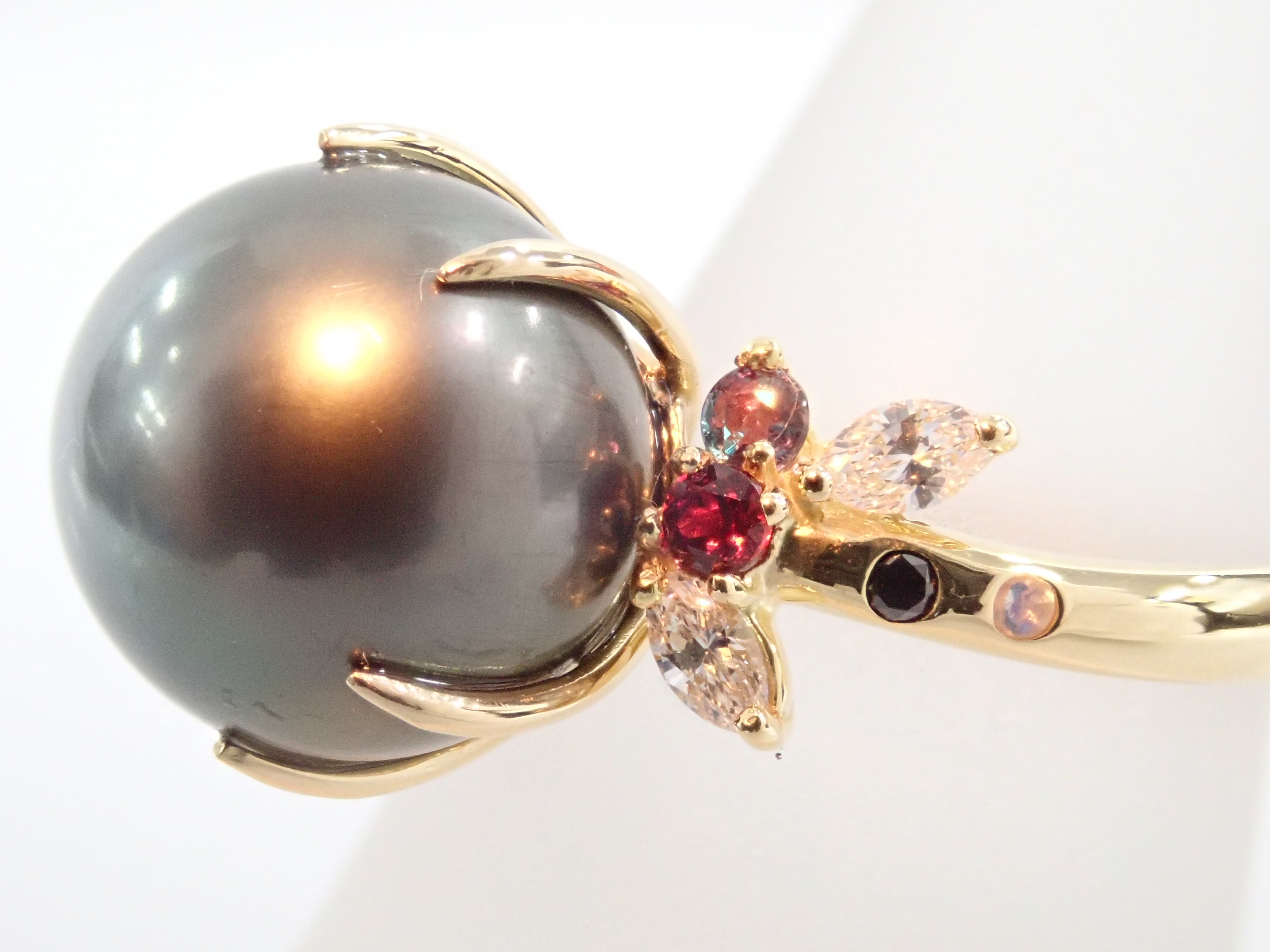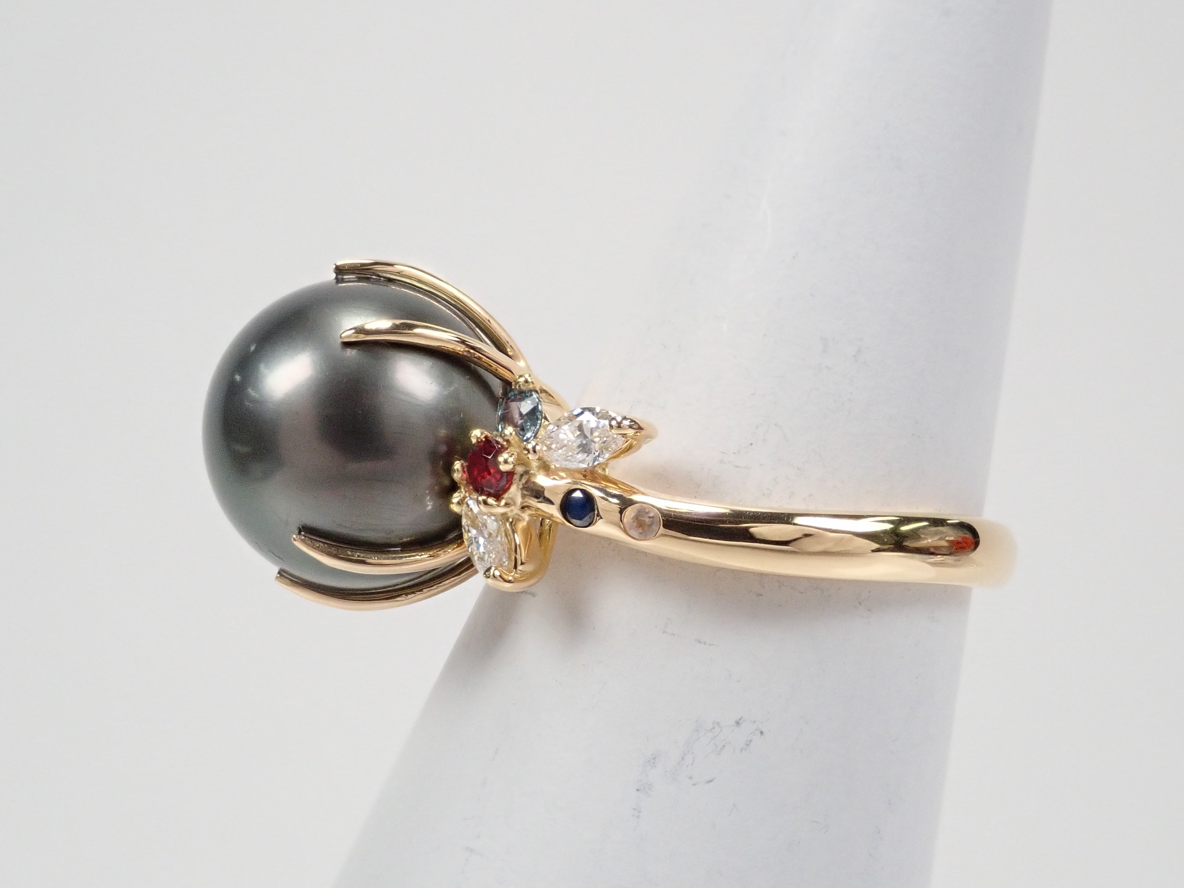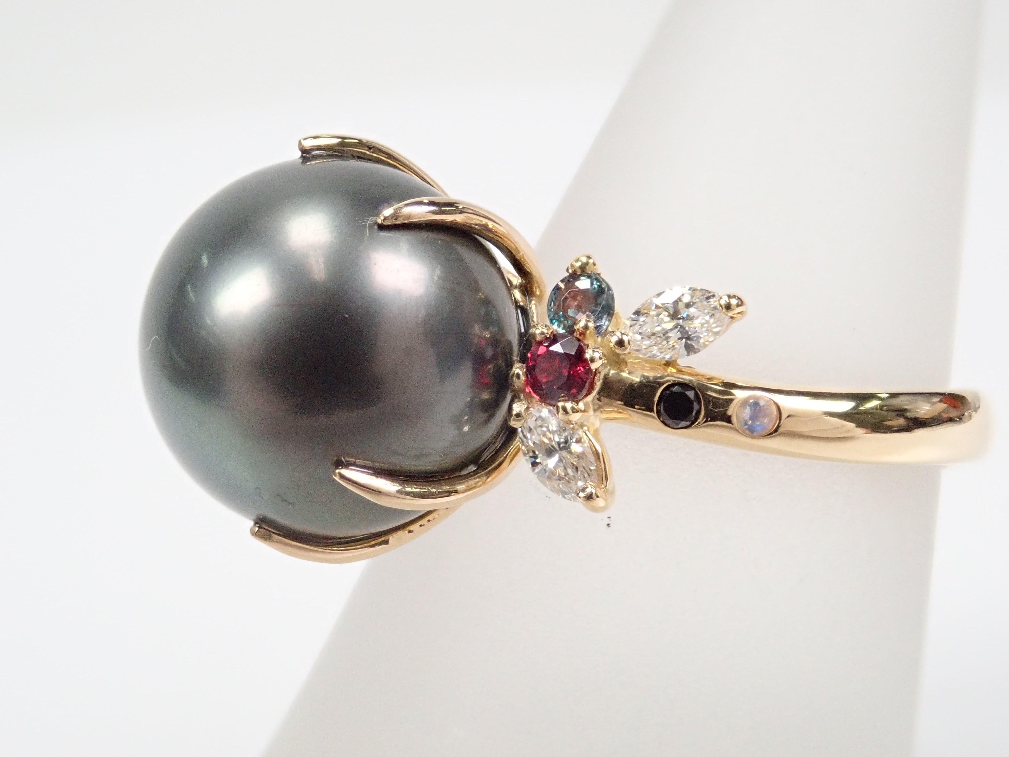 南洋珍珠戒指。副石上還添加了與閃亮的黑唇珍珠相得益彰的棕色和黑色鑽石,營造出時尚的氛圍。與黃金的對比也很漂亮。副石包括無色鑽石、黑色鑽石、棕色鑽石、紅榴石和 Bekiru 藍色石榴石。 -使用亞歷山大月光石。所有珠寶,包括珍珠,均由 KARATZ 精心挑選。這枚戒指採用了Karatz原創的半定制框架Einsel 。
