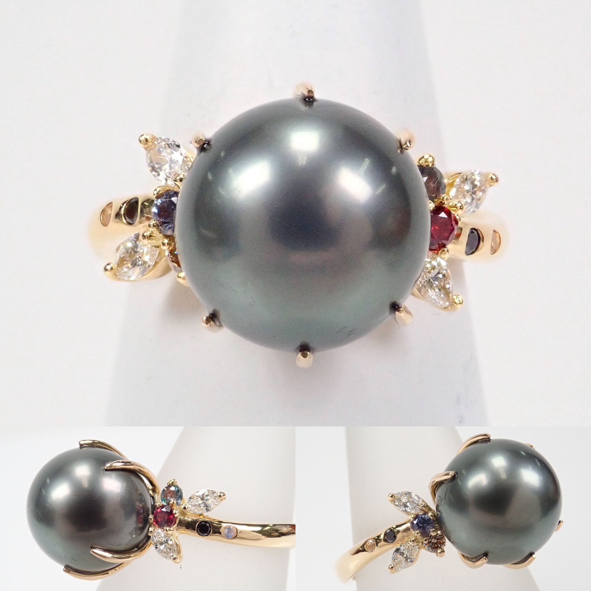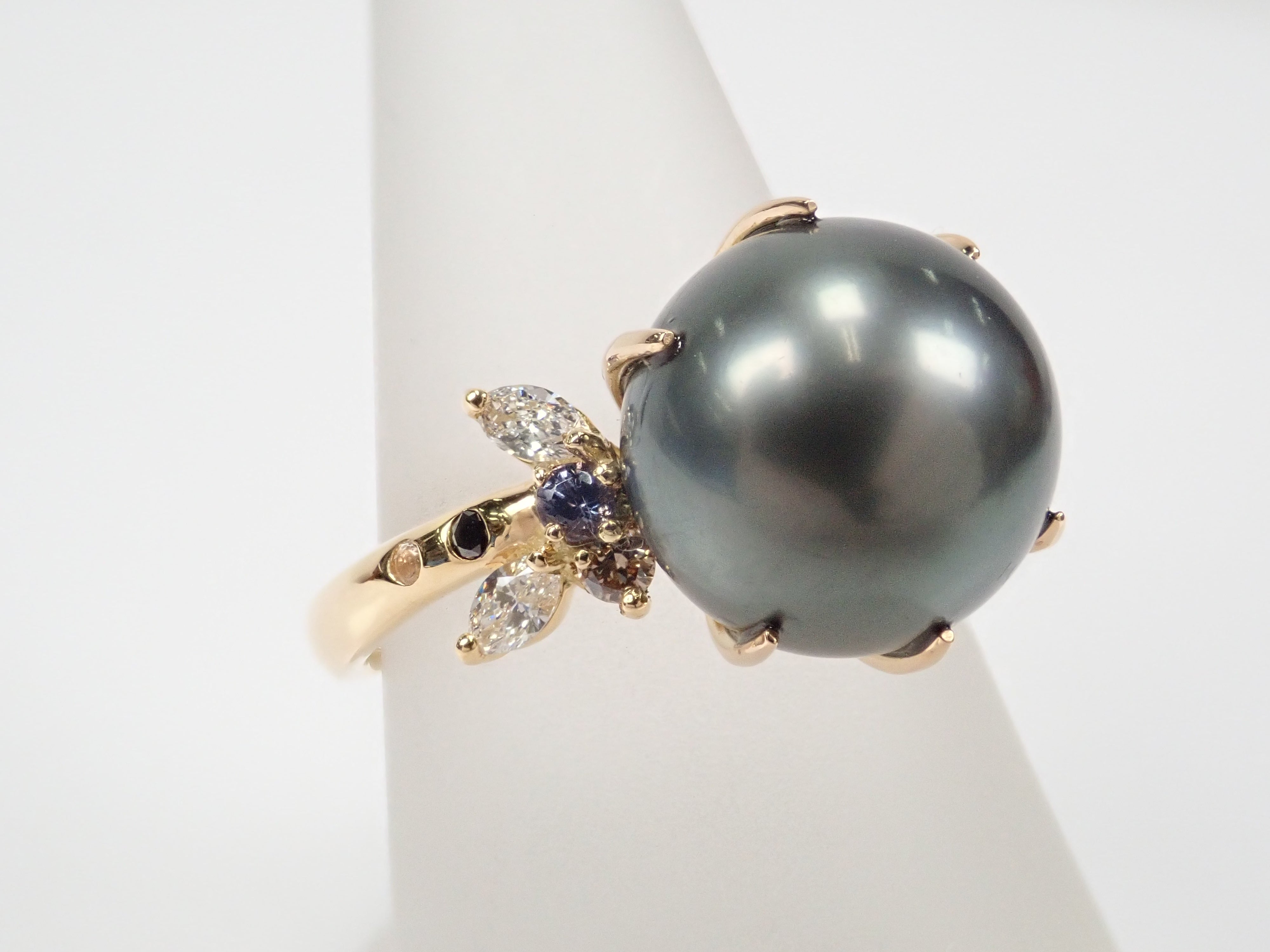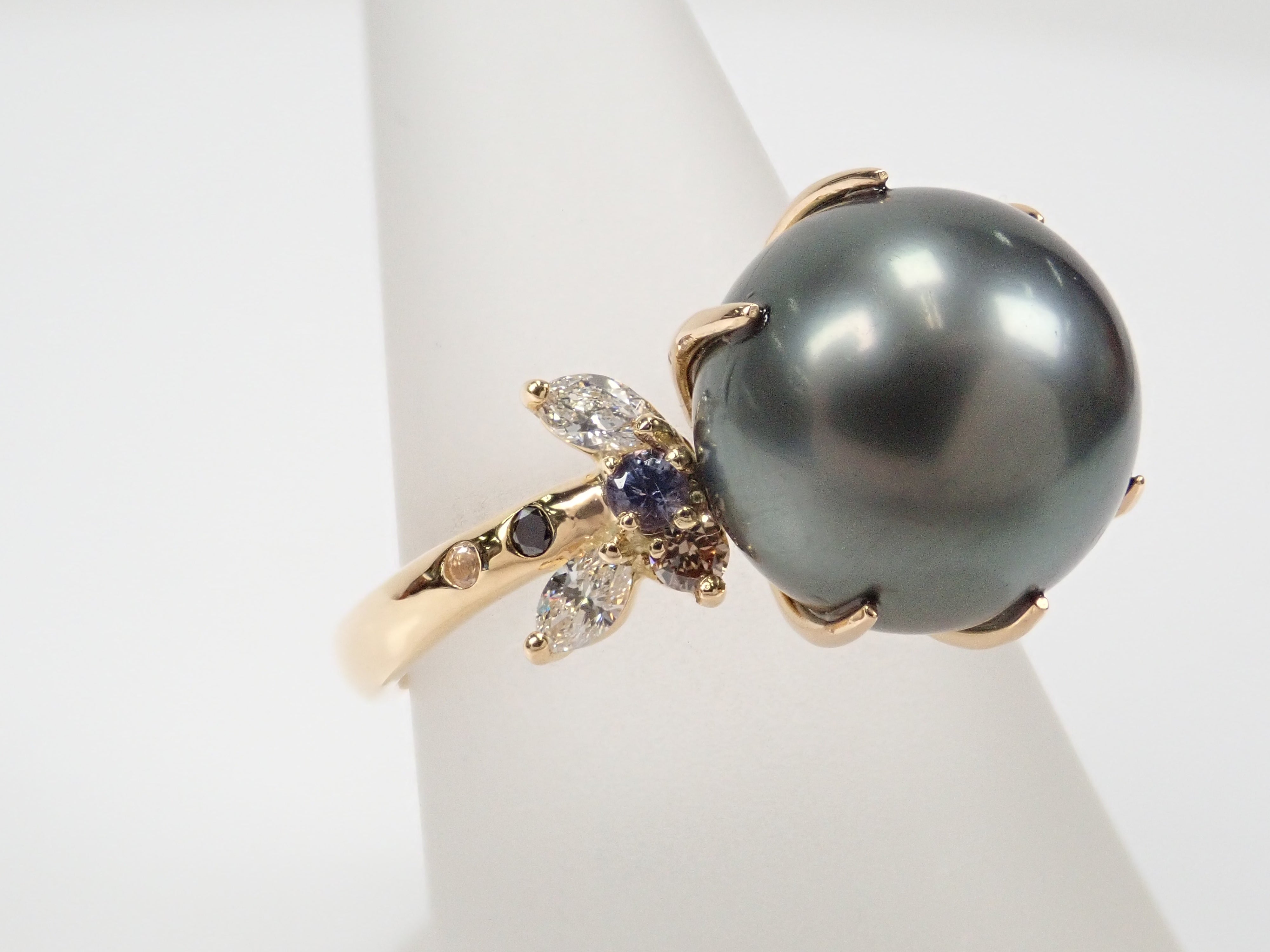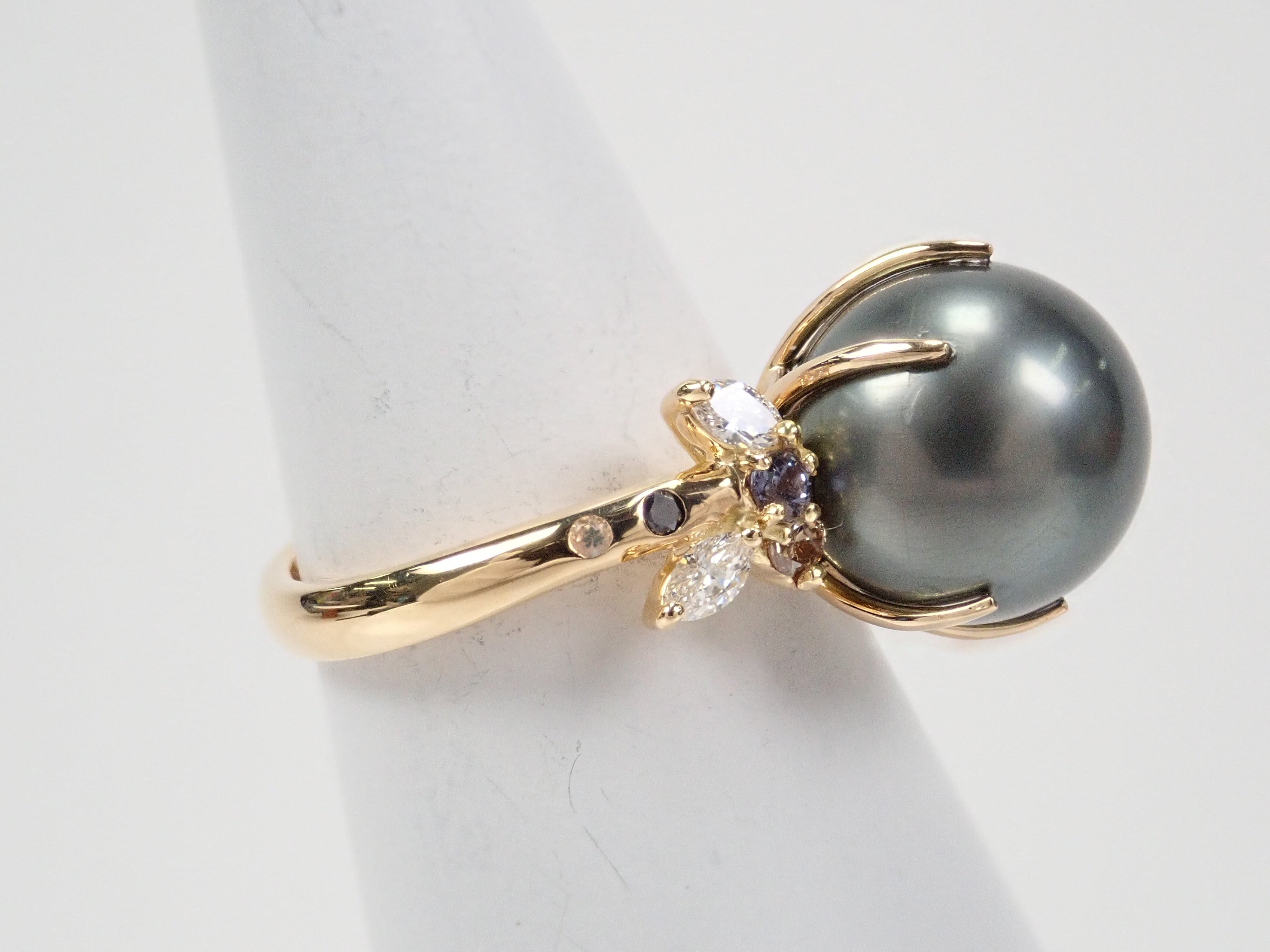 南洋珍珠戒指。副石上還添加了與閃亮的黑唇珍珠相得益彰的棕色和黑色鑽石,營造出時尚的氛圍。與黃金的對比也很漂亮。副石包括無色鑽石、黑色鑽石、棕色鑽石、紅榴石和 Bekiru 藍色石榴石。 -使用亞歷山大月光石。所有珠寶,包括珍珠,均由 KARATZ 精心挑選。這枚戒指採用了Karatz原創的半定制框架Einsel 。