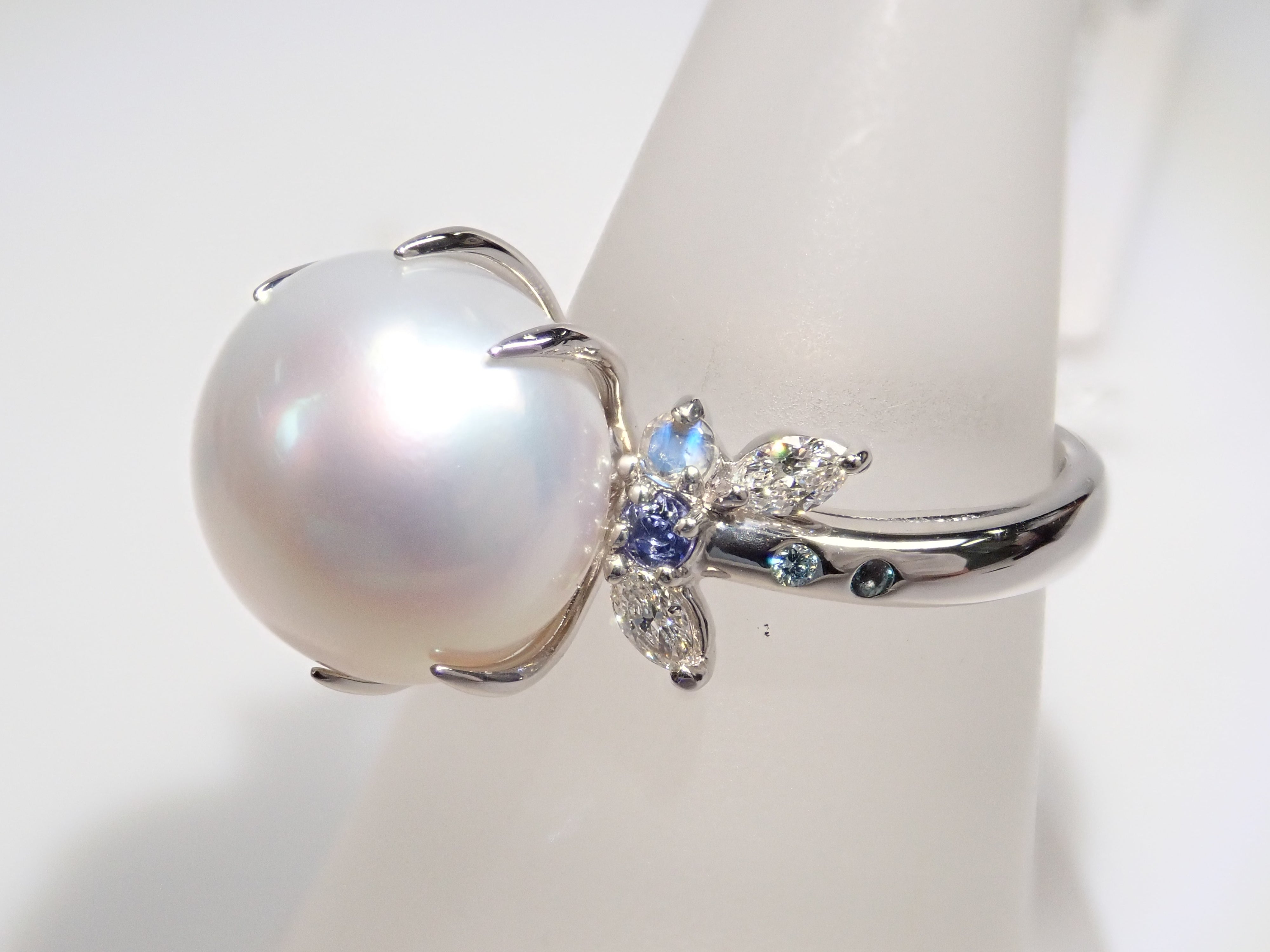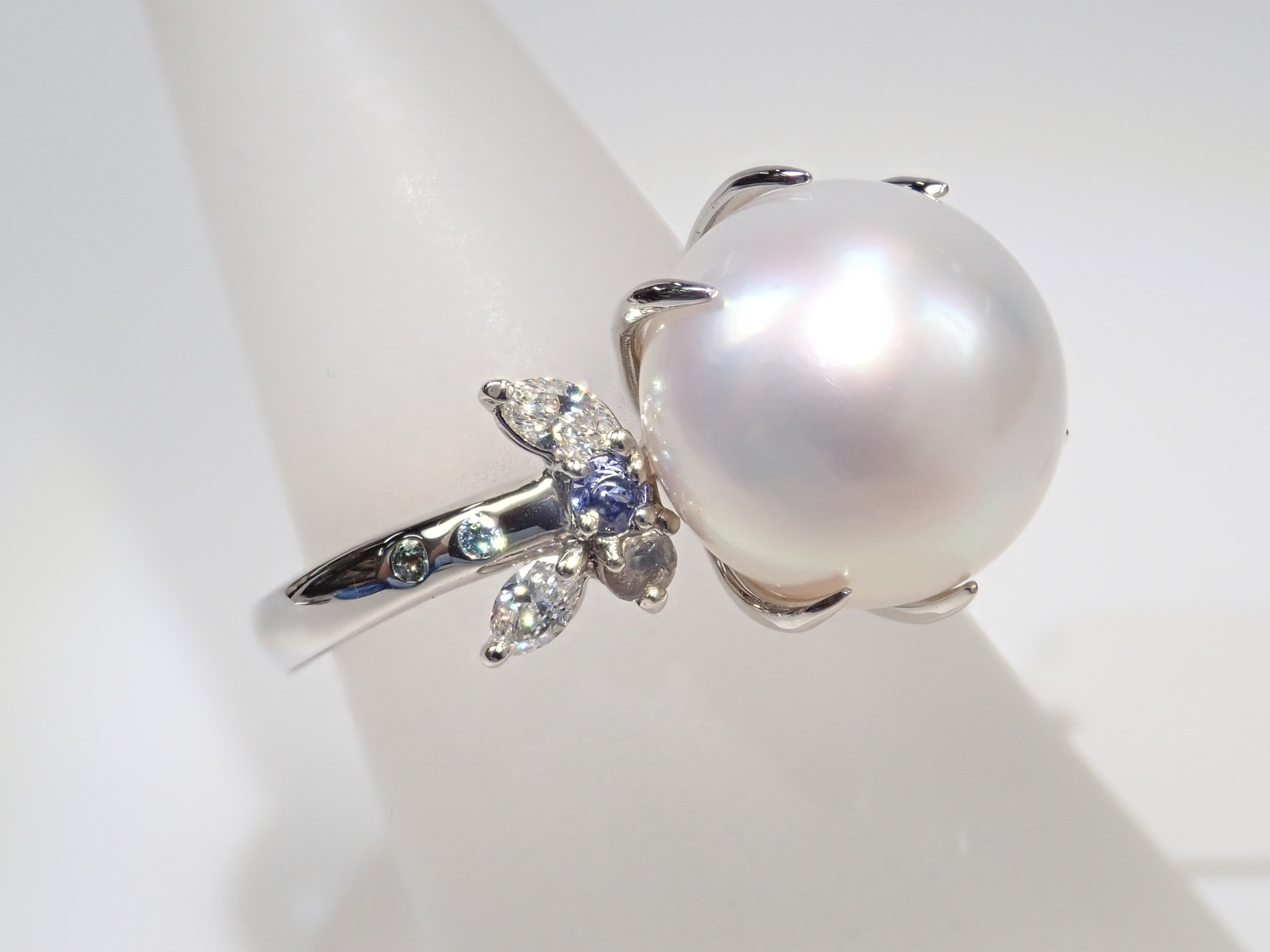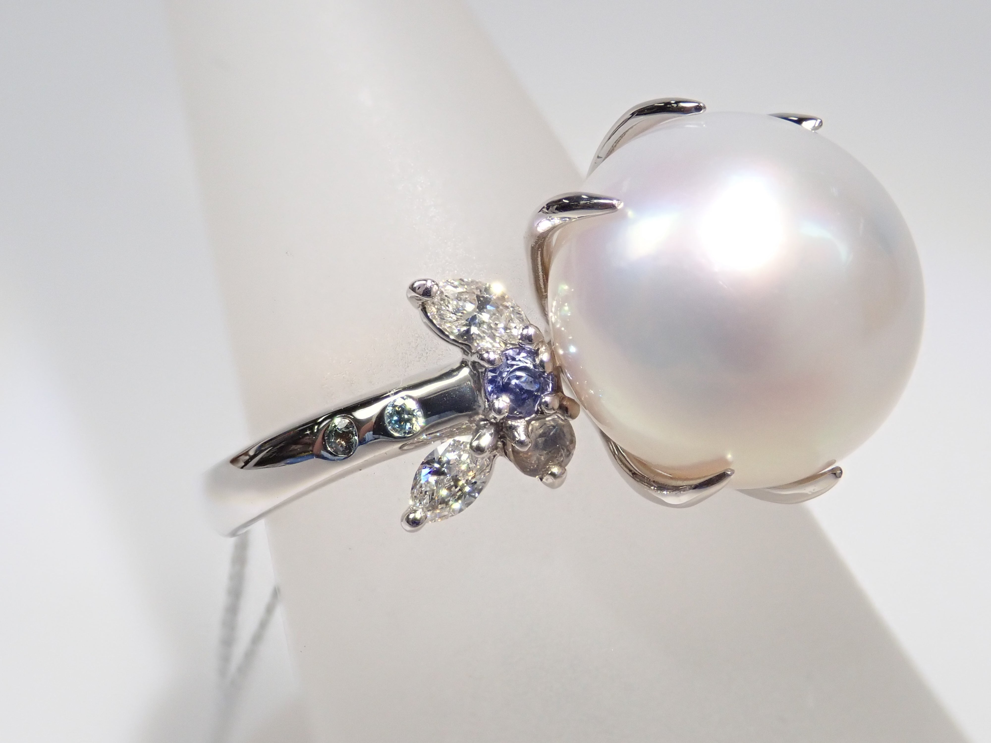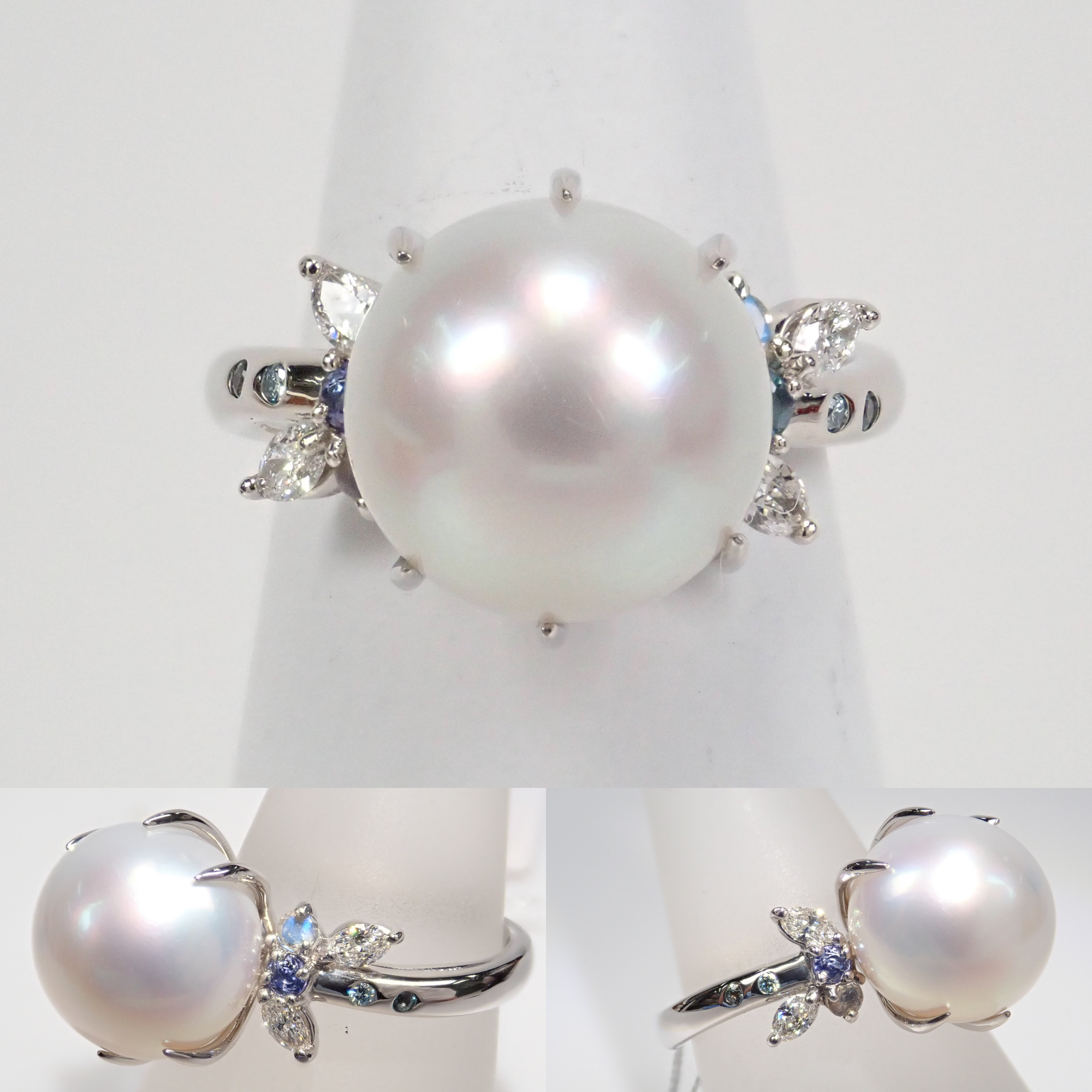 這款戒指鑲有大而脆的南洋珍珠,飾有鑽石和有色寶石。精心挑選的南洋珍珠搭配無色和冰藍色鑽石以及亞歷山大變石和坦桑石等有色寶石。珍珠戒指往往具有經典的外觀,但透過與有色寶石搭配,我們可以營造出獨特的氛圍。 對於副石,我們使用無色鑽石、冰藍色鑽石(處理)、亞歷山大變石、中長石拉長石、茱萸石和丹泉石。所有珠寶,包括珍珠,均由 KARATZ 精心挑選。