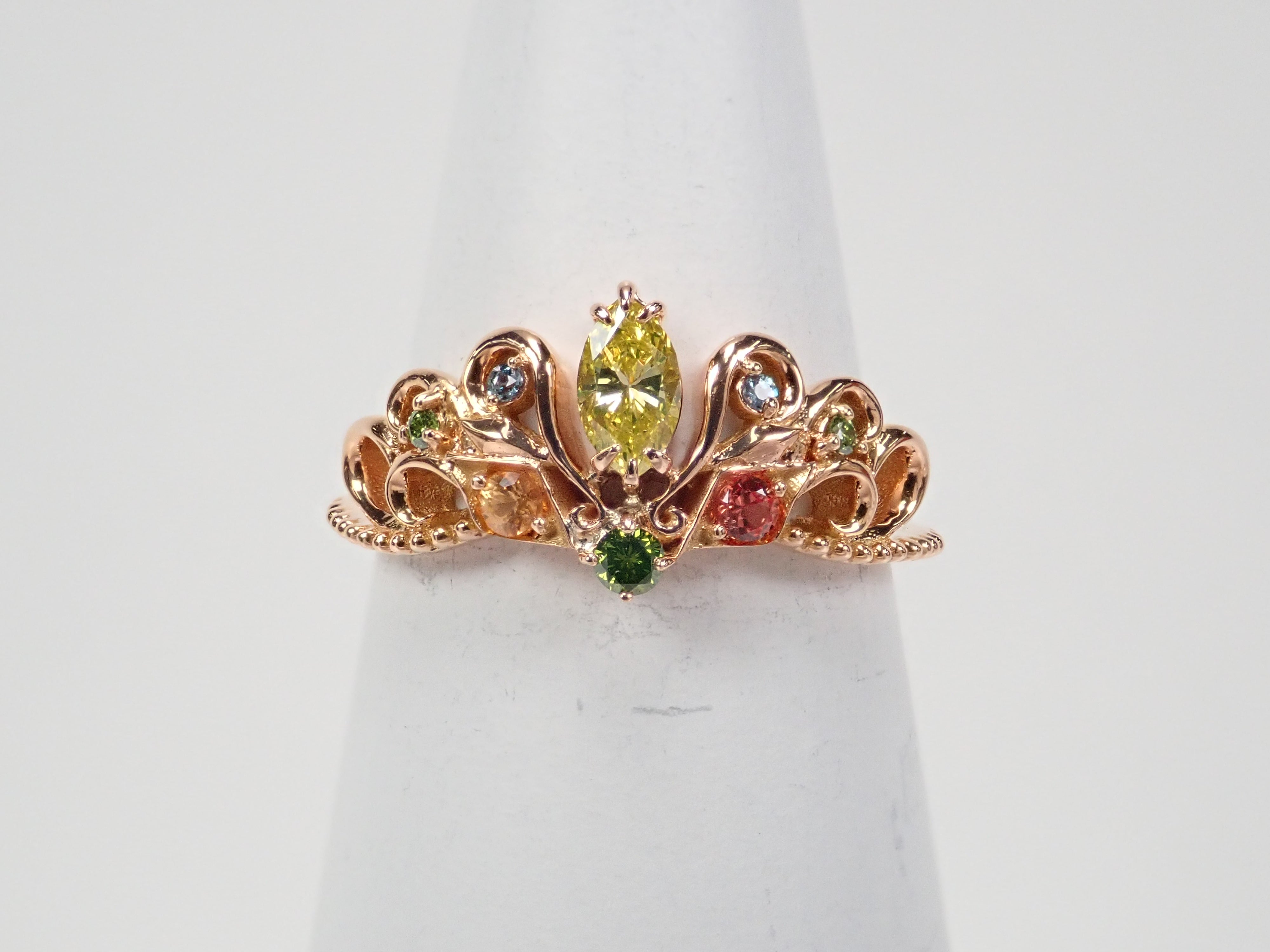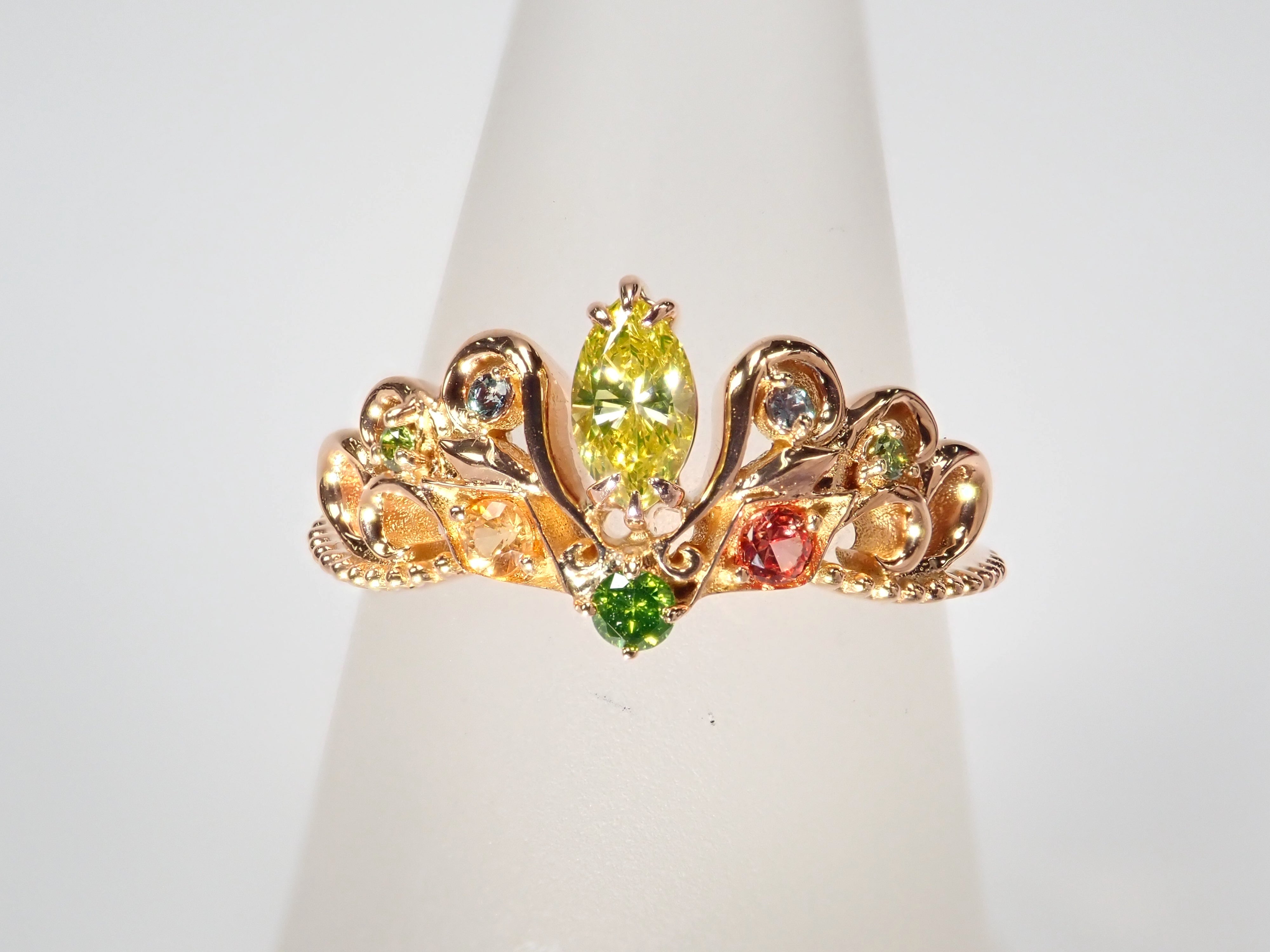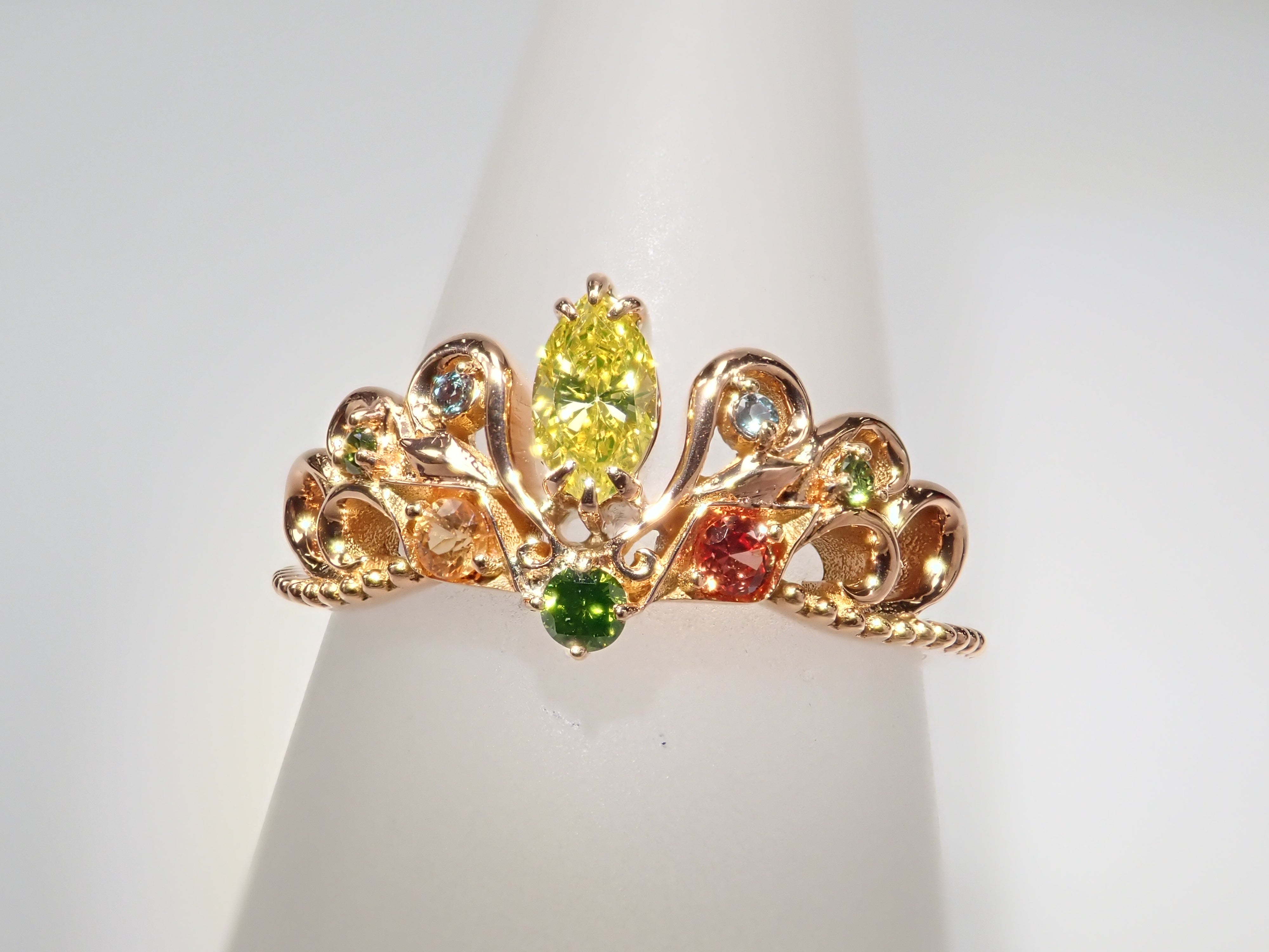 這枚戒指採用金絲雀黃鑽石,經過分選後呈現出鮮豔的黃色。鑽石的顏色為濃彩綠黃色,尺寸為 0.214 克拉。由於它是 SI-1,因此它是一顆高度透明的鑽石,其內含物很難用肉眼察覺。當暴露在黑光下時,它會發出黃綠色螢光。戒指鑲有亞歷山大變石和彩色藍寶石,並具有華麗的皇冠式設計。