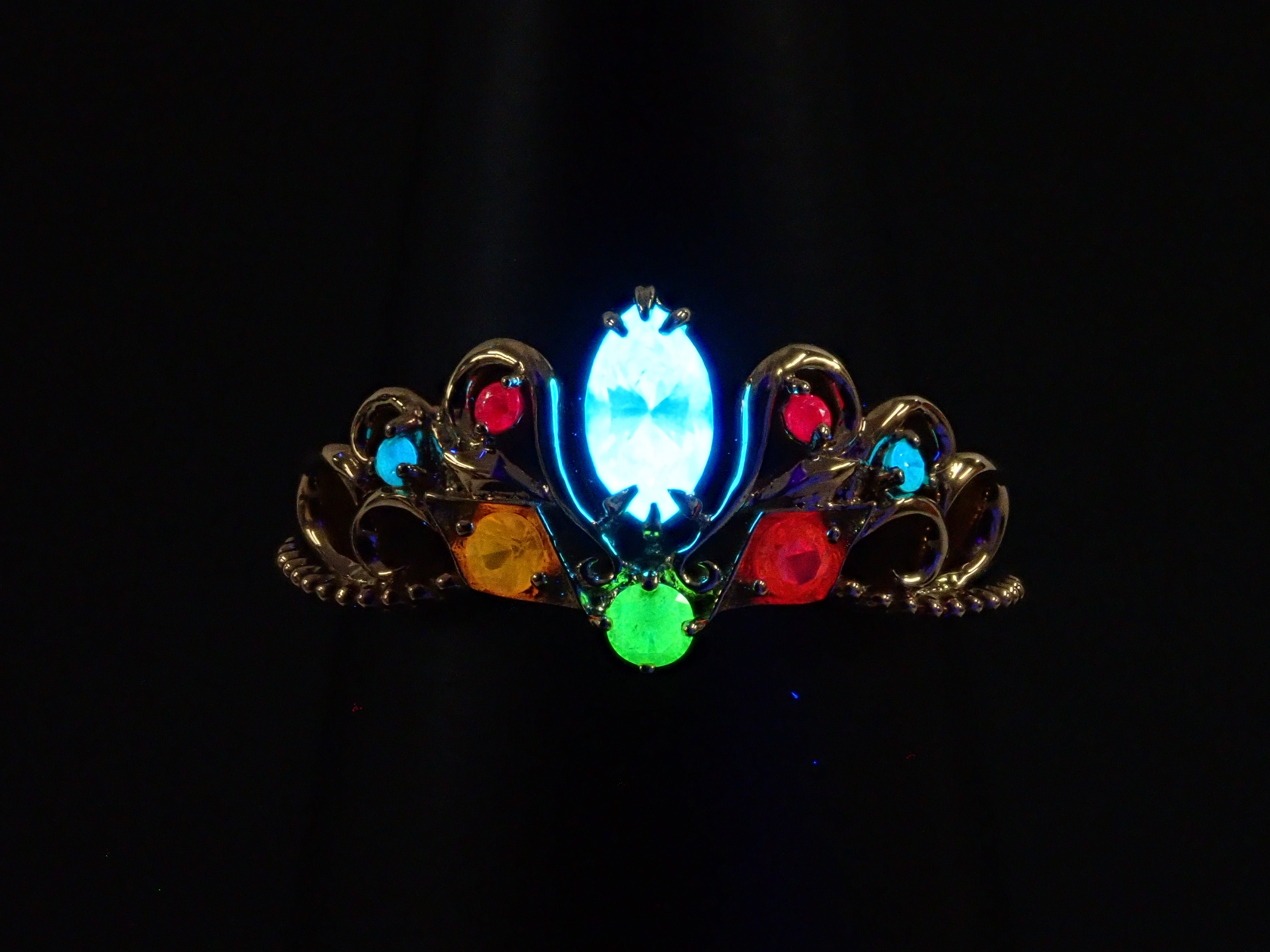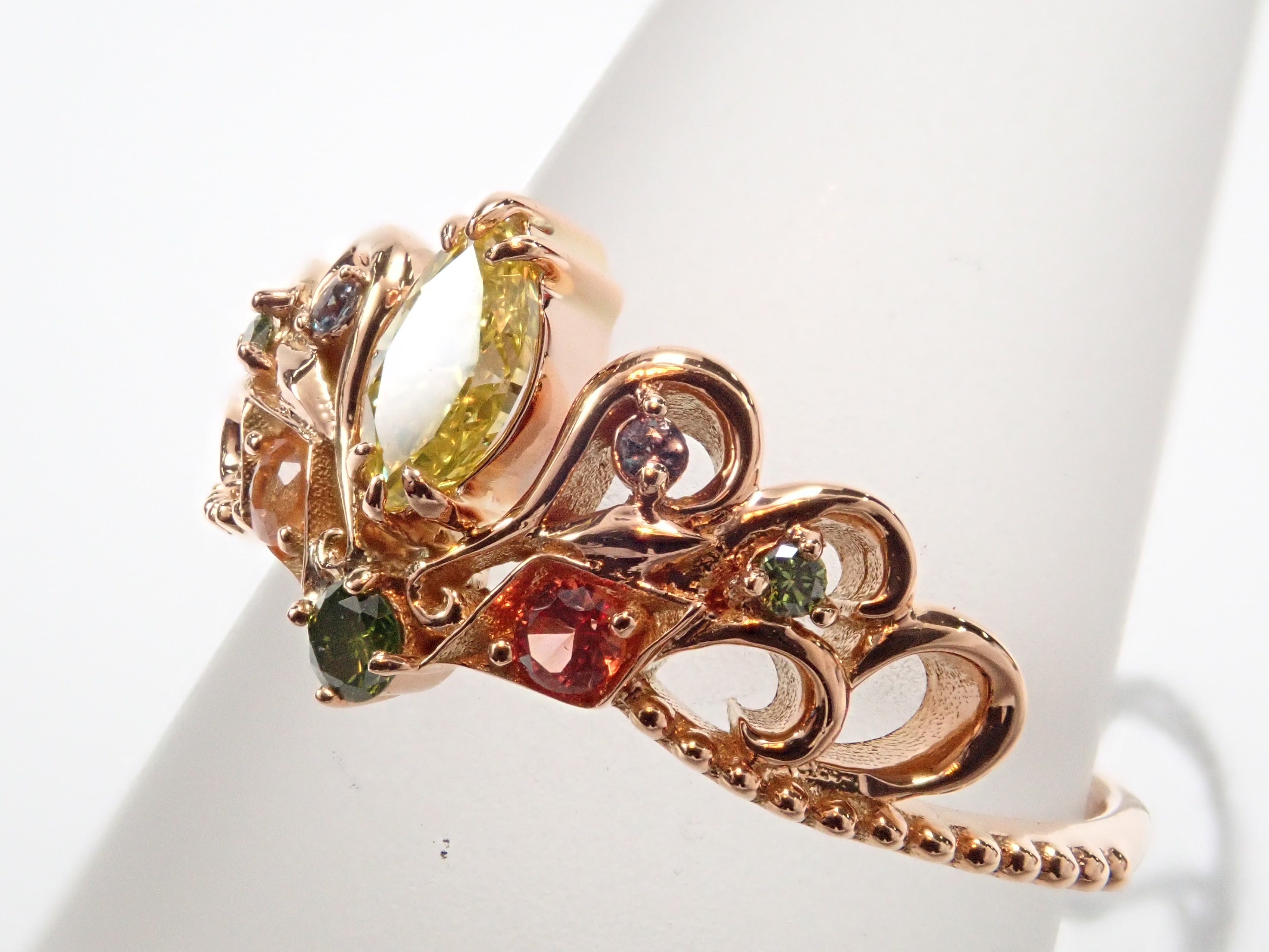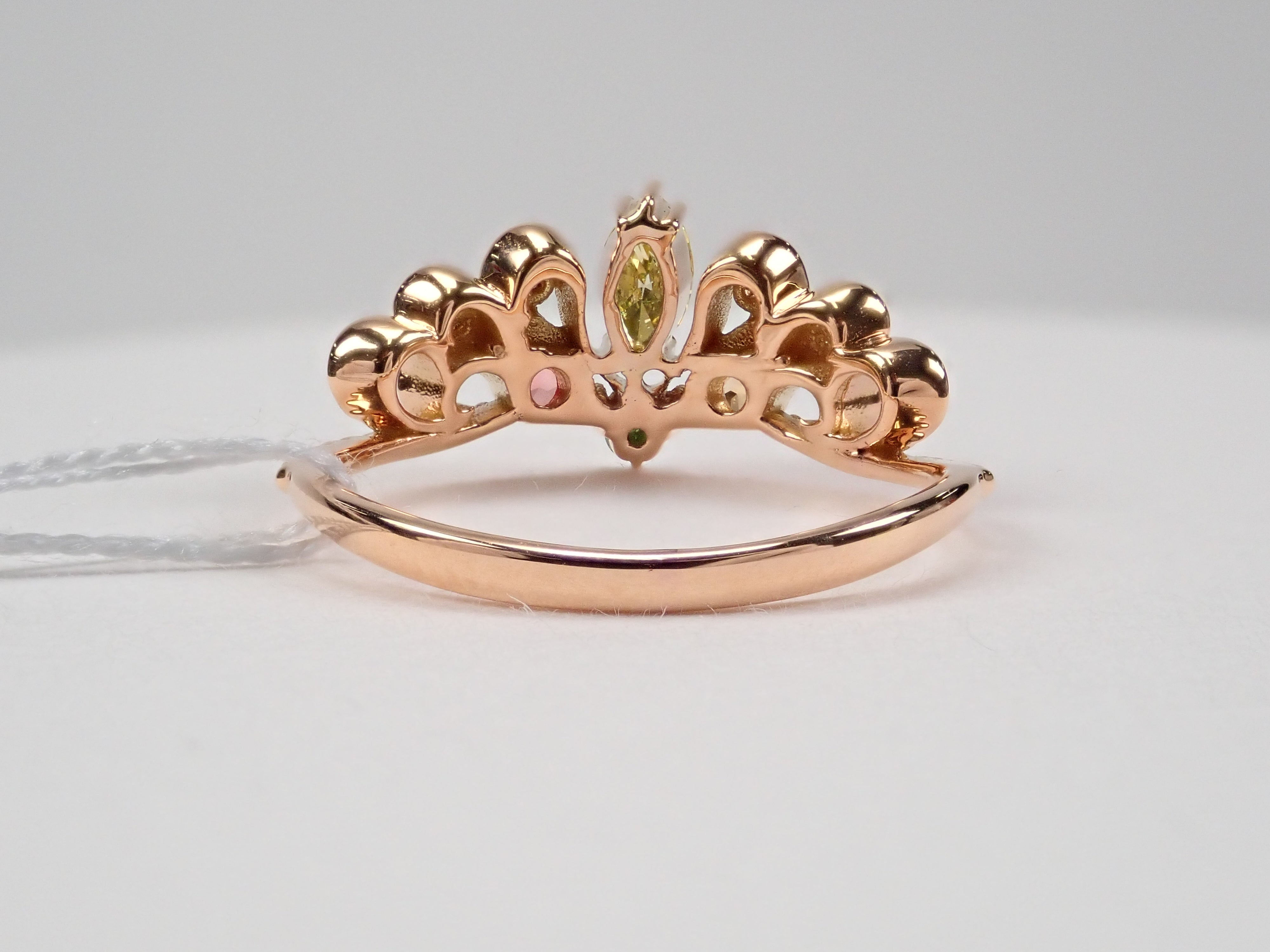 這枚戒指採用金絲雀黃鑽石,經過分選後呈現出鮮豔的黃色。鑽石的顏色為濃彩綠黃色,尺寸為 0.214 克拉。由於它是 SI-1,因此它是一顆高度透明的鑽石,其內含物很難用肉眼察覺。當暴露在黑光下時,它會發出黃綠色螢光。戒指鑲有亞歷山大變石和彩色藍寶石,並具有華麗的皇冠式設計。