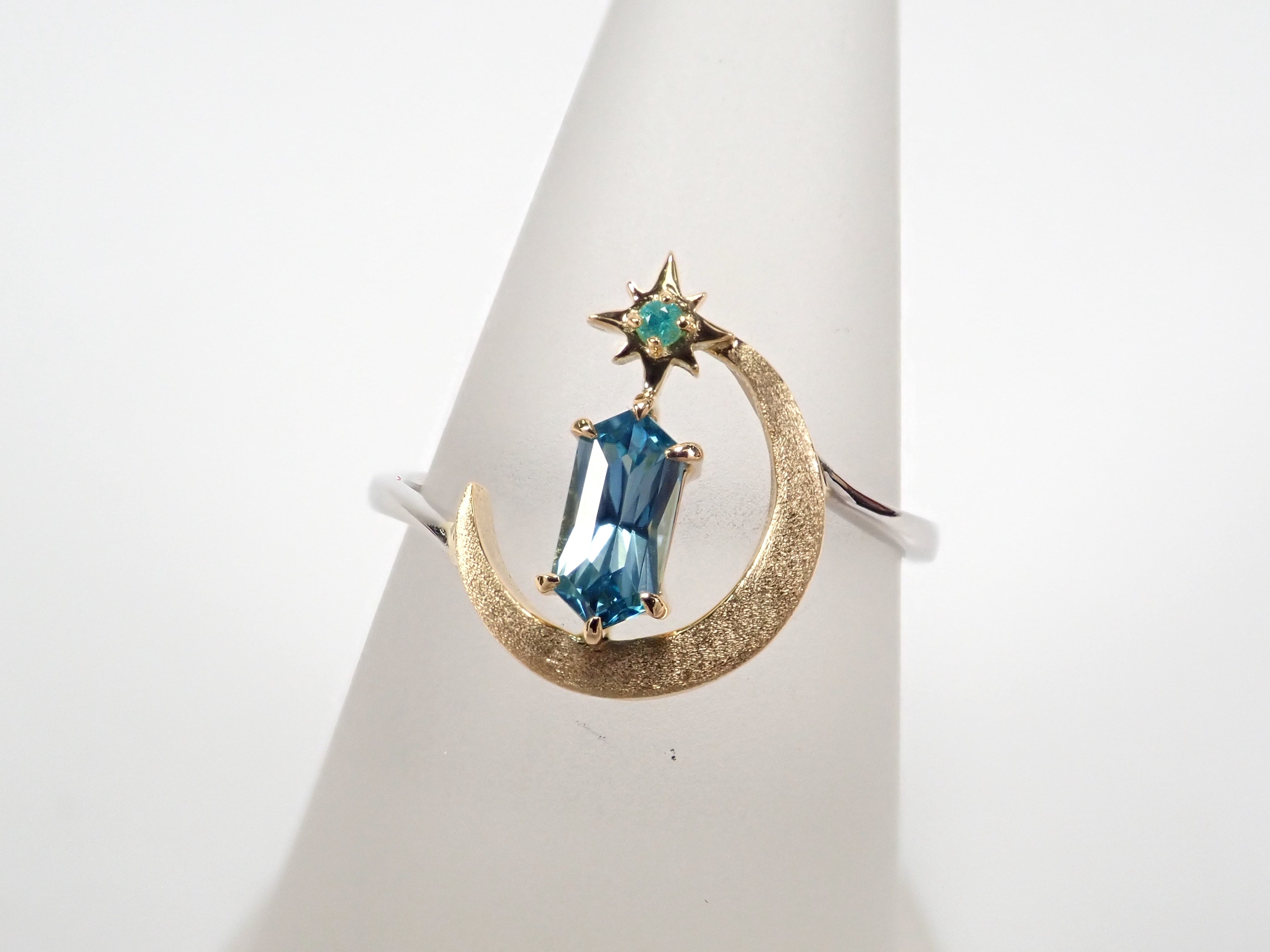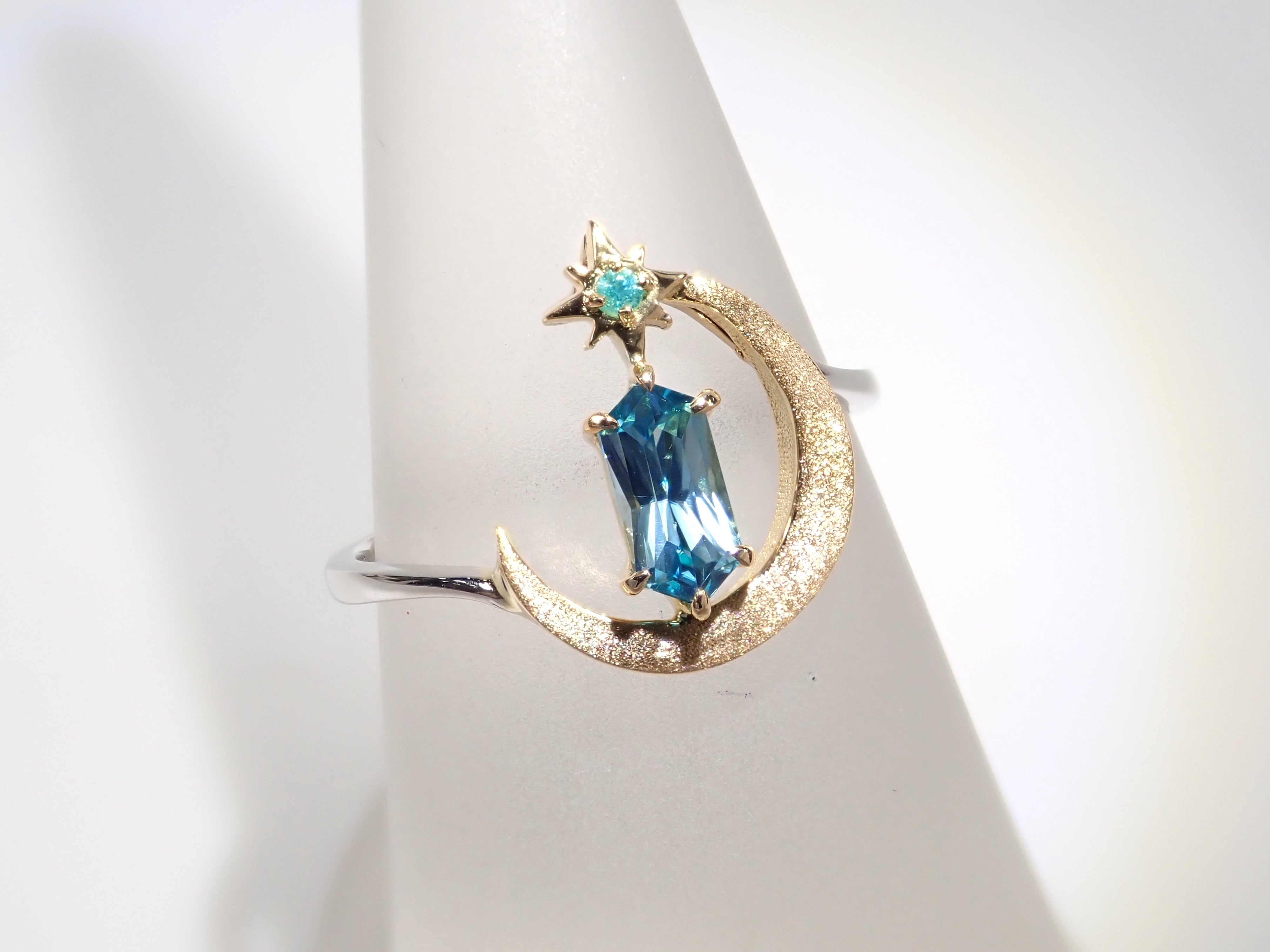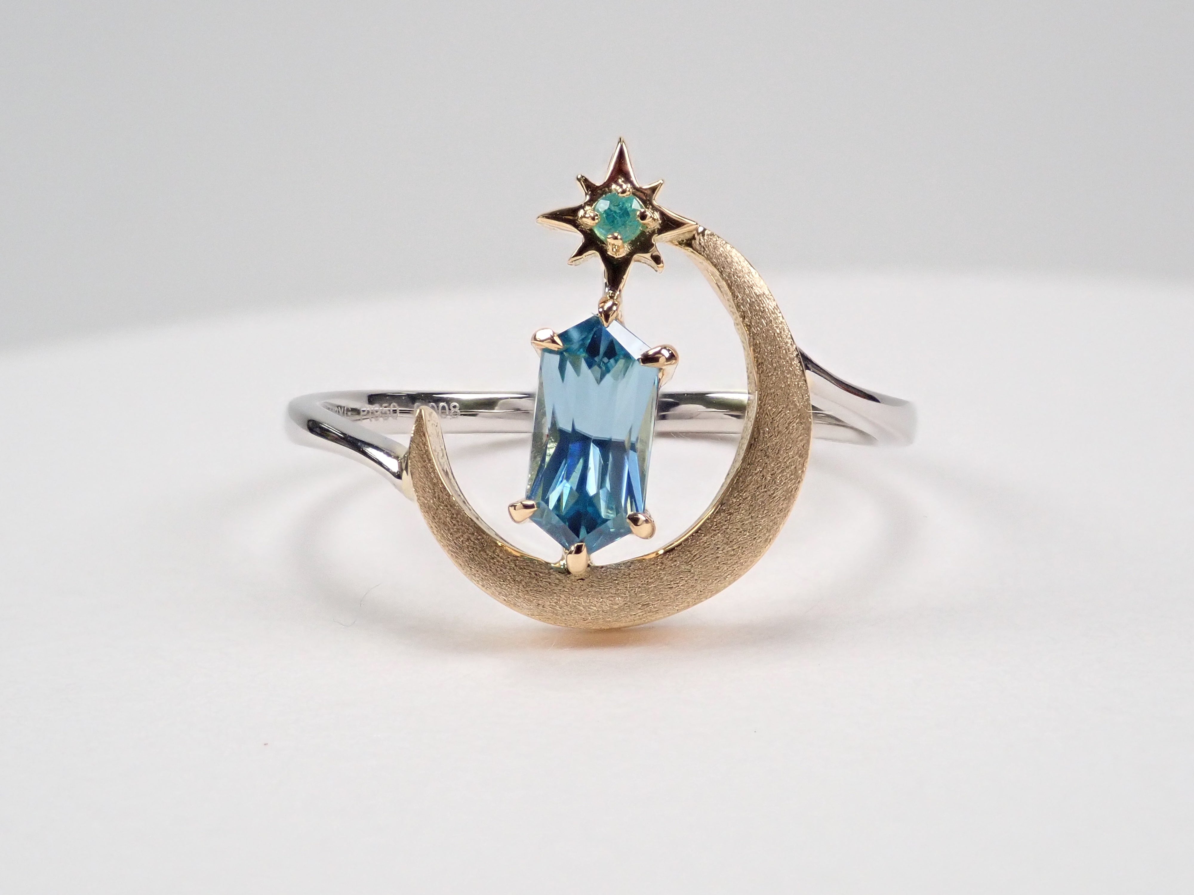 這枚戒指採用柬埔寨產藍鋯石打造。主石重0.48克拉,副石為產自巴西的帕拉伊巴碧璽(巴塔利亞礦)。藍鋯石鑲嵌的月亮圖案設計精美絕倫。此外,戒指的戒托和戒託的材質和紋理各不相同,並採用獨特的卡拉茲鑲嵌工藝。藍鋯石由斯里蘭卡切割大師桑傑切割而成。