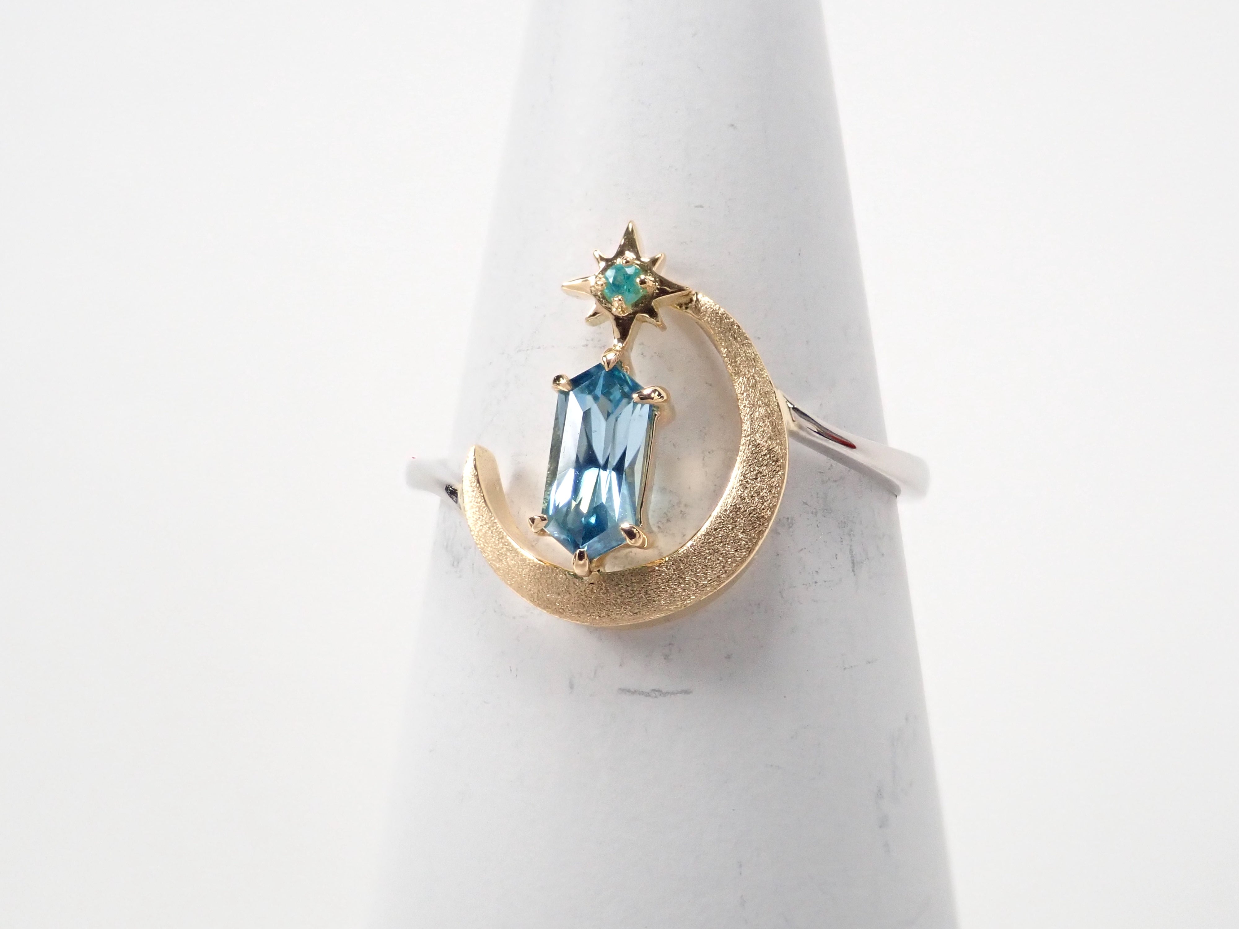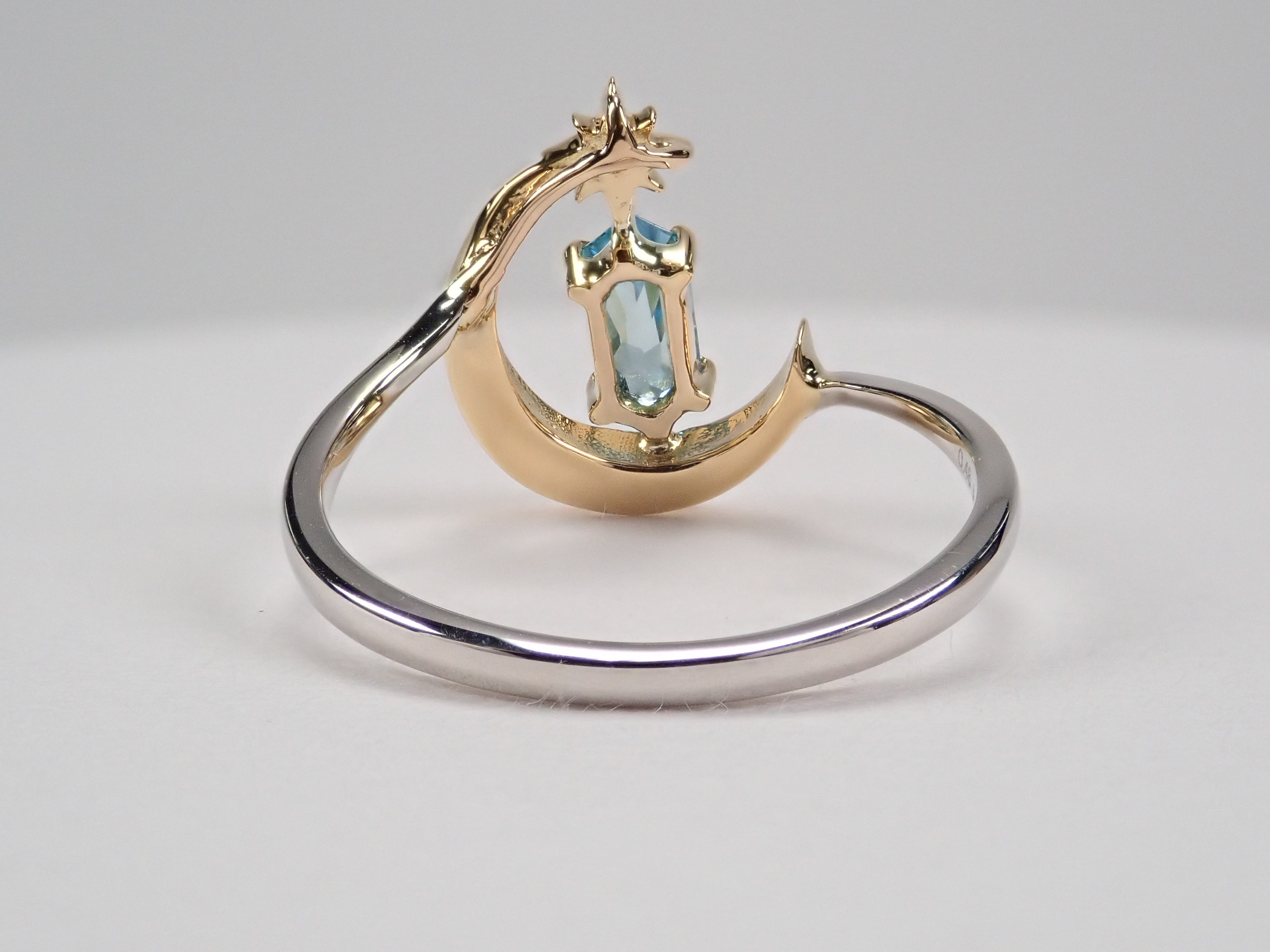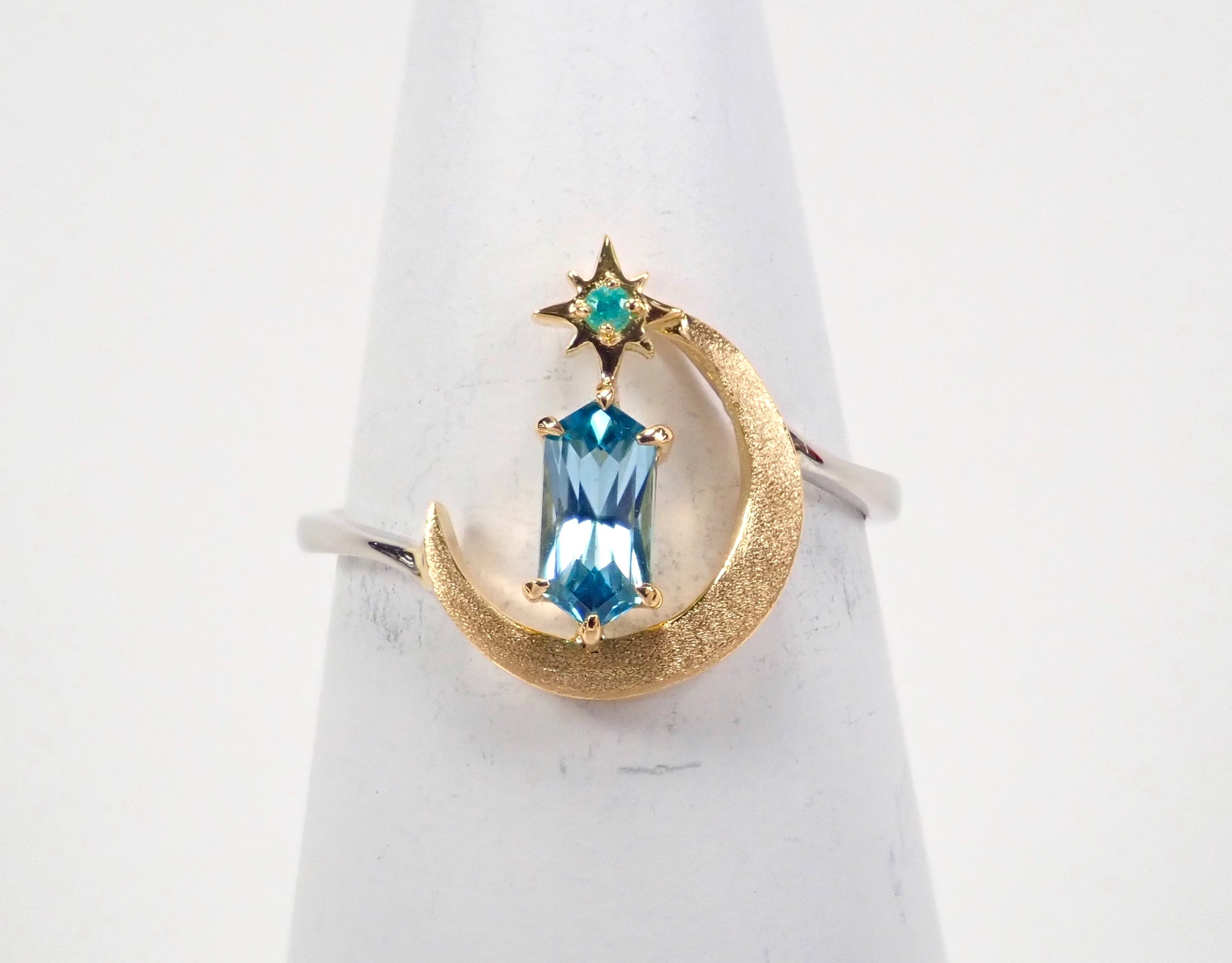 這枚戒指採用柬埔寨產藍鋯石打造。主石重0.48克拉,副石為產自巴西的帕拉伊巴碧璽(巴塔利亞礦)。藍鋯石鑲嵌的月亮圖案設計精美絕倫。此外,戒指的戒托和戒託的材質和紋理各不相同,並採用獨特的卡拉茲鑲嵌工藝。藍鋯石由斯里蘭卡切割大師桑傑切割而成。