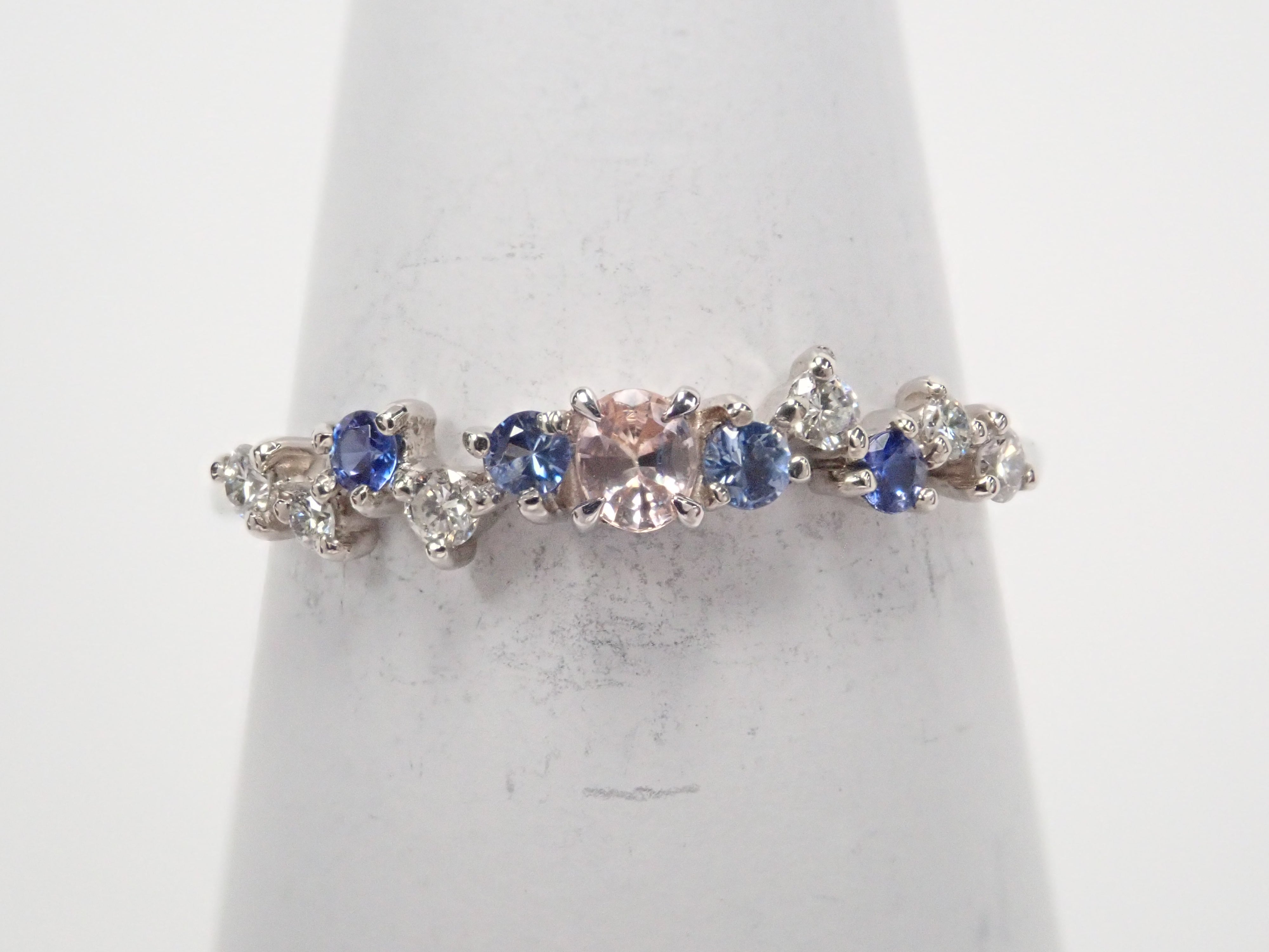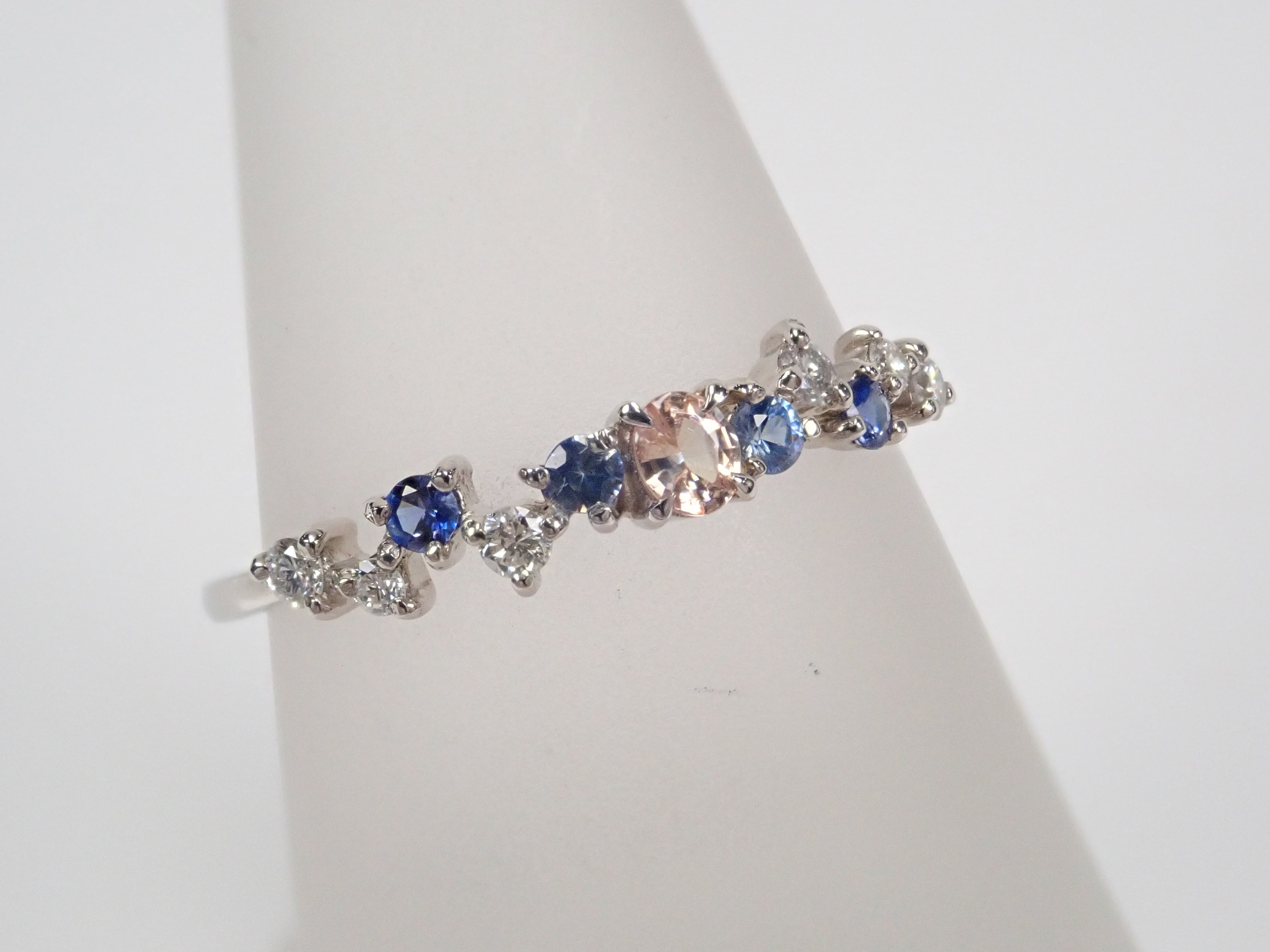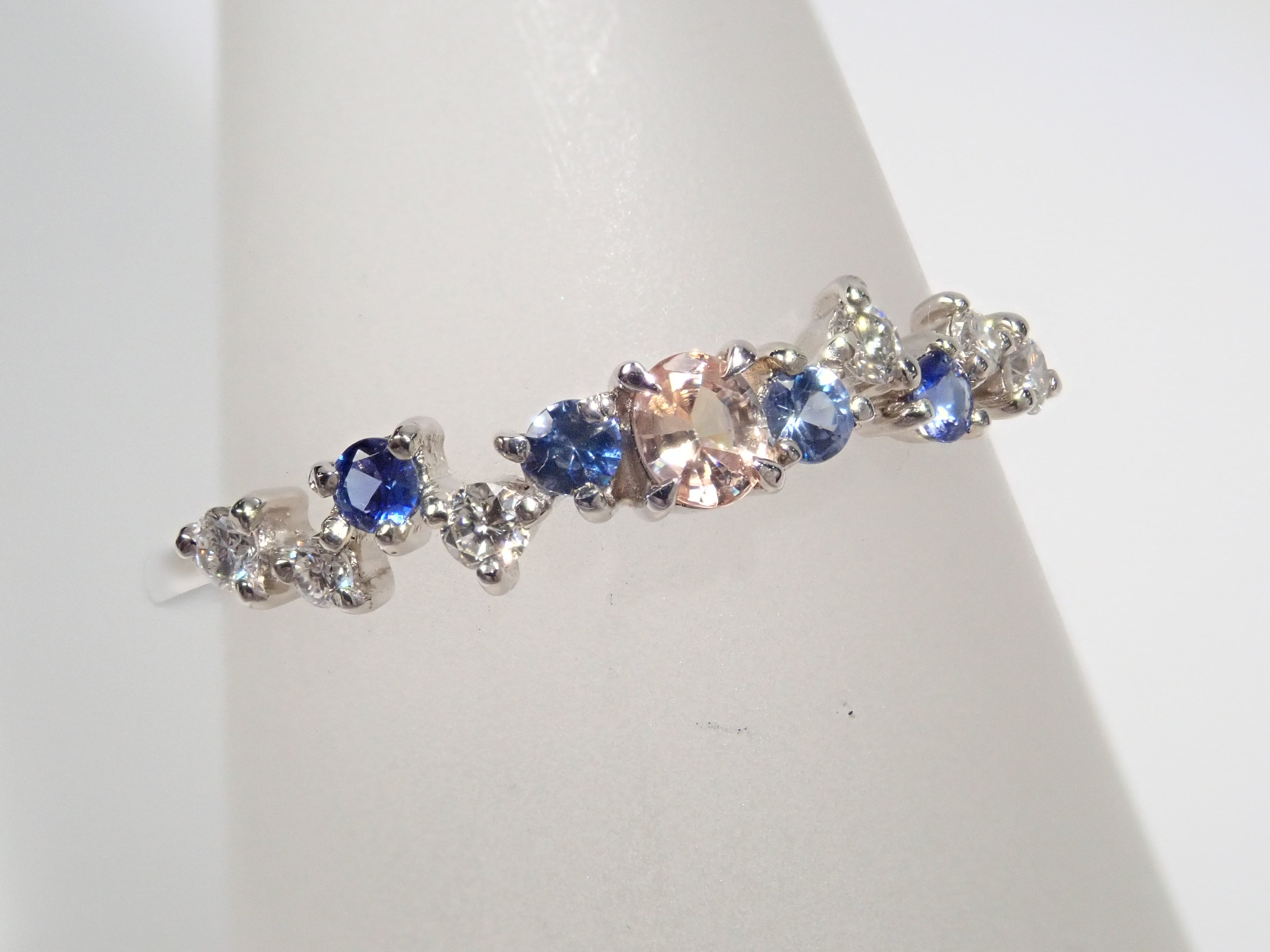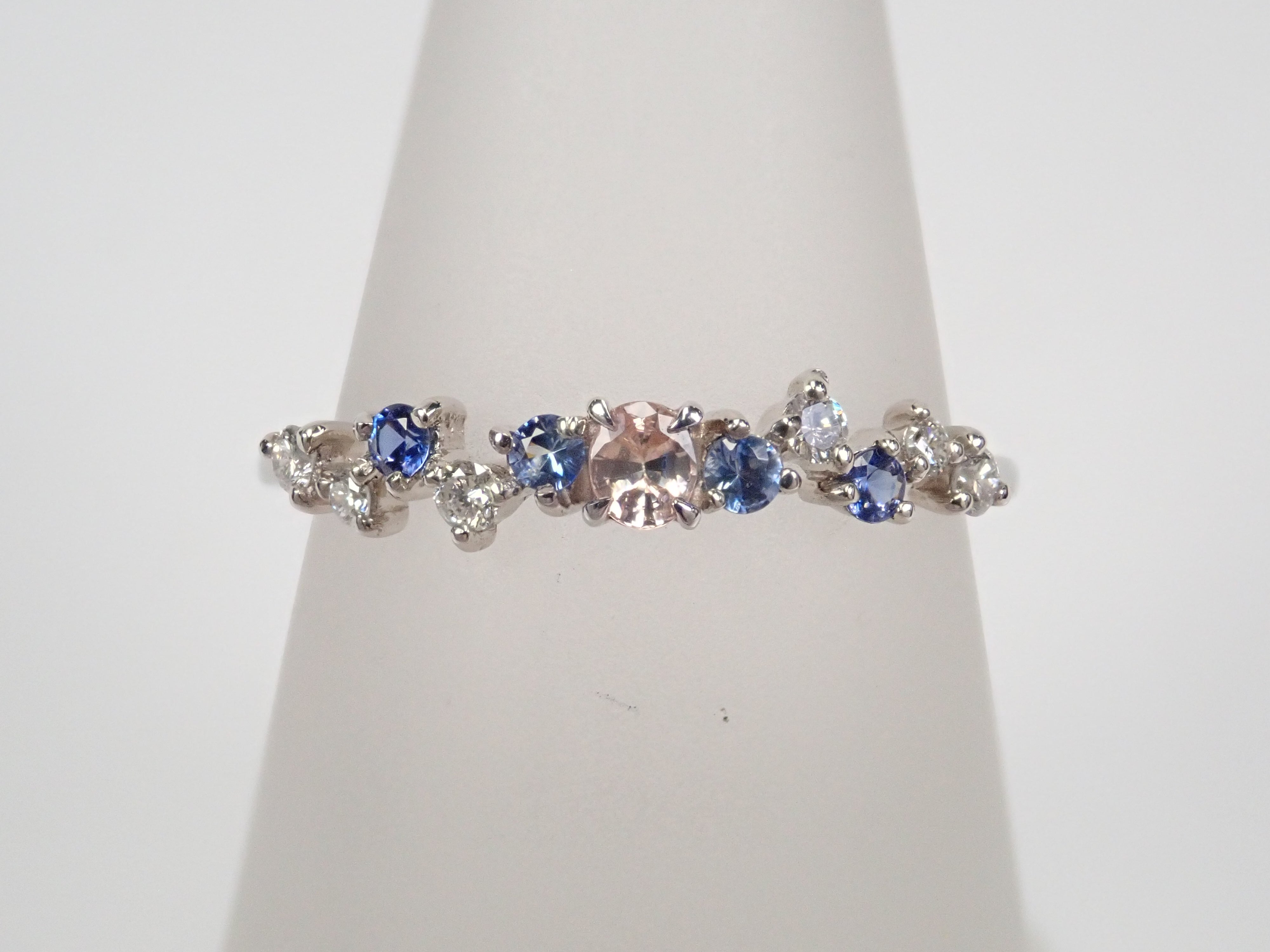 一枚戒指,主石鑲有橘色藍錐礦。副石為藍色藍錐礦和鑽石,是一款可以充分欣賞稀有藍錐礦的戒指。明亮的藍色藍錐礦與柔和的橙色藍錐礦相得益彰,閃閃發光的鑽石也是亮點。