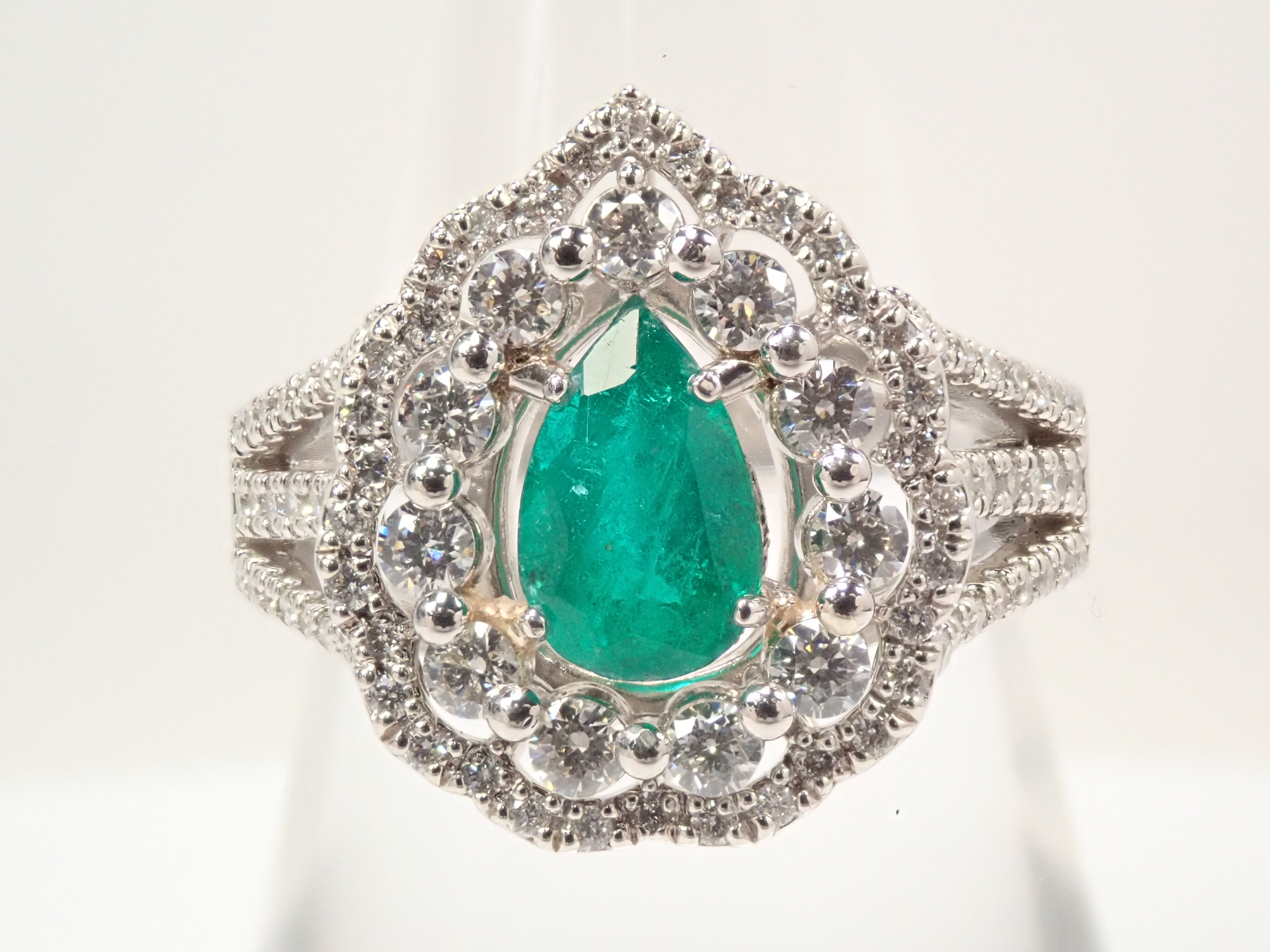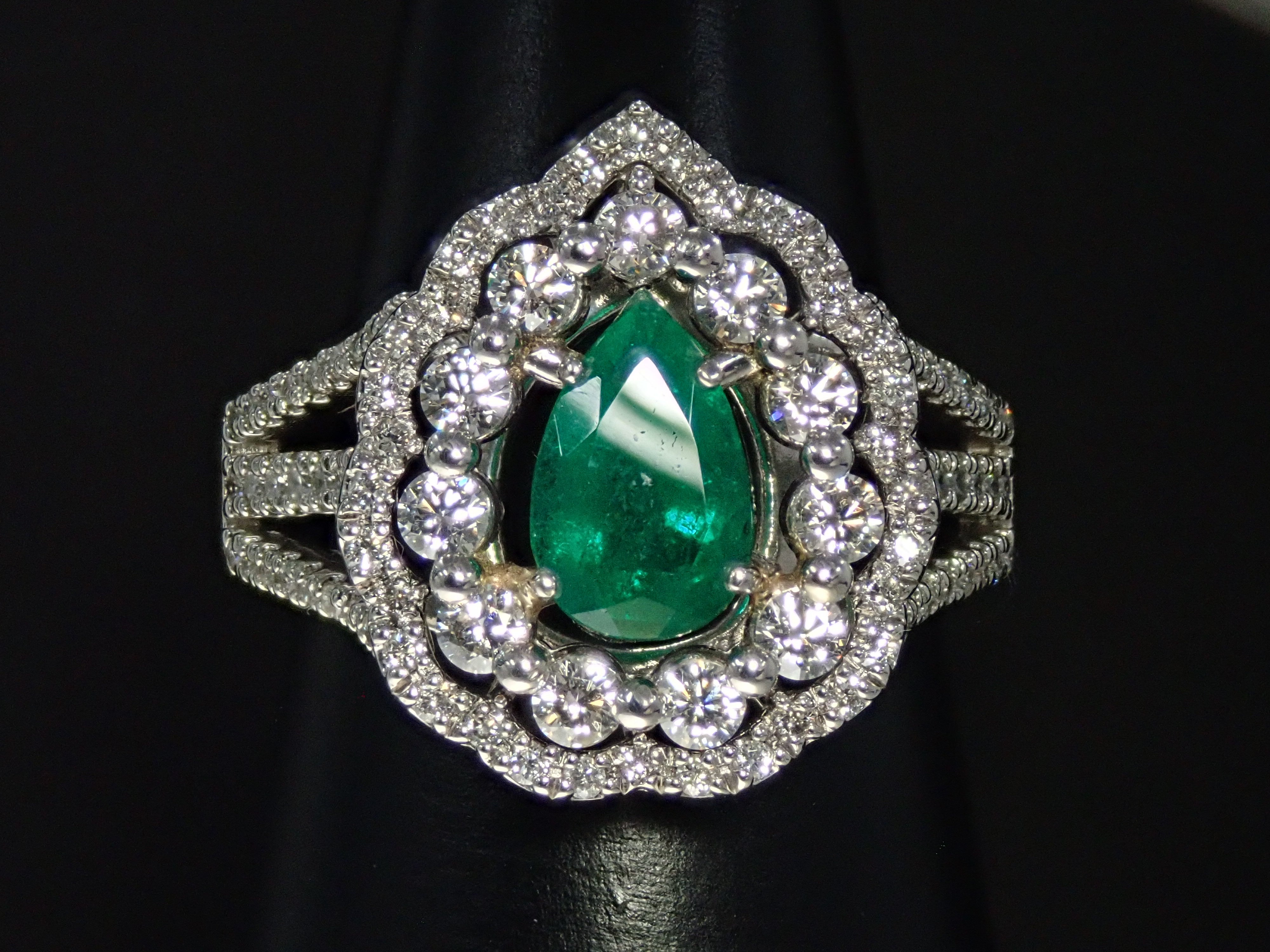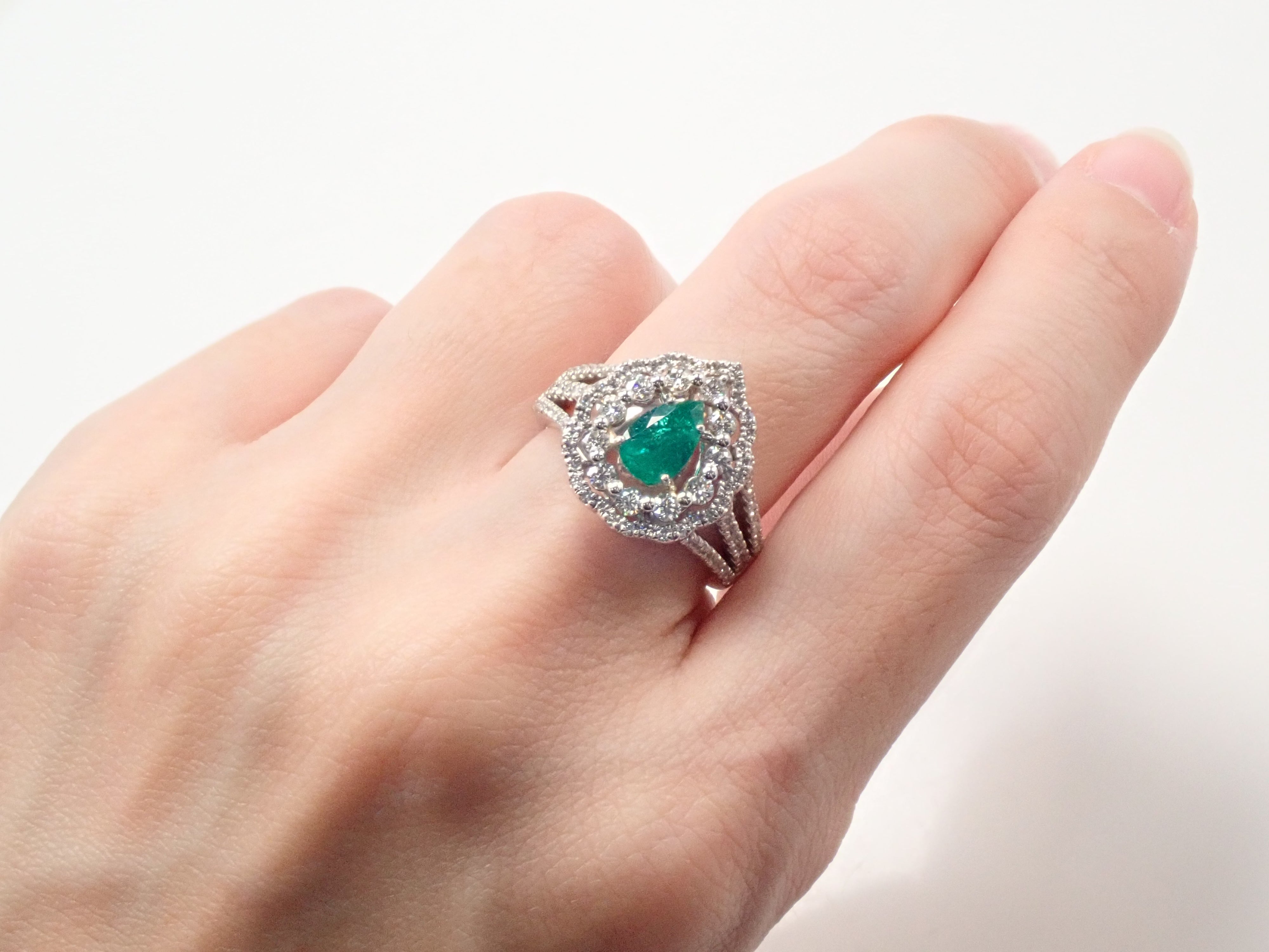 這枚戒指採用的是一顆哥倫比亞祖母綠。這顆祖母綠重0.72克拉,梨形的尺寸絕對引人注目。側邊鑲嵌的鑽石也擁有高通透度,相當於VS級,閃耀奪目。如同層層疊疊的精緻蕾絲般華麗的設計也令人心動不已。