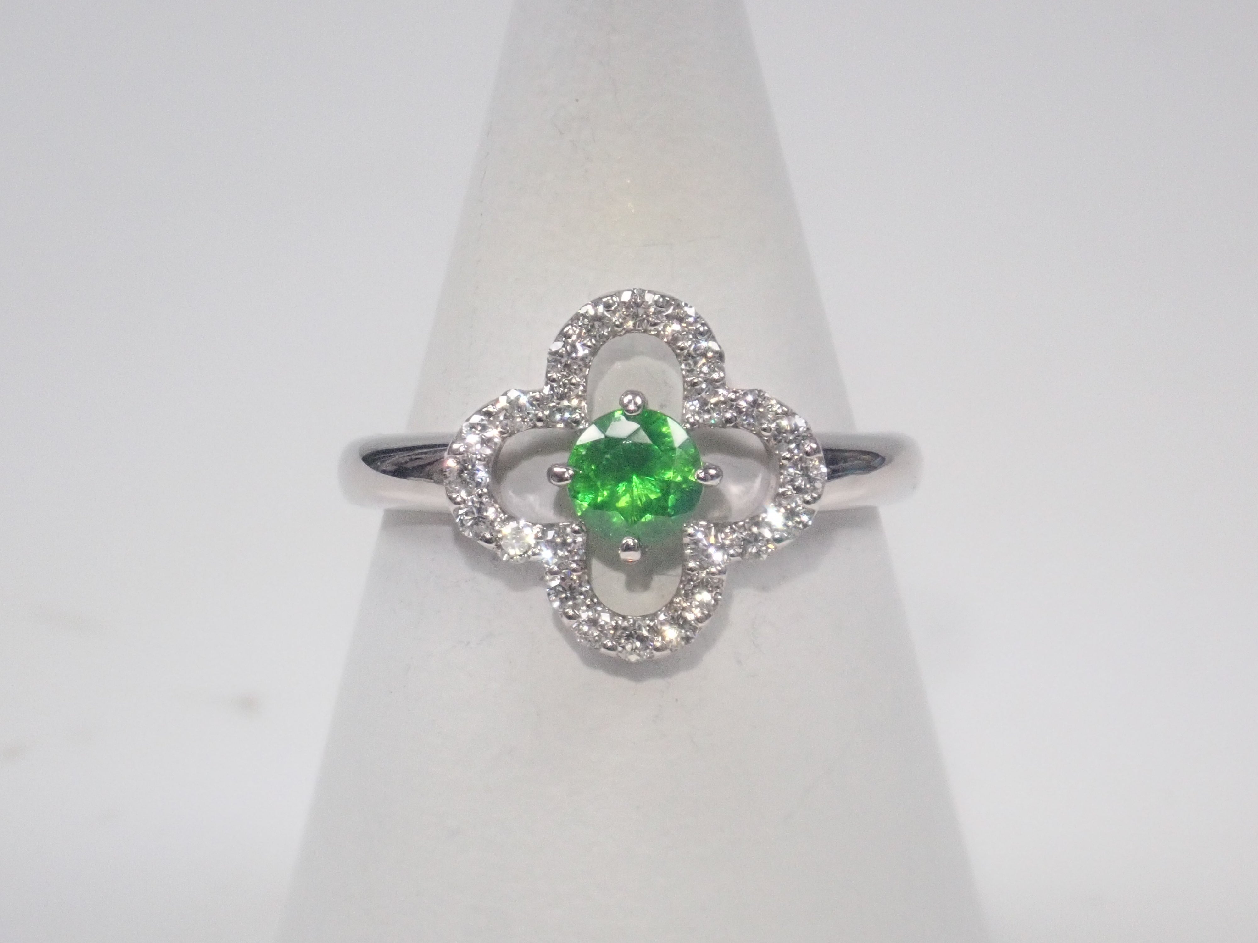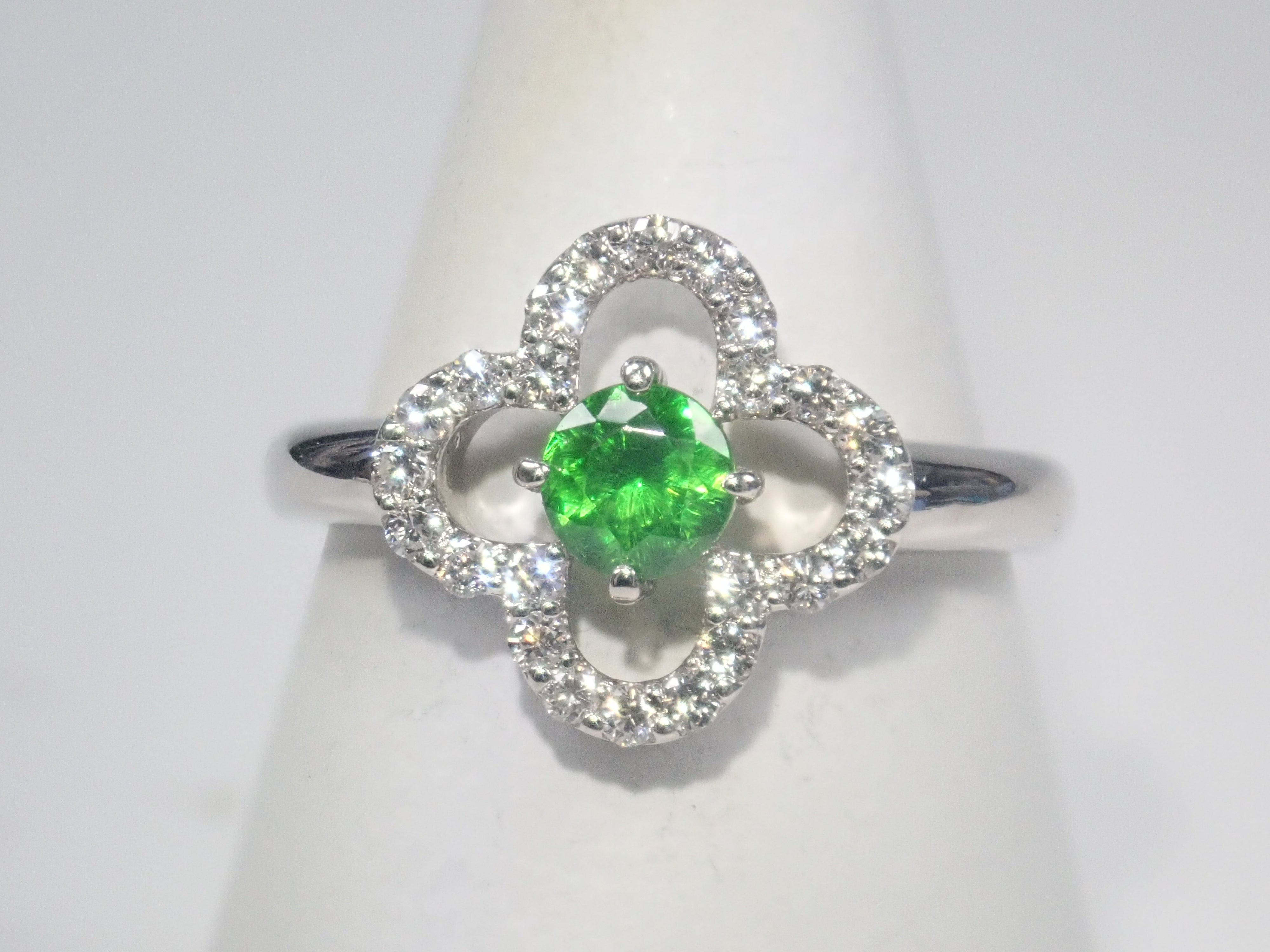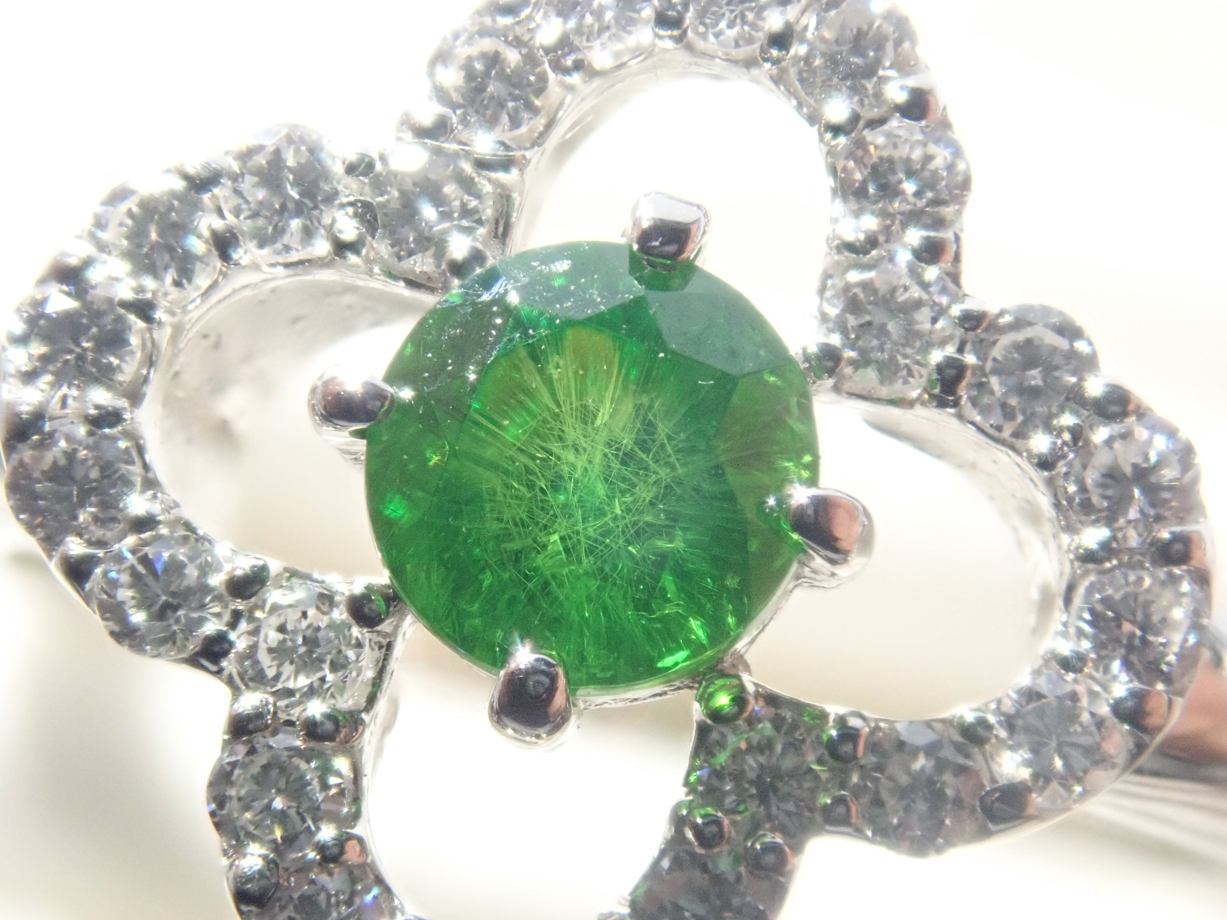 這枚戒指由俄羅斯翠榴石製成。翠榴石直徑約4.3毫米,重0.33克拉。它含有馬尾狀內含物,其鮮豔的綠色令人驚艷。側面鑲嵌的鑽石重0.48克拉,為VS級,透明度極高。 俄羅斯翠榴石直徑約4.3毫米。