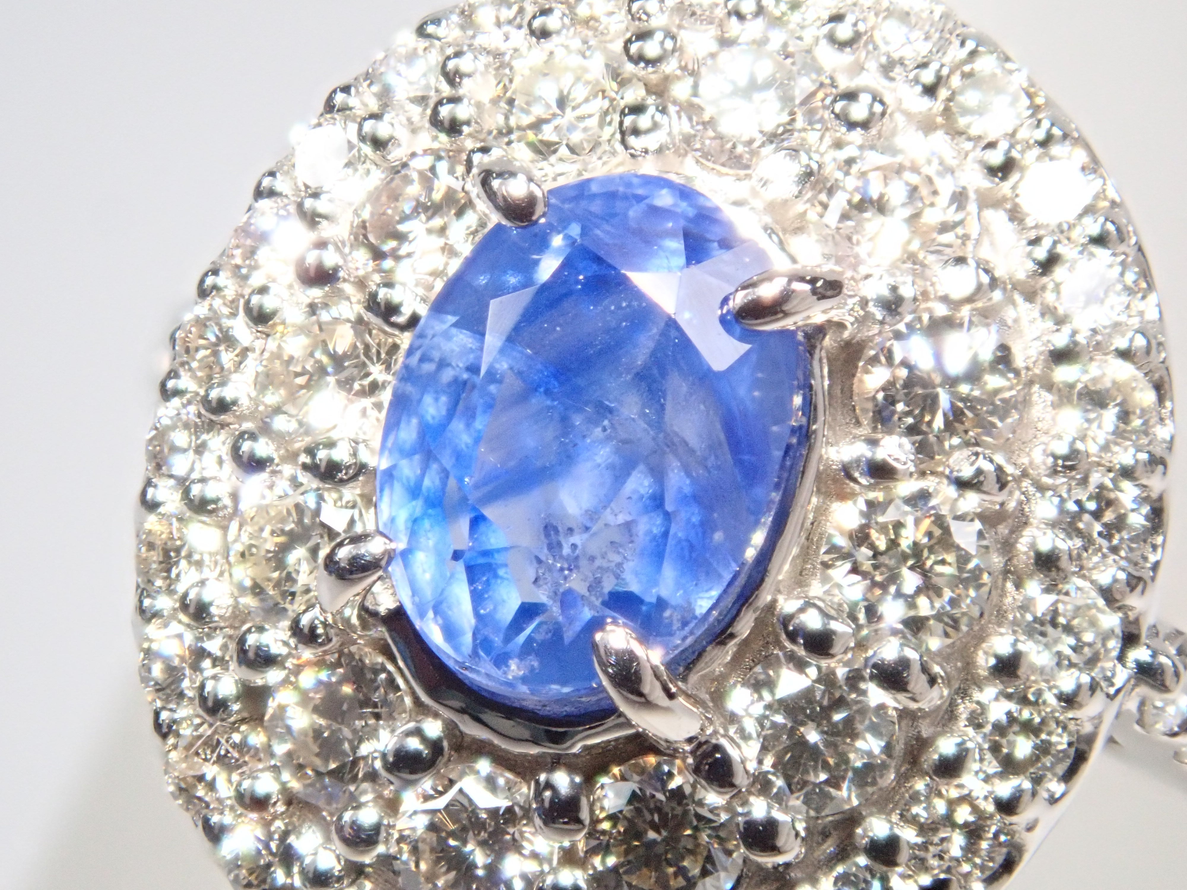 這枚戒指採用一顆產自克什米爾的未經熱處理的藍寶石。主石為一顆1.14克拉的克什米爾藍寶石。寶石級的克什米爾藍寶石僅少量供應,重量超過1克拉。它擁有克什米爾藍寶石獨有的絲滑柔和的色澤。藍寶石周圍環繞著三層鑽石,更顯璀璨奪目。側石為VS級鑽石,閃耀奪目。戒指附有GIA證書。
