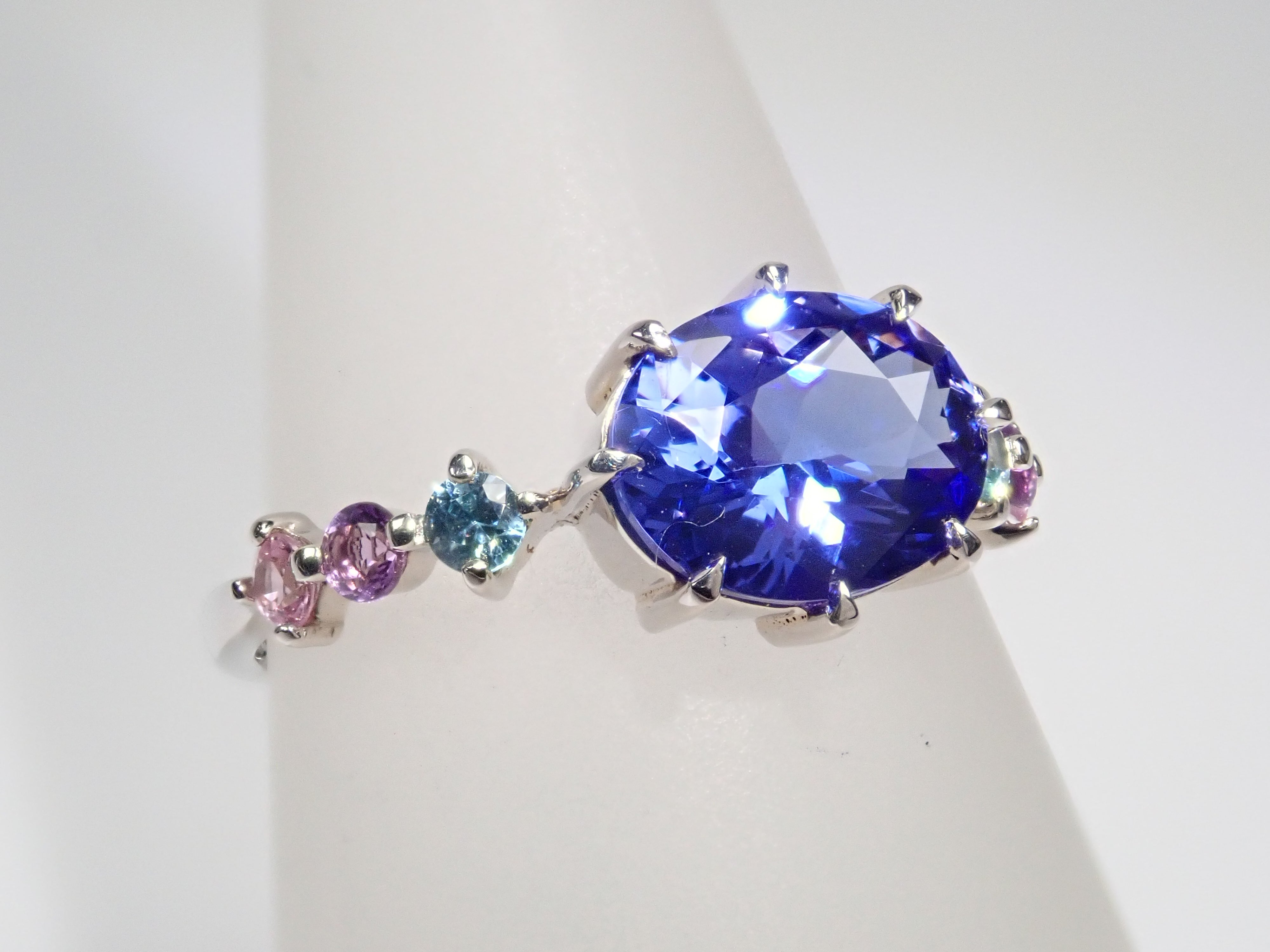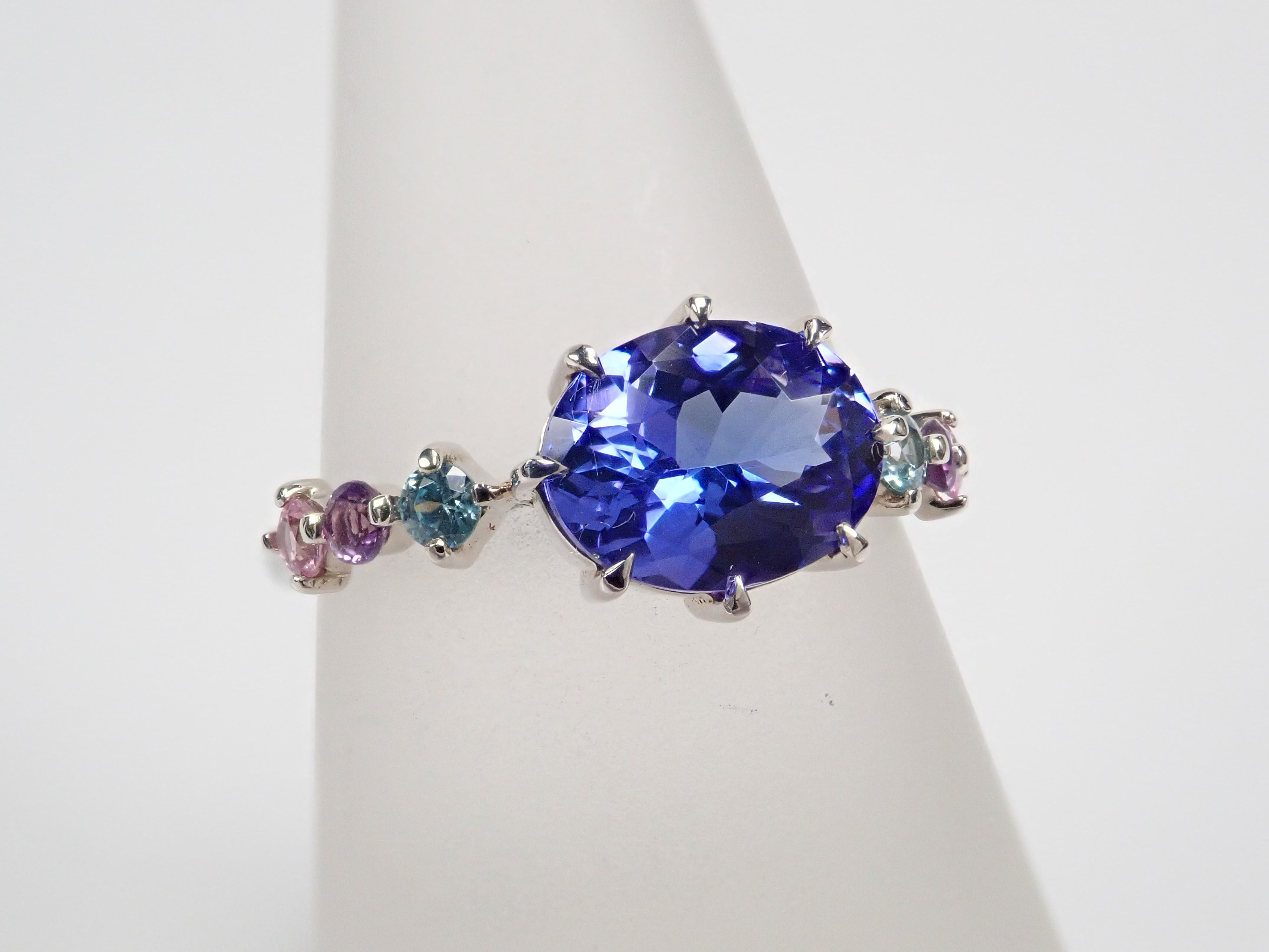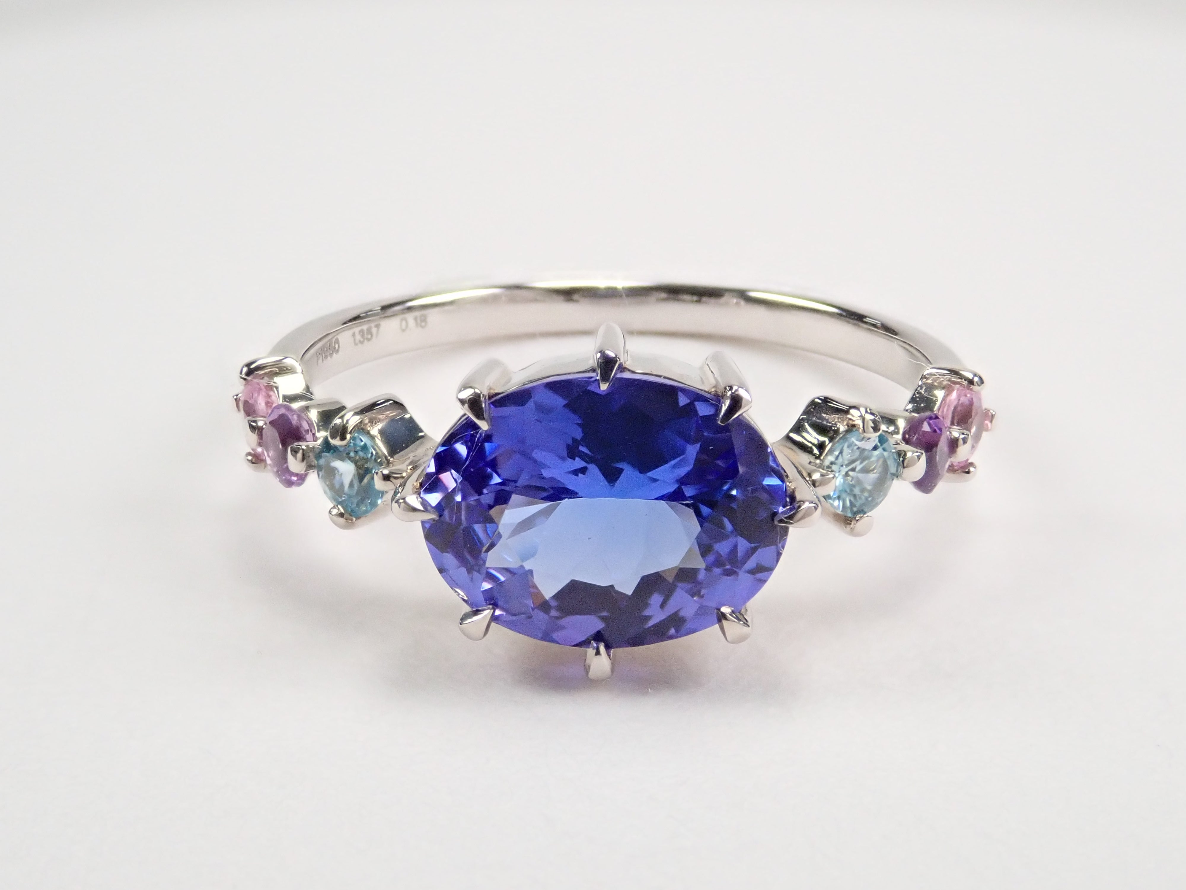 這枚戒指以產自坦尚尼亞的坦桑石為主要特色。這款坦桑石尺寸驚人,隨著角度變化呈現出多變的色彩,並散發出美麗而強烈的光澤。副石則鑲嵌著色彩繽紛的寶石,例如藍色鋯石、紫水晶和粉紅色藍寶石。對於想要欣賞坦桑石魅力的人來說,這枚戒指堪稱完美。