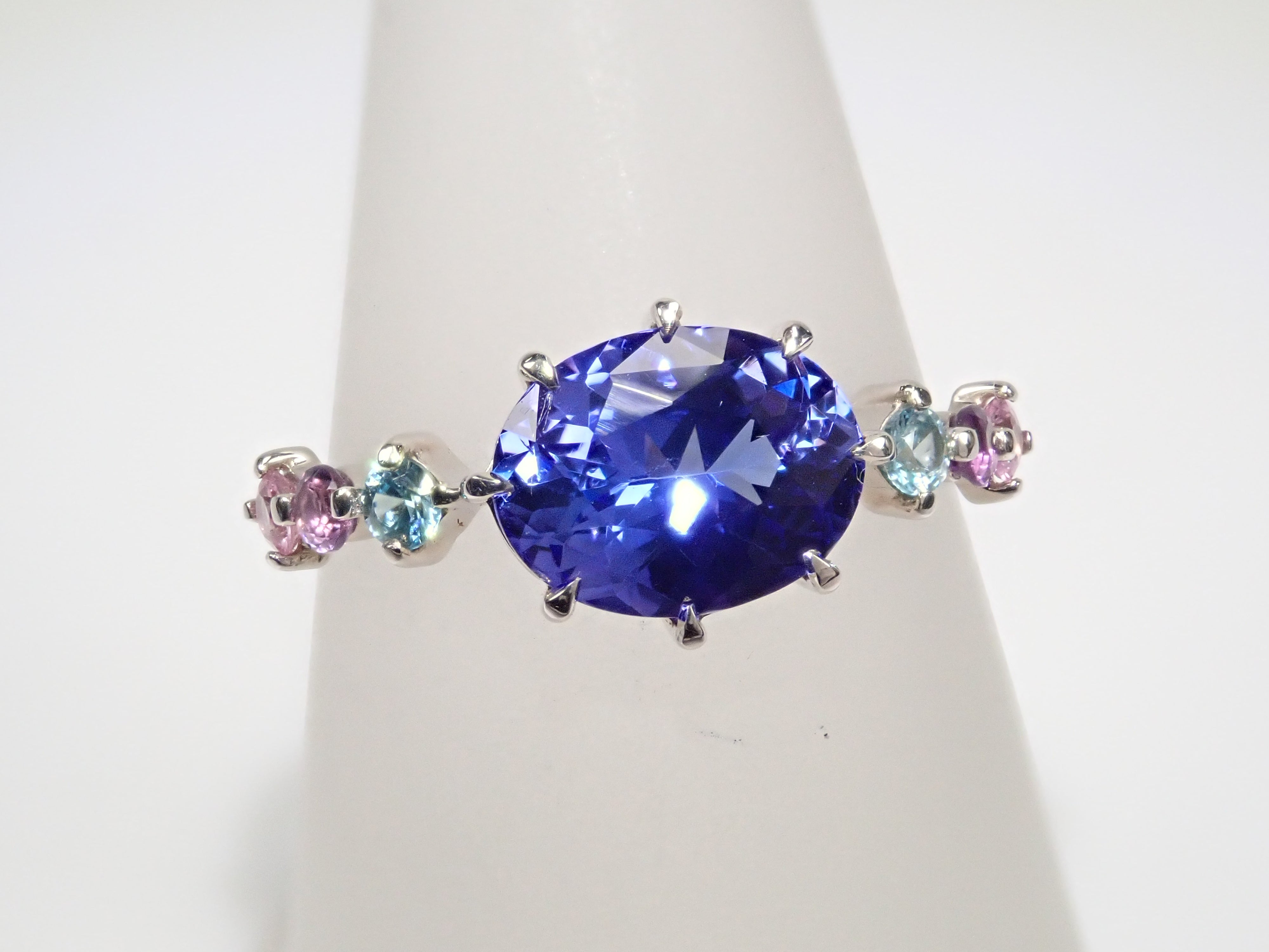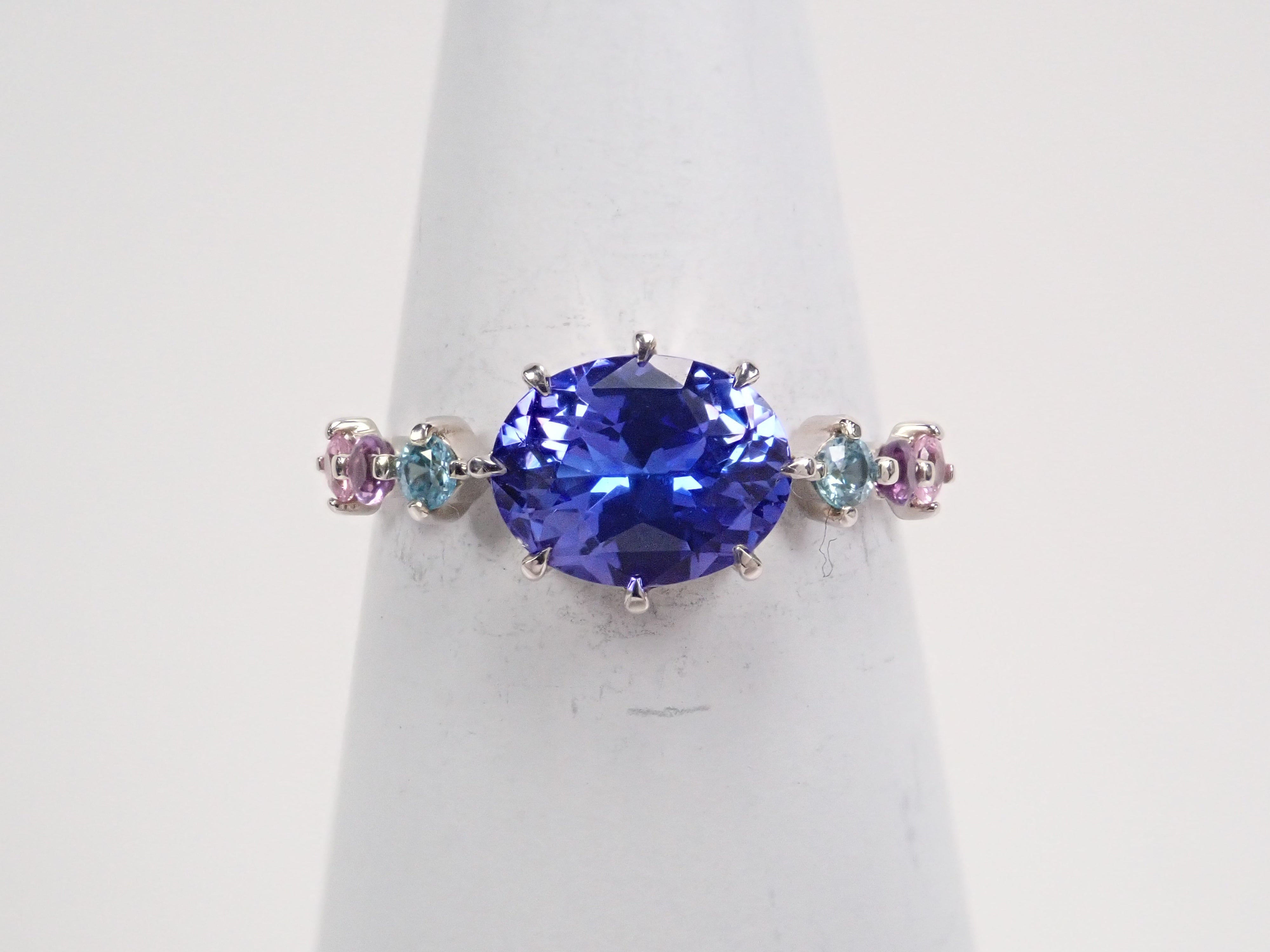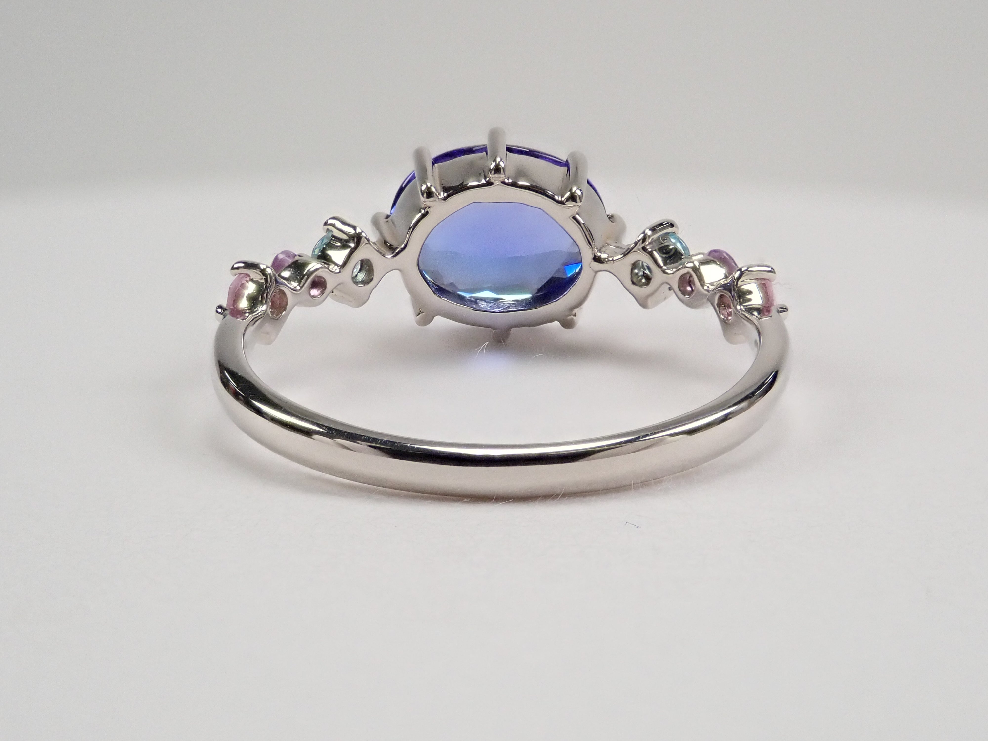 這枚戒指以產自坦尚尼亞的坦桑石為主要特色。這款坦桑石尺寸驚人,隨著角度變化呈現出多變的色彩,並散發出美麗而強烈的光澤。副石則鑲嵌著色彩繽紛的寶石,例如藍色鋯石、紫水晶和粉紅色藍寶石。對於想要欣賞坦桑石魅力的人來說,這枚戒指堪稱完美。