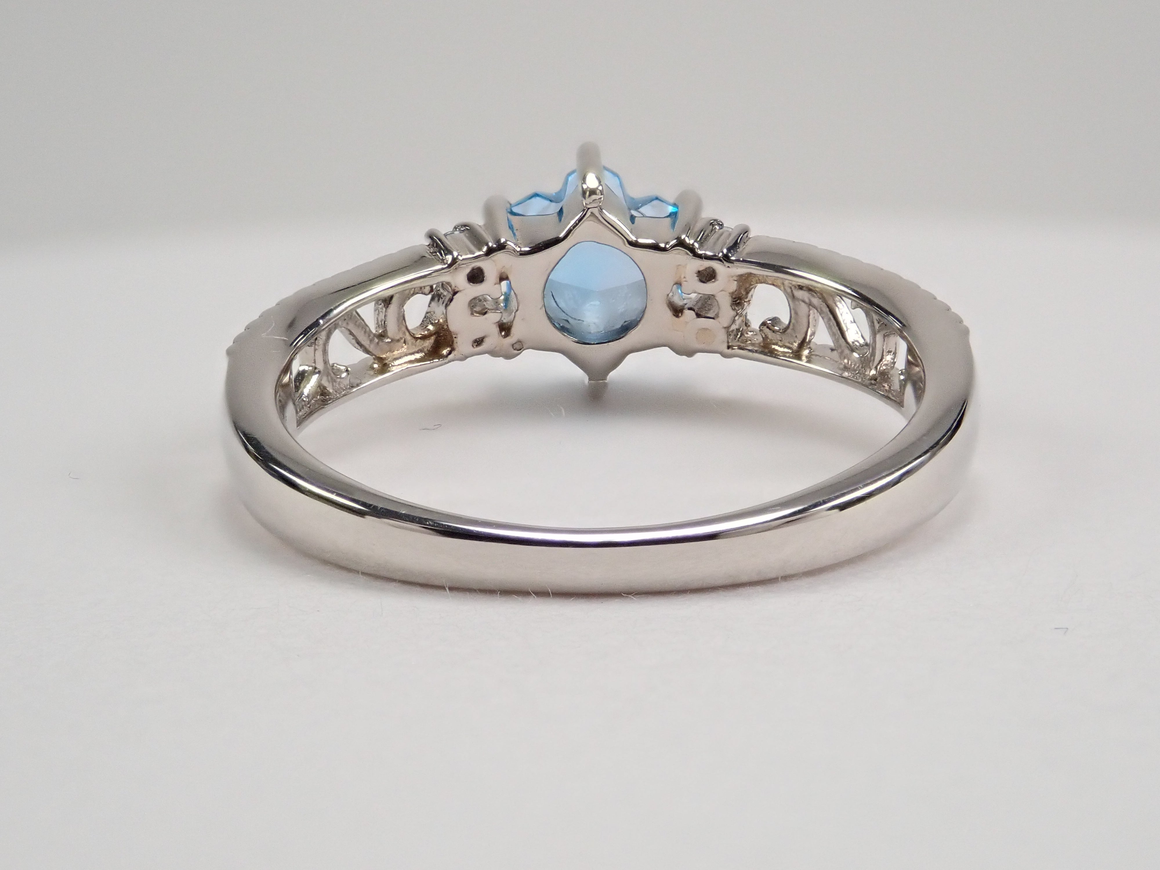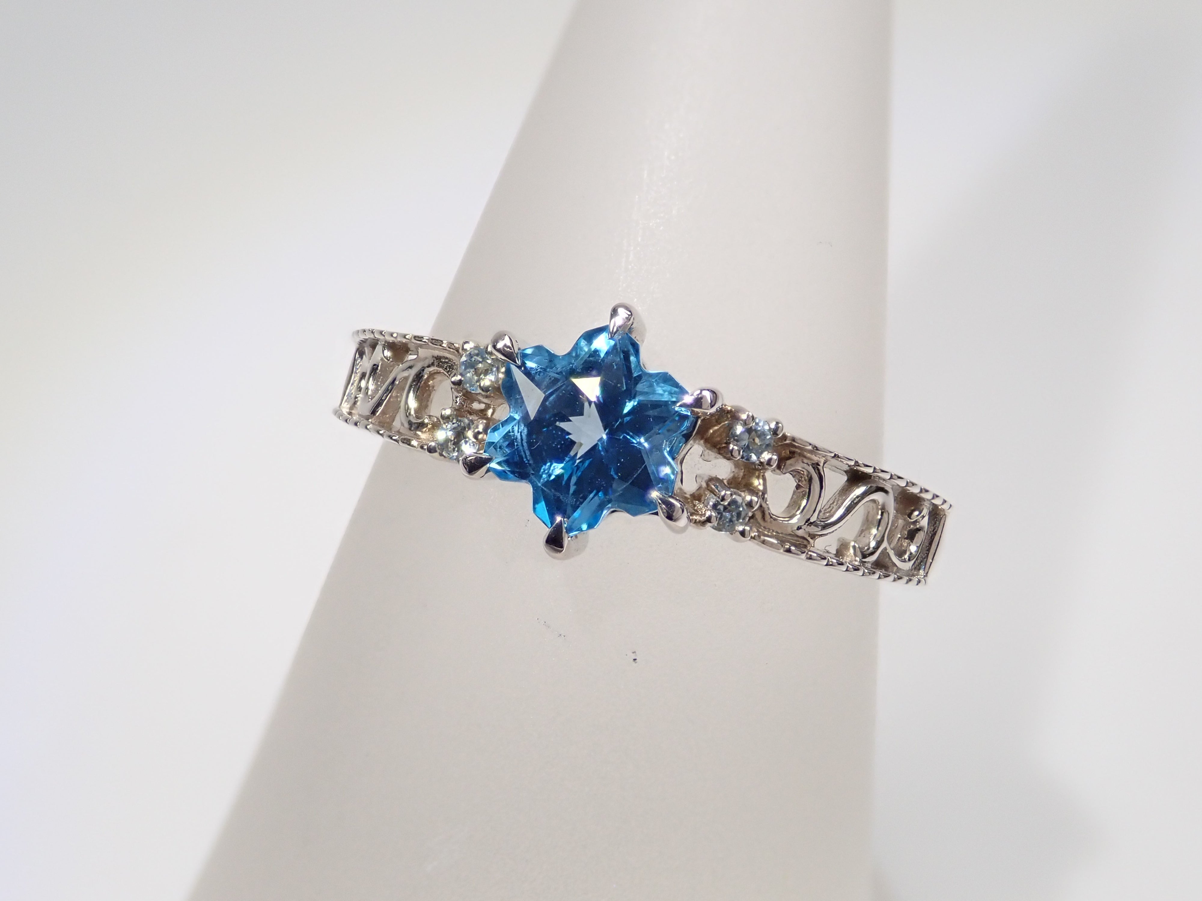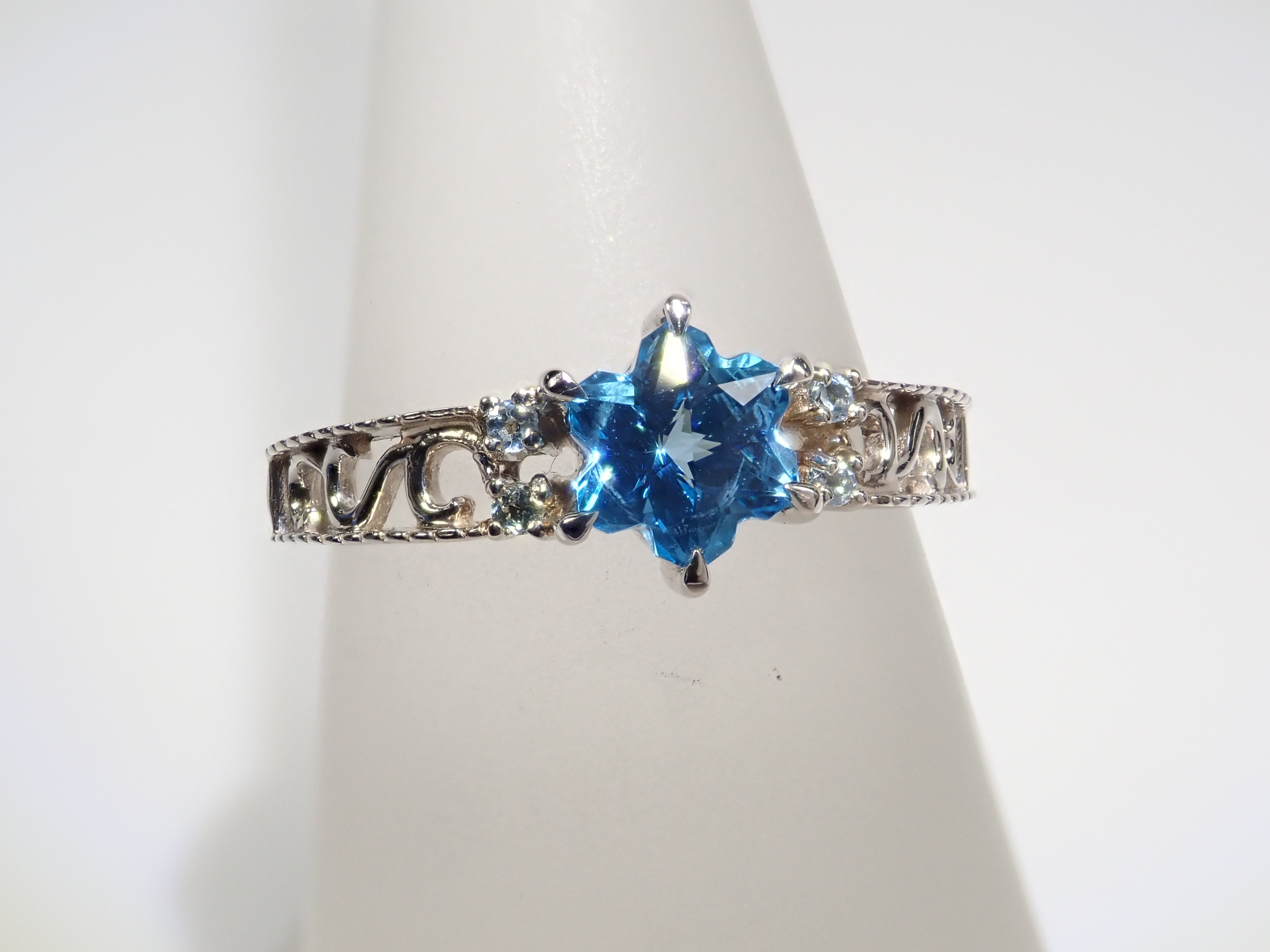 這枚戒指採用來自斯里蘭卡拋光商Sanjay的全新巴西藍色托帕石。這顆瑞士藍托帕石的主石採用極為罕見的花式切割,形狀像花朵。副石為海藍寶石,與主石顏色相得益彰。這款戒指讓您盡情欣賞藍色托帕石的鮮豔色彩和獨特切割。