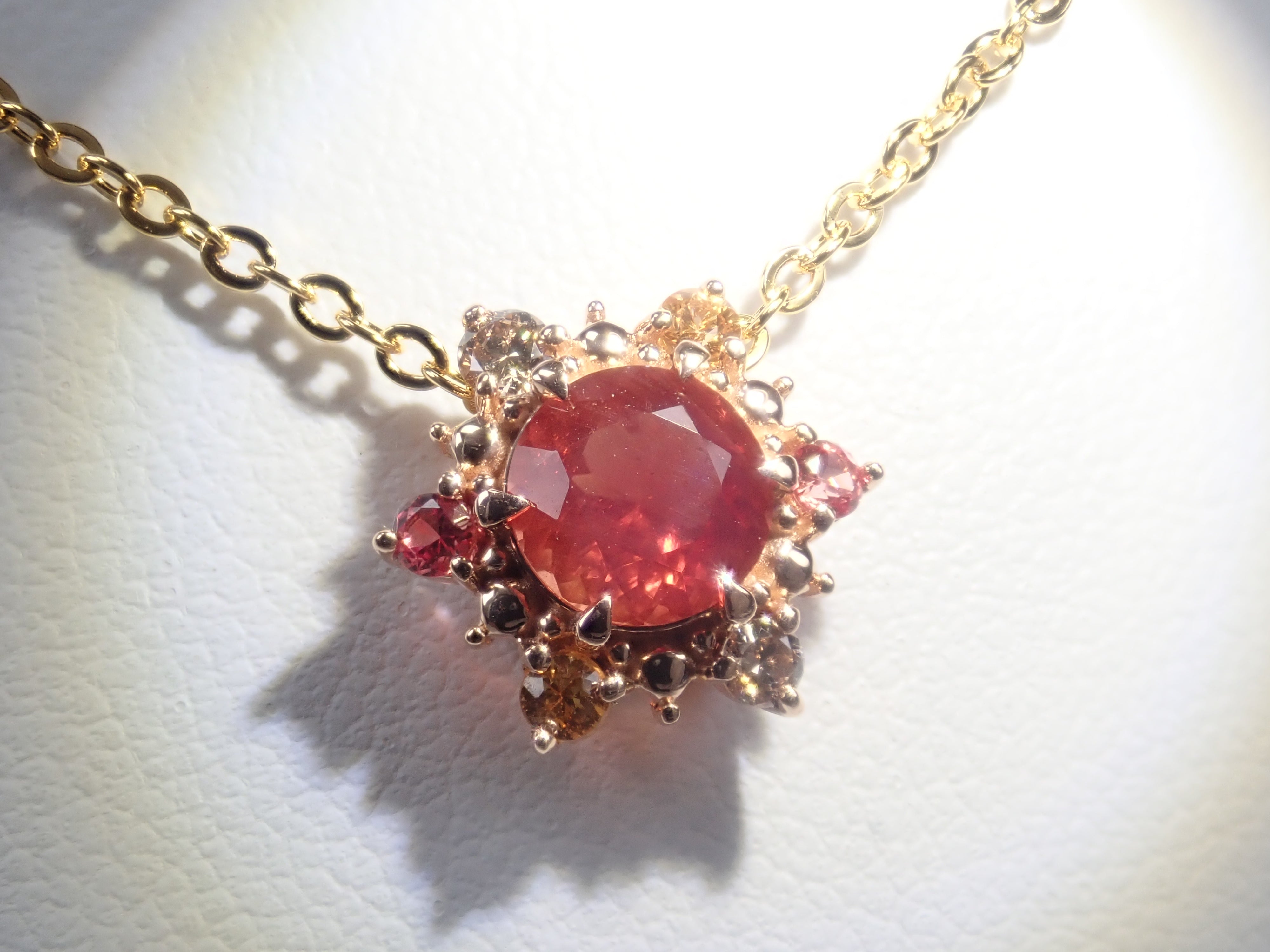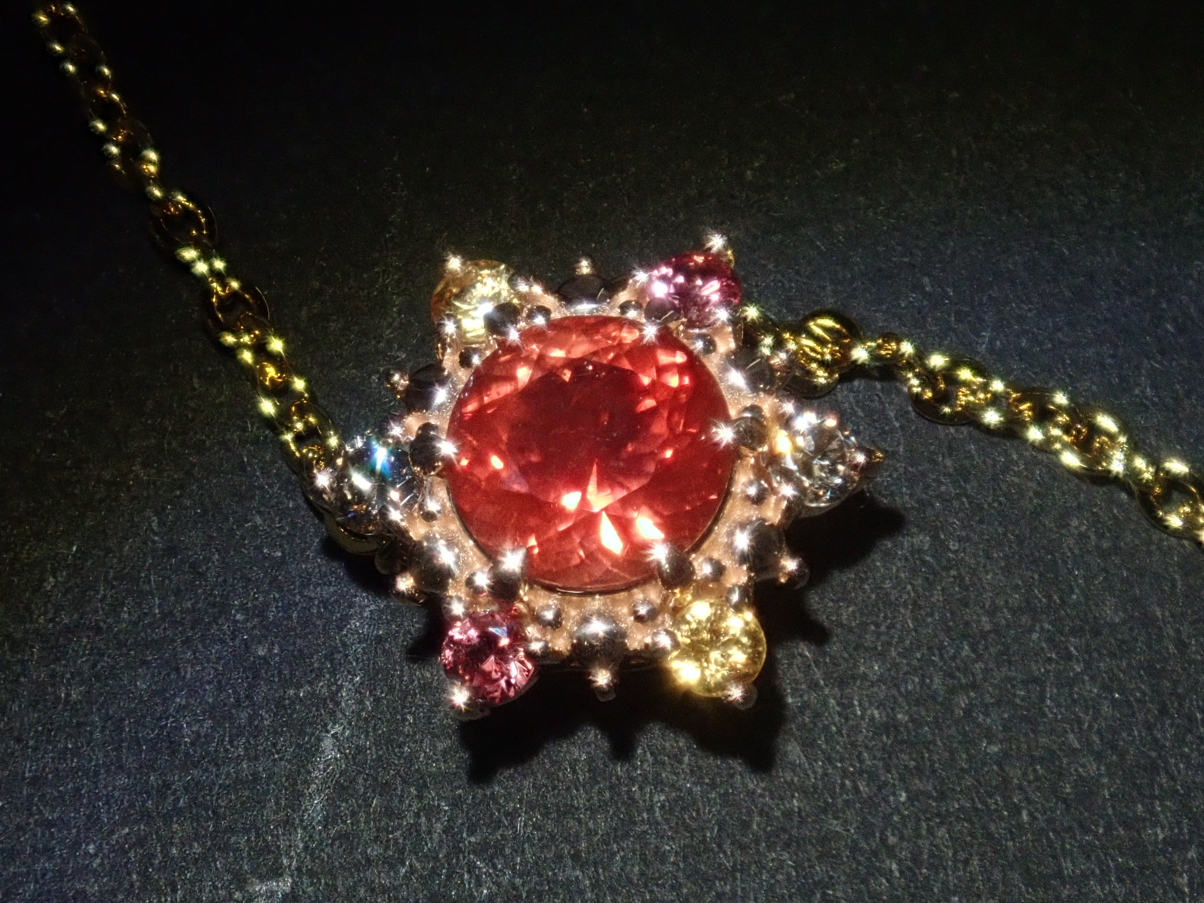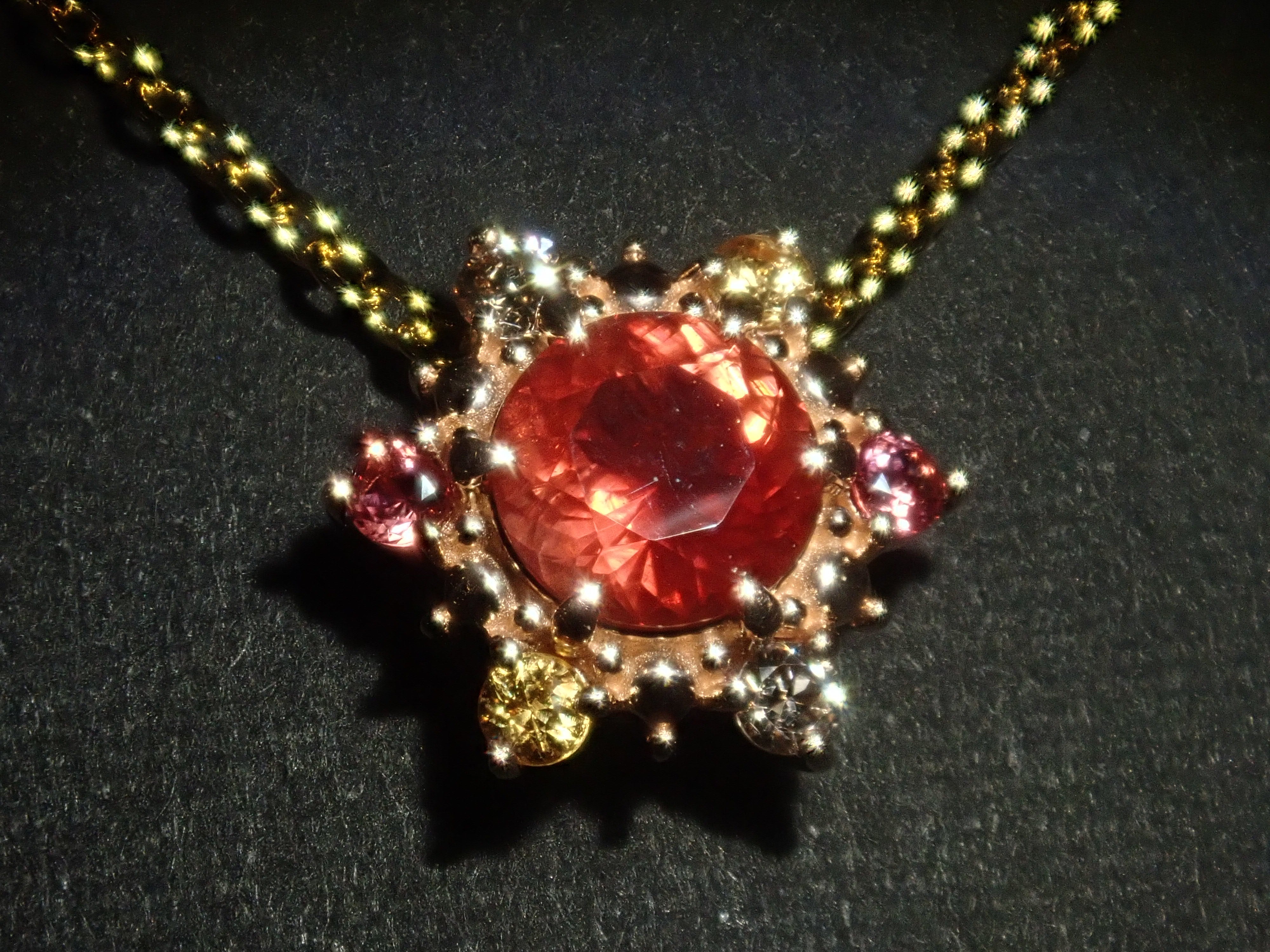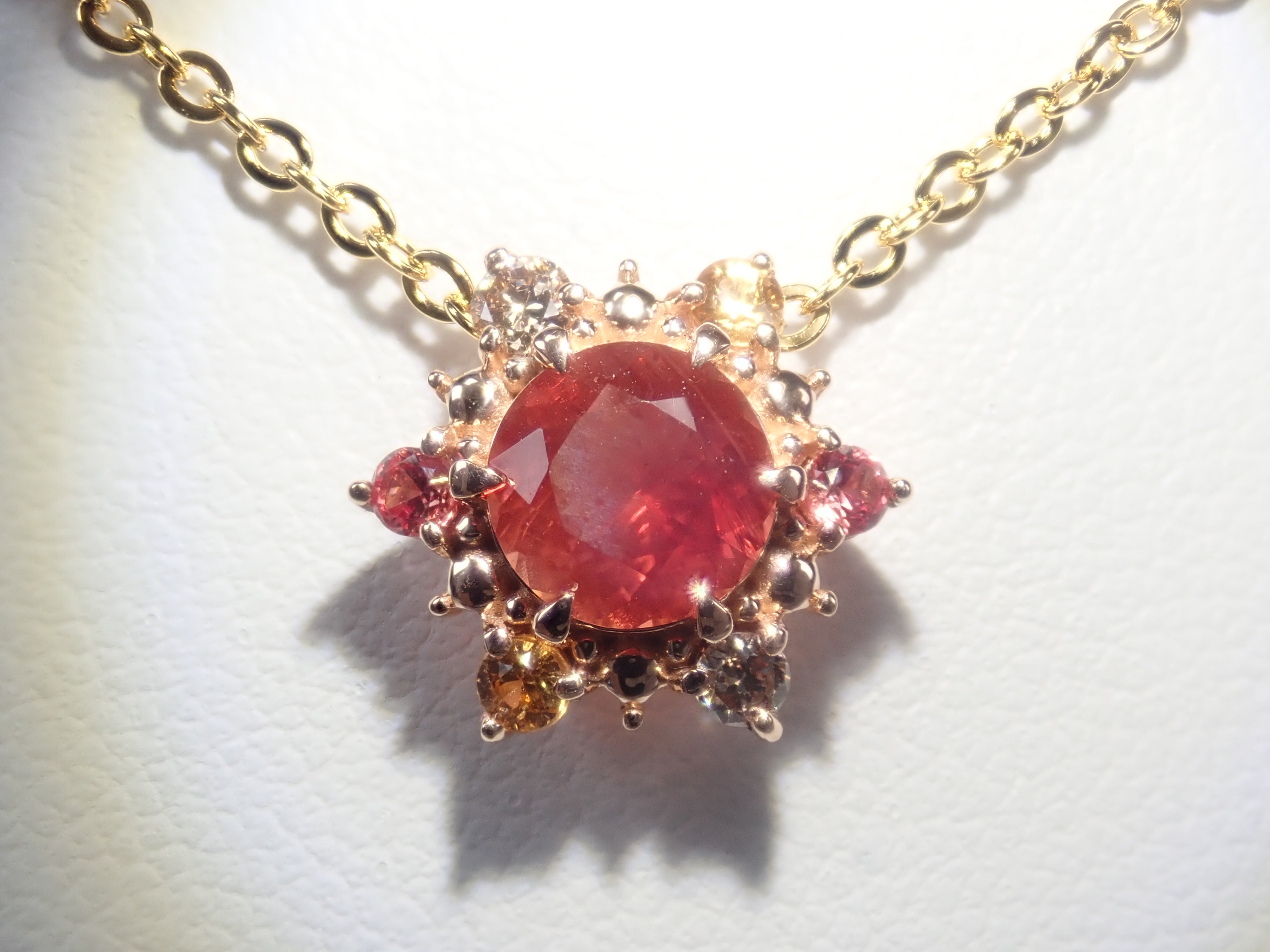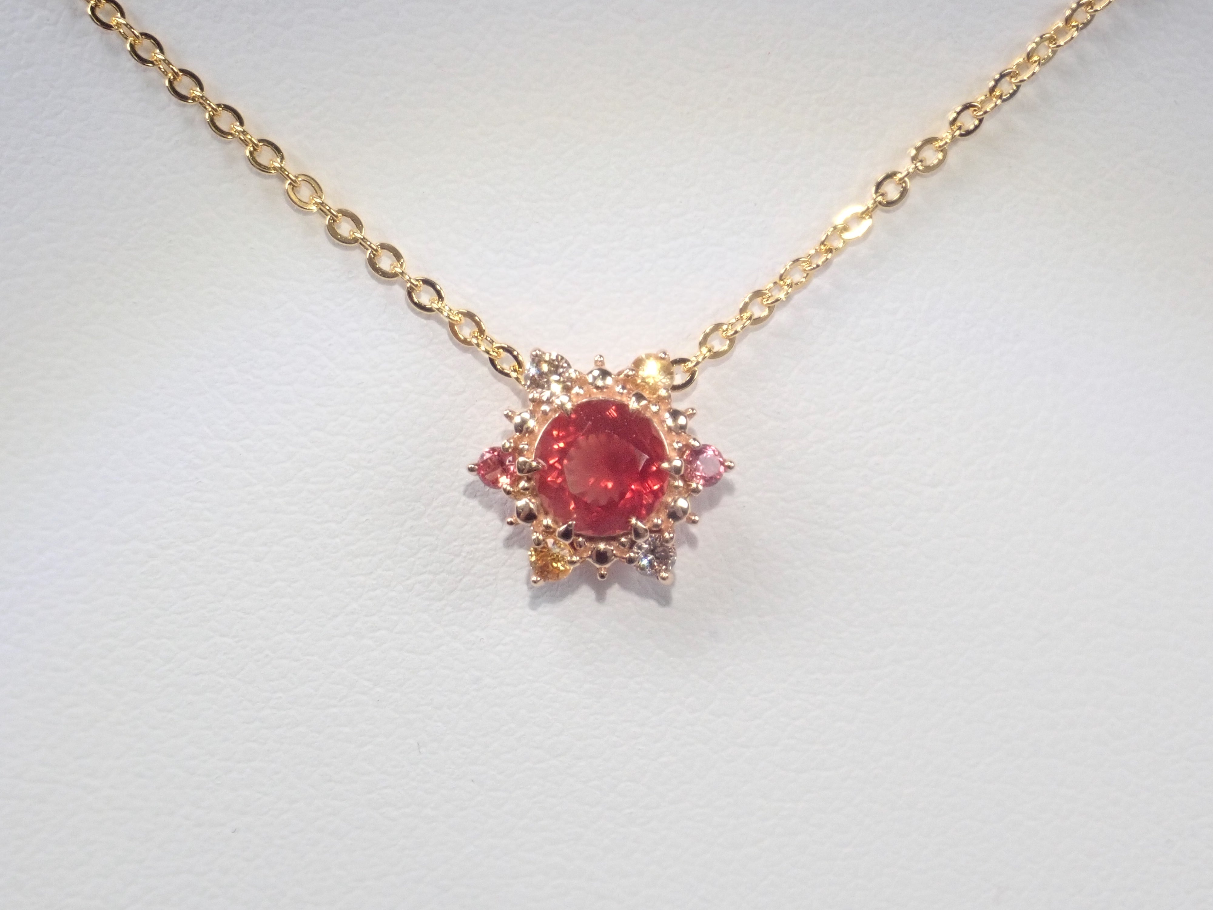 美國俄勒岡州太陽石 0.676 克拉 K18YG、帕帕拉恰彩色藍寶石、棕色鑽石吊墜(項鍊)