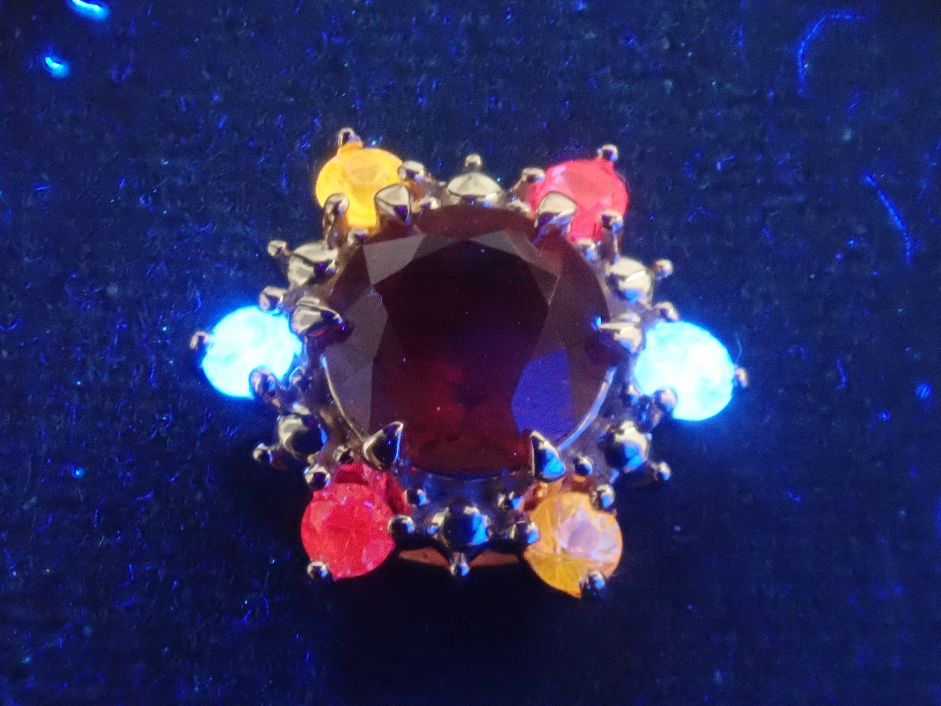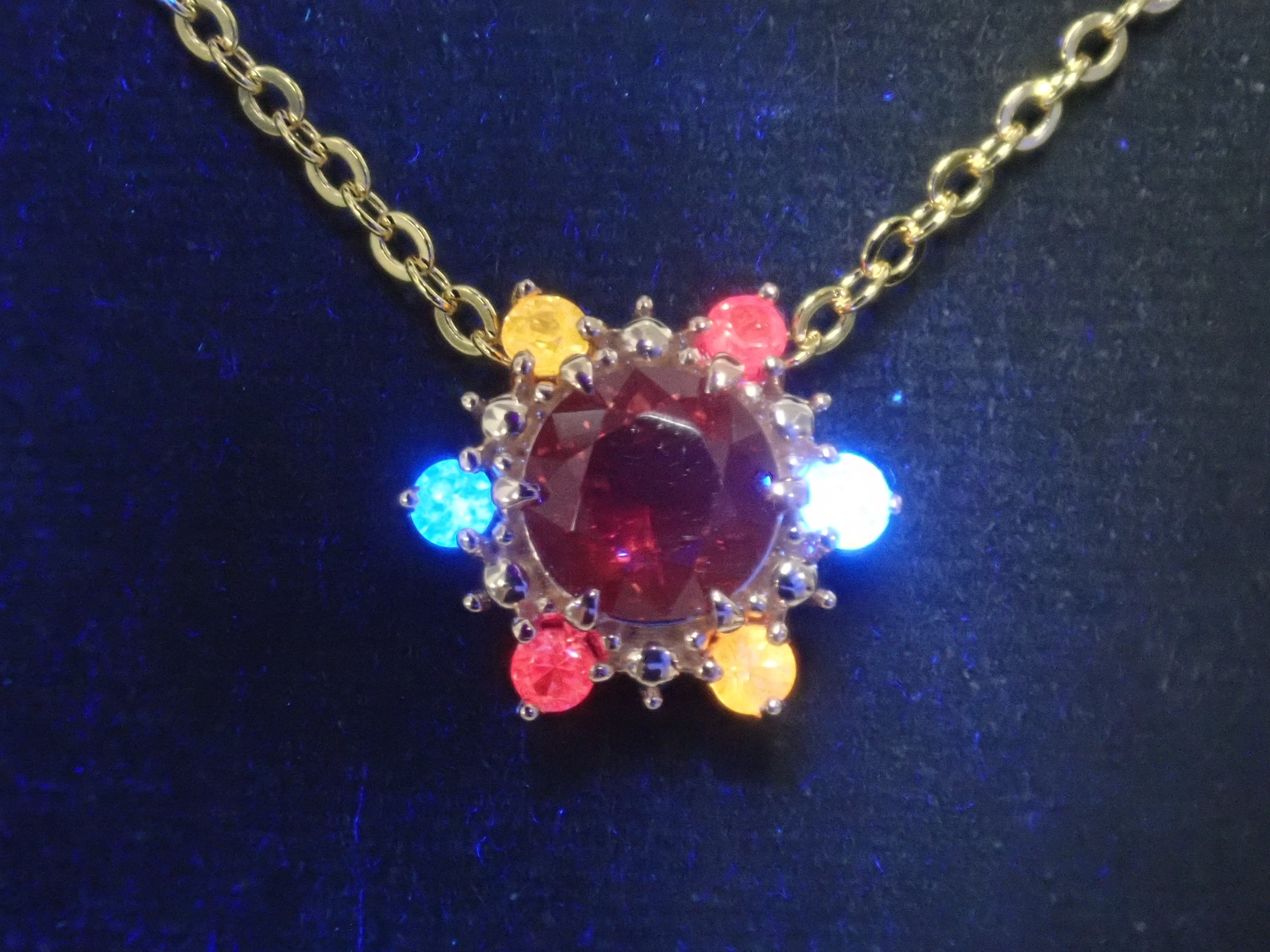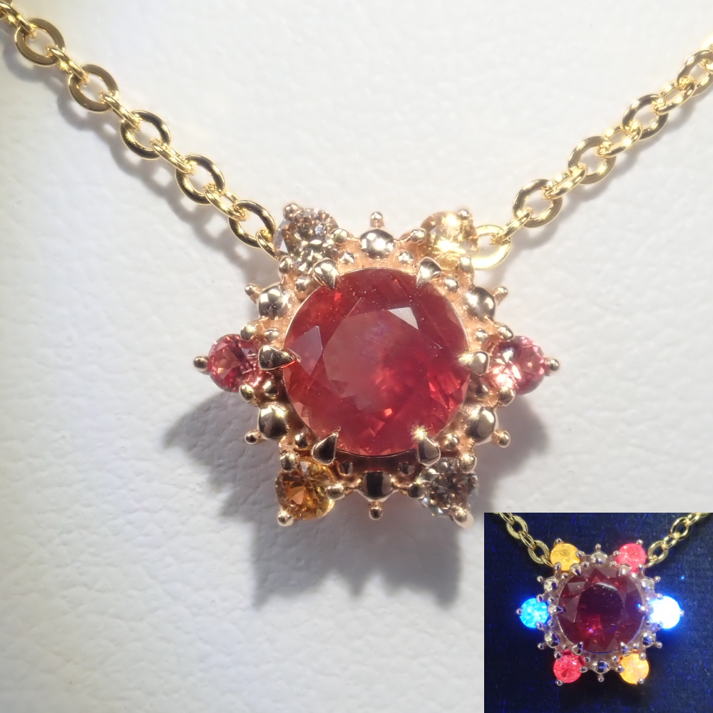 這款吊墜採用產自美國的俄勒岡州日光石製成,色澤鮮豔溫暖。副石鑲嵌有帕帕拉恰藍寶石、黃色藍寶石和棕色鑽石,色彩搭配精美絕倫。在黑光燈下,還能欣賞到螢光。項鍊單獨販售。