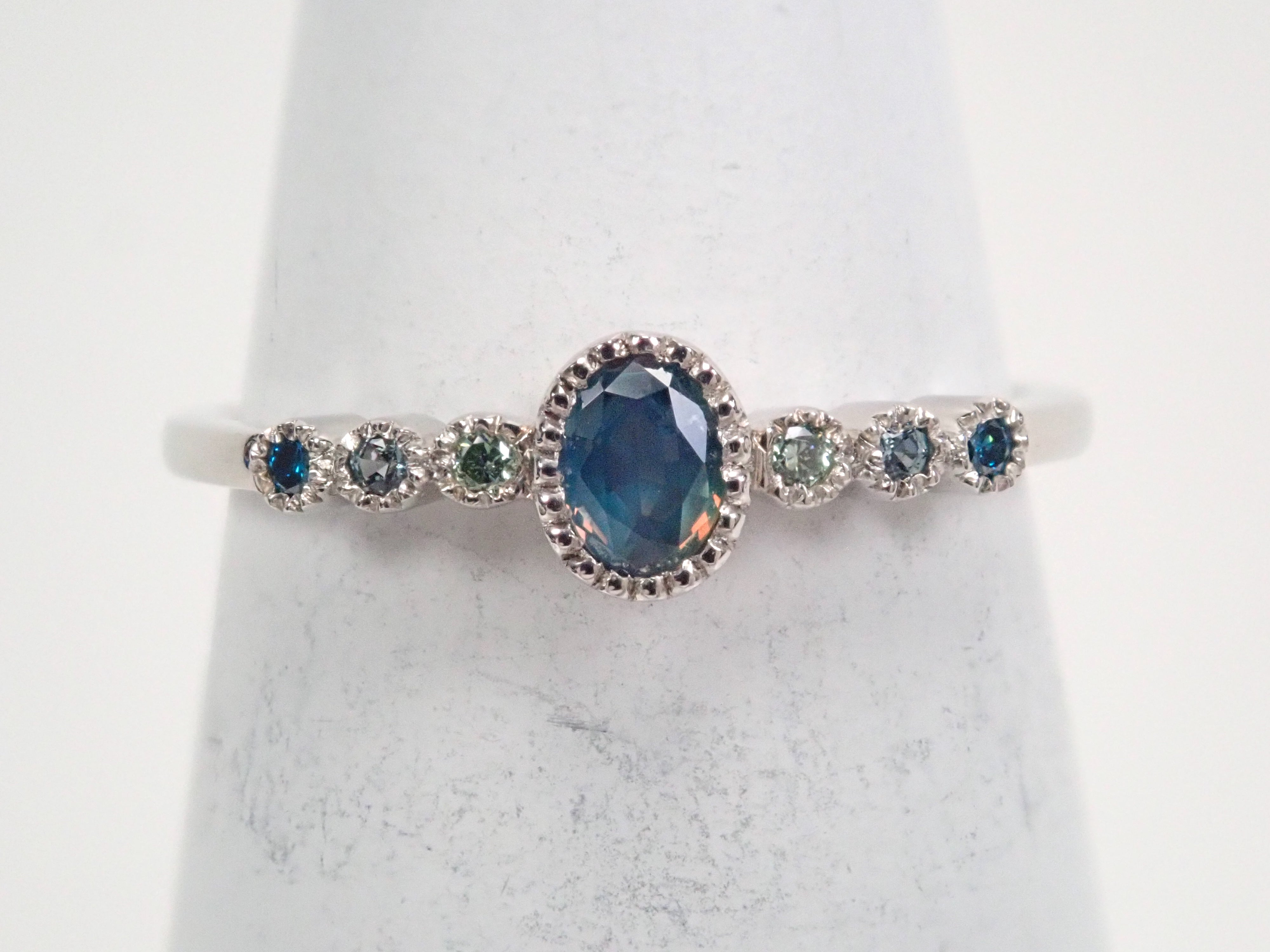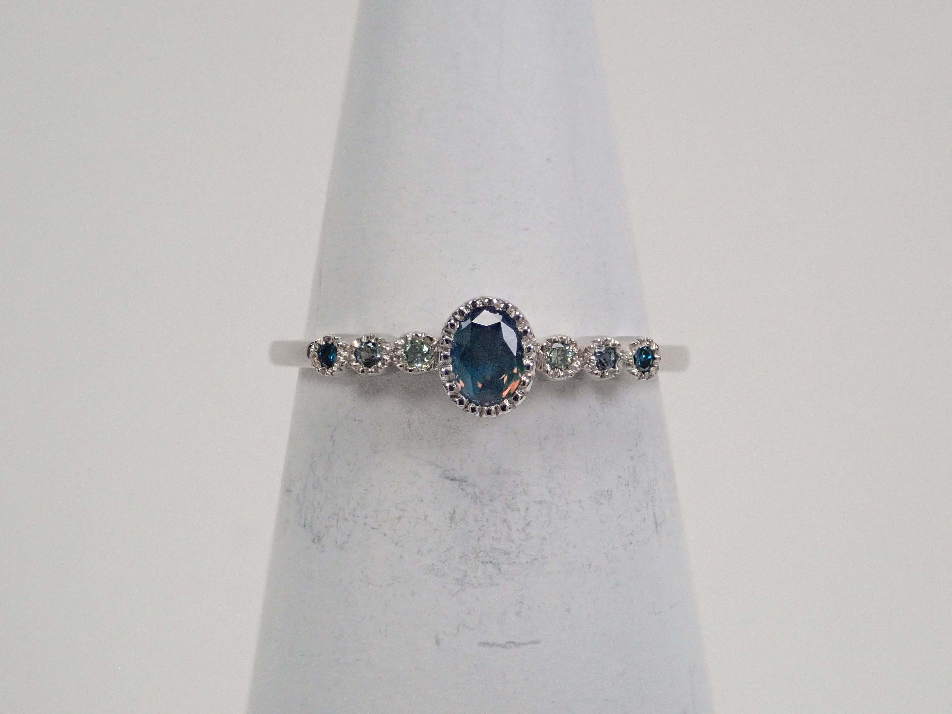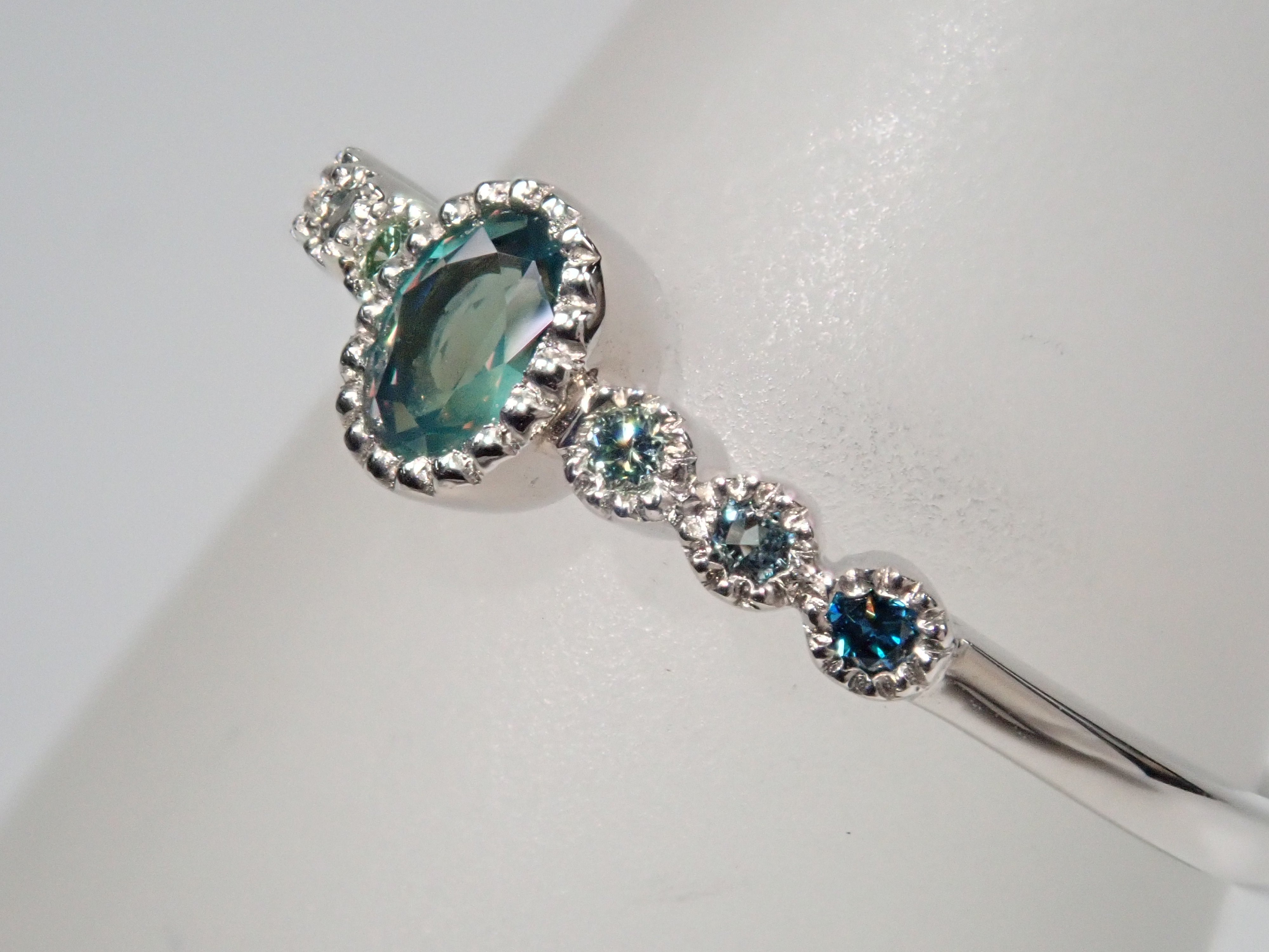 巴西紫翠玉這枚戒指重約0.144克拉。副石由合成綠鑽、亞歷山大變石和經過處理的藍鑽組成,給人一種沉穩的印象。戒指的基底金屬為鉑金,硬鉑金的光澤與寶石的冷峻光澤完美契合。
