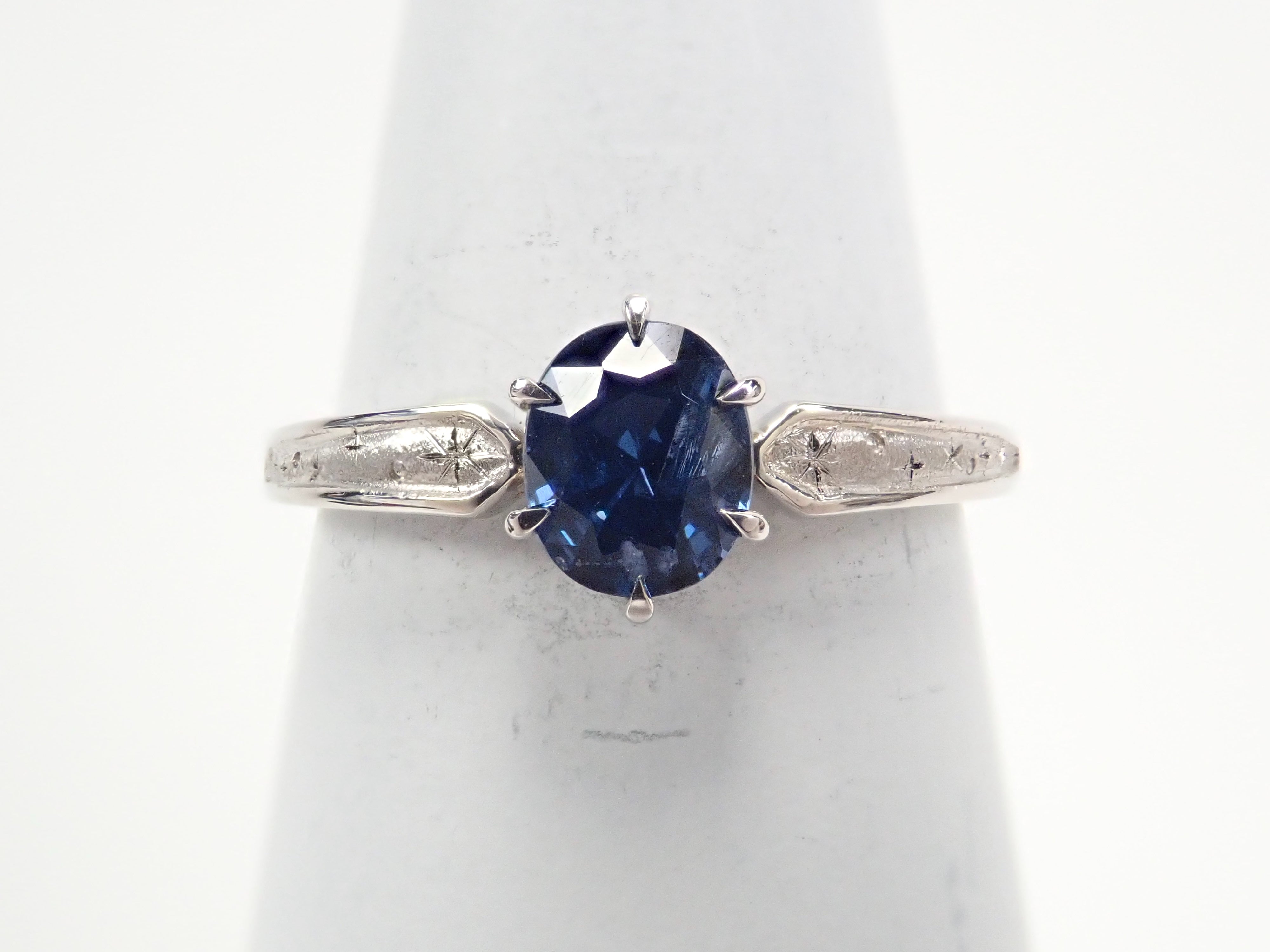 這枚戒指由產自斯里蘭卡的鈷尖晶石製成。這顆鈷尖晶石重達近0.7克拉,尺寸驚人。它色澤深邃美麗,戒臂採用啞光處理(鑽石尖頭處理)並飾有雕刻圖案。這件珠寶簡約時尚,外觀精美。這顆斯里蘭卡鈷尖晶石是斯里蘭卡當地採購的裸石。