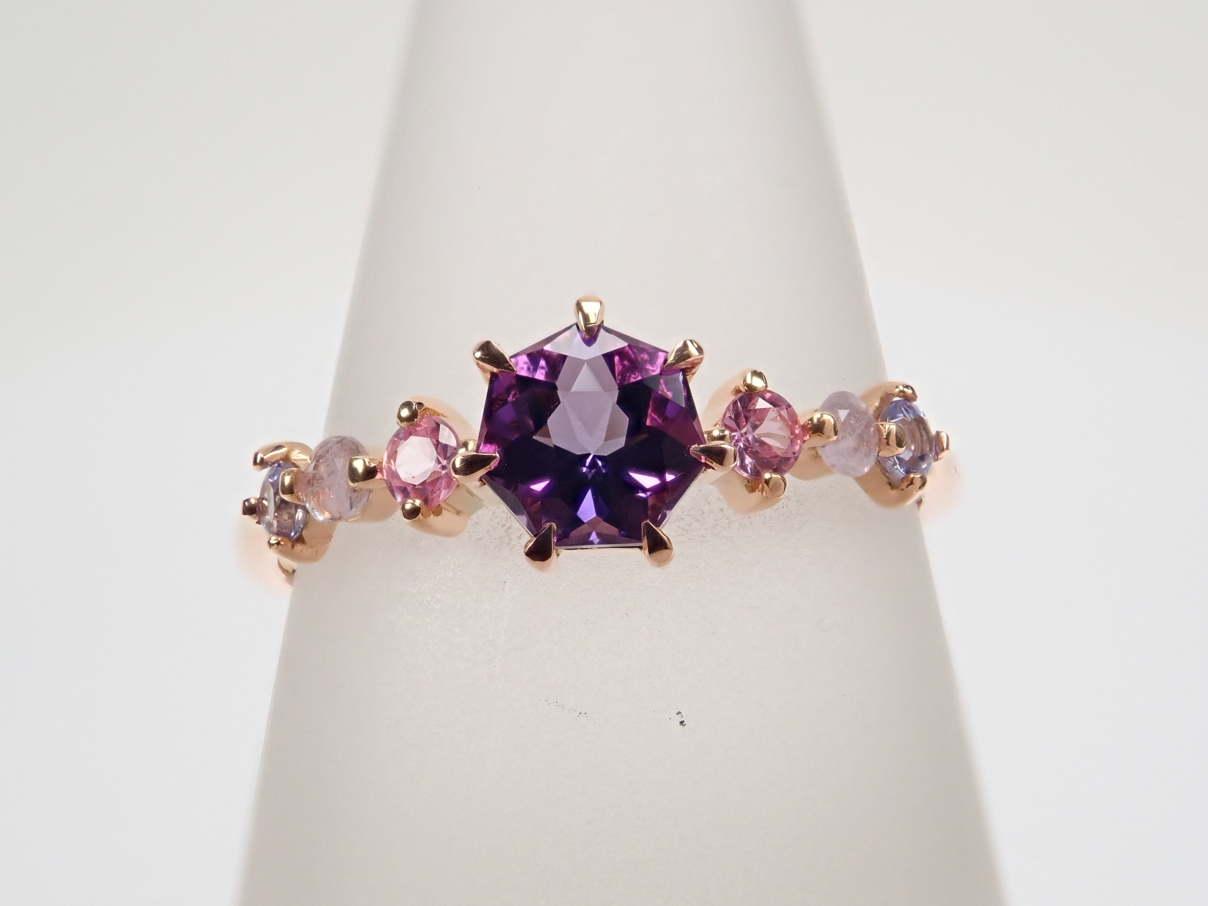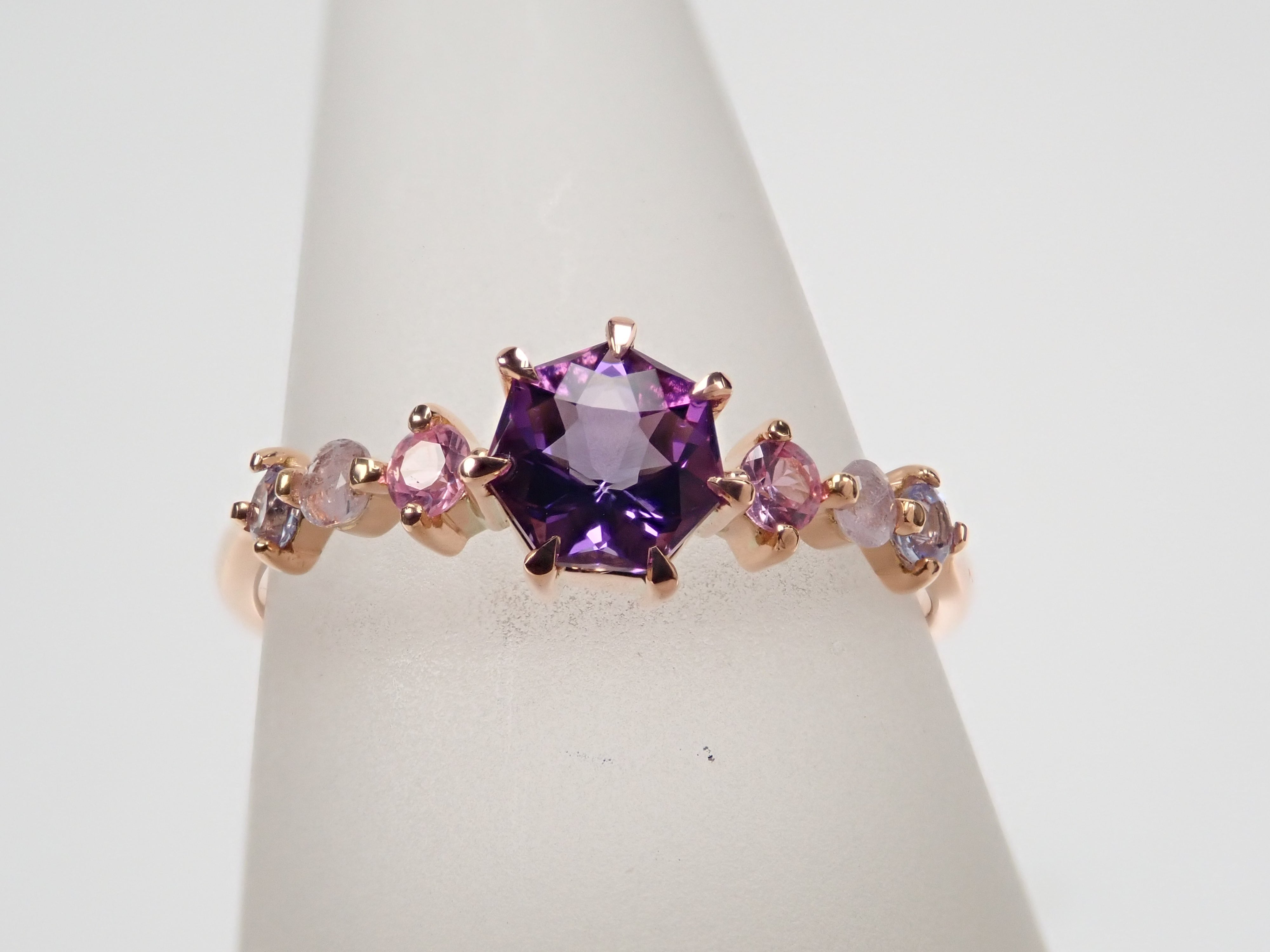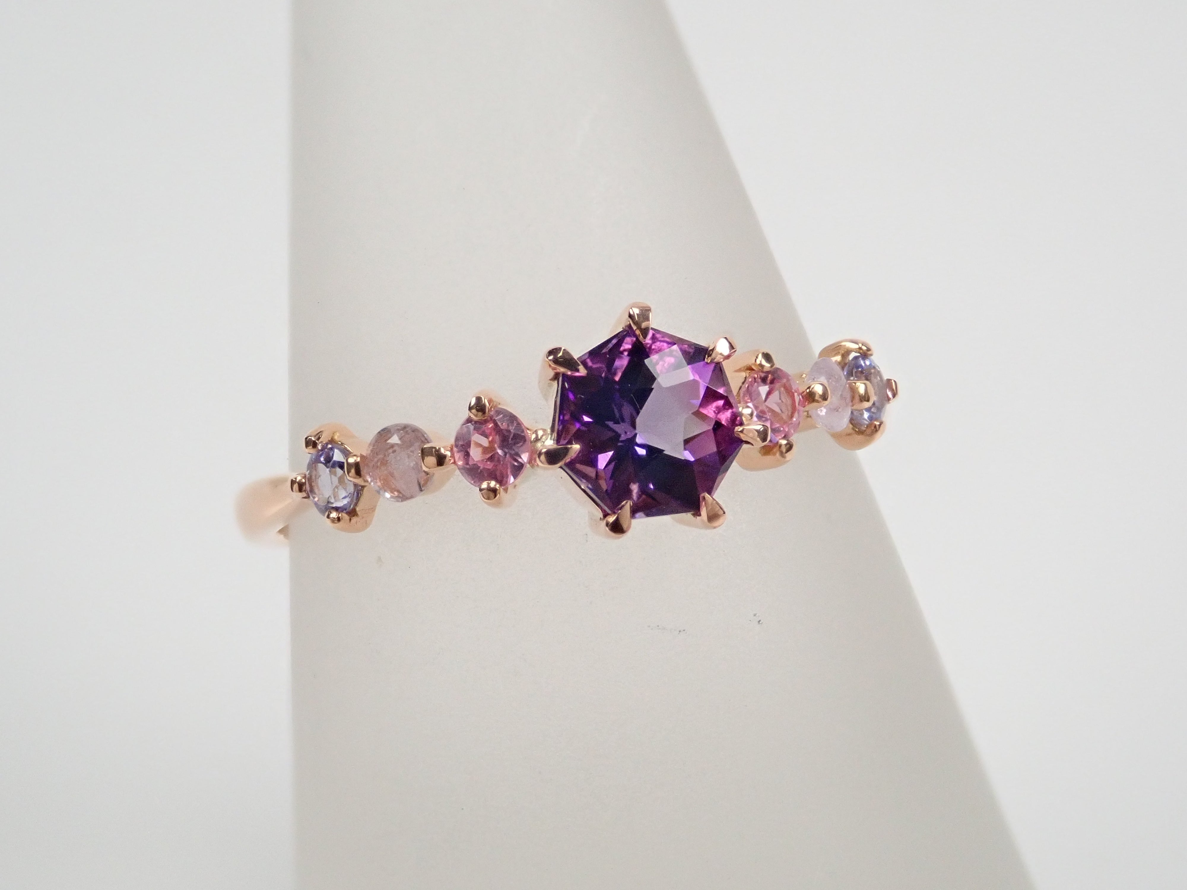 這款戒指鑲嵌著紫水晶和彩色寶石。中央的紫水晶呈現罕見的七邊形,散發出迷人的深紫色。側石鑲嵌著粉紅色藍寶石、黑曜石和坦桑石等色彩繽紛的彩色寶石,給人一種可愛的感覺。黑曜石在紫外光下會發出螢光,因此您可以用燈光來欣賞它。