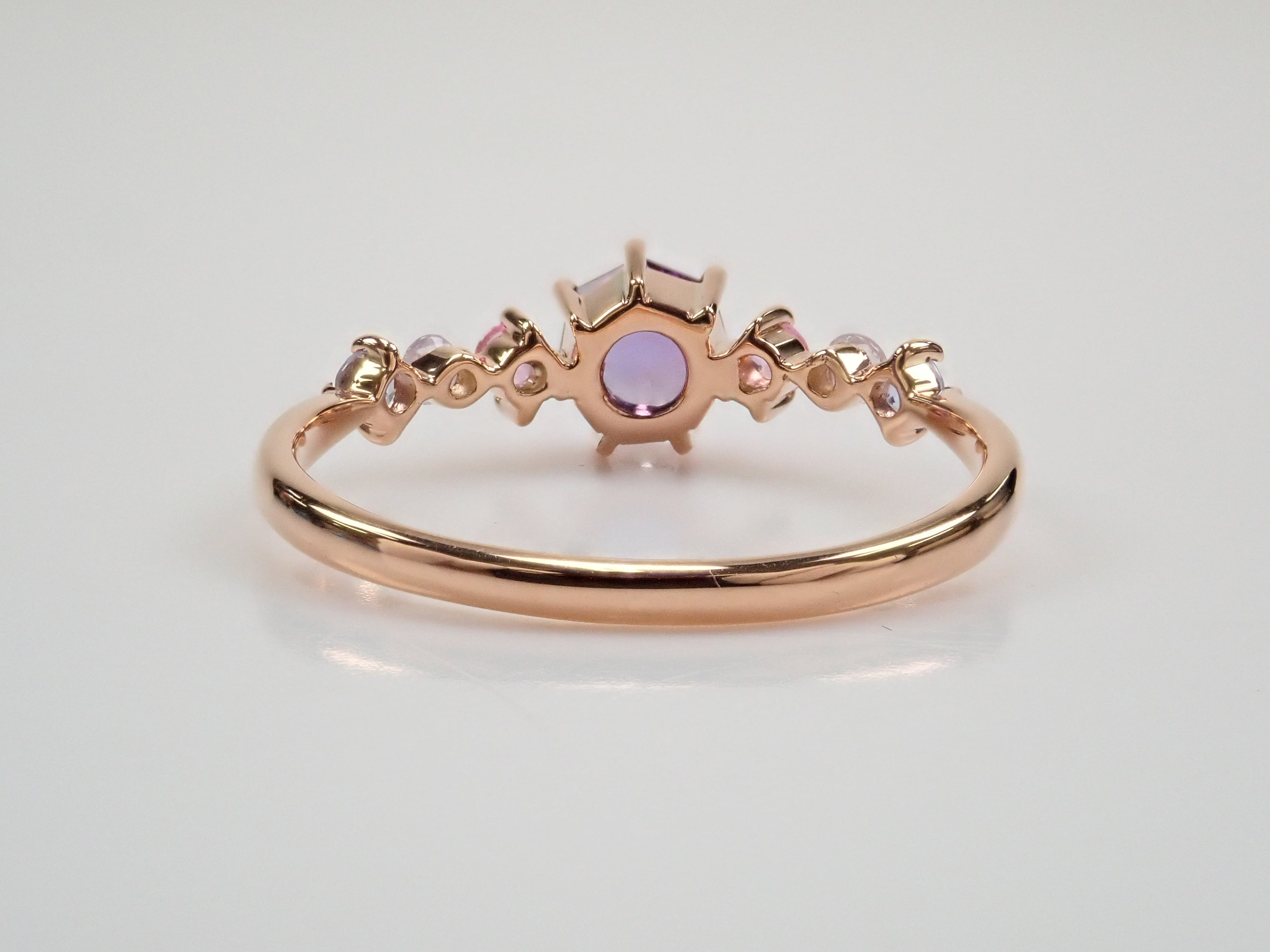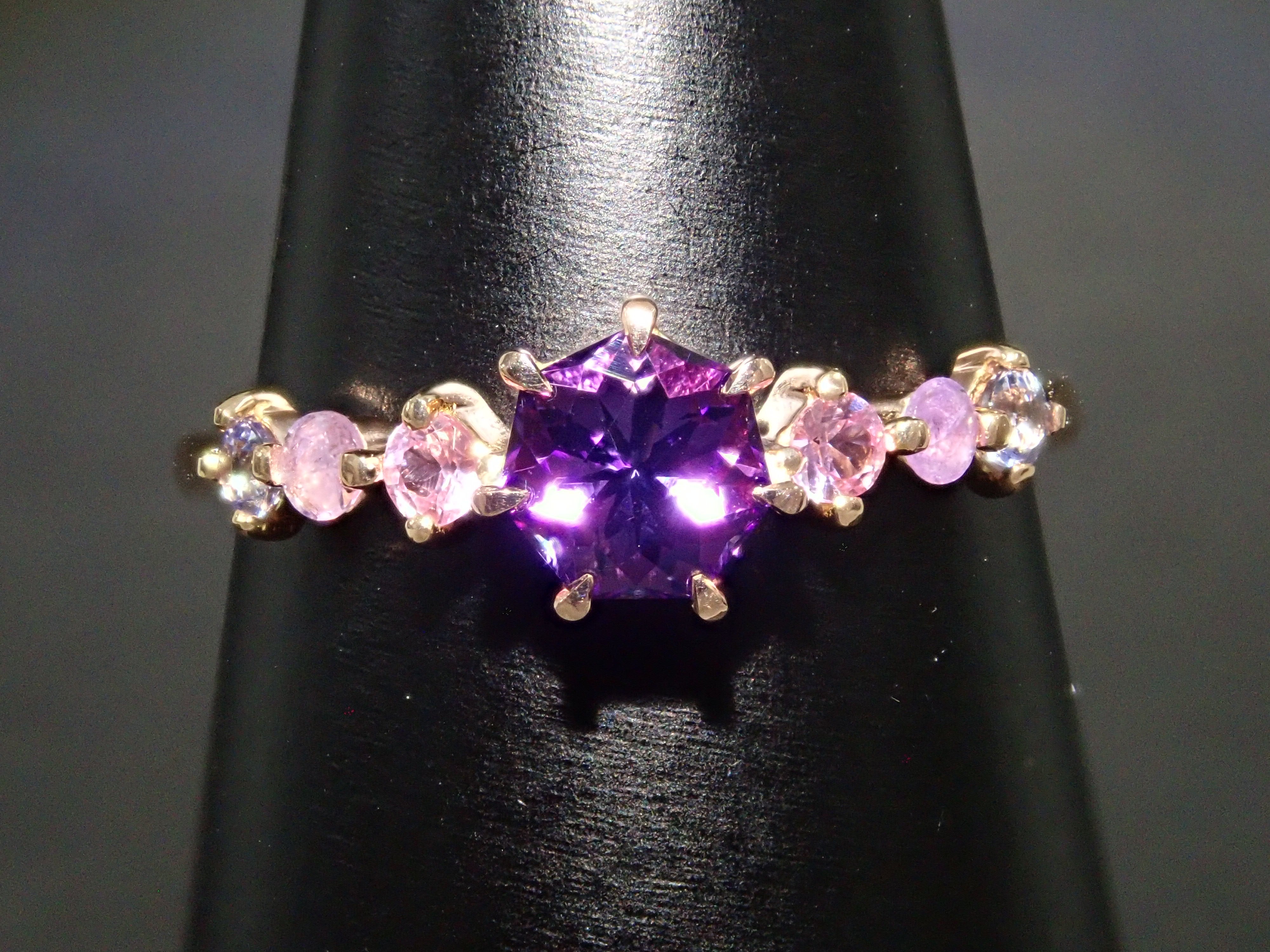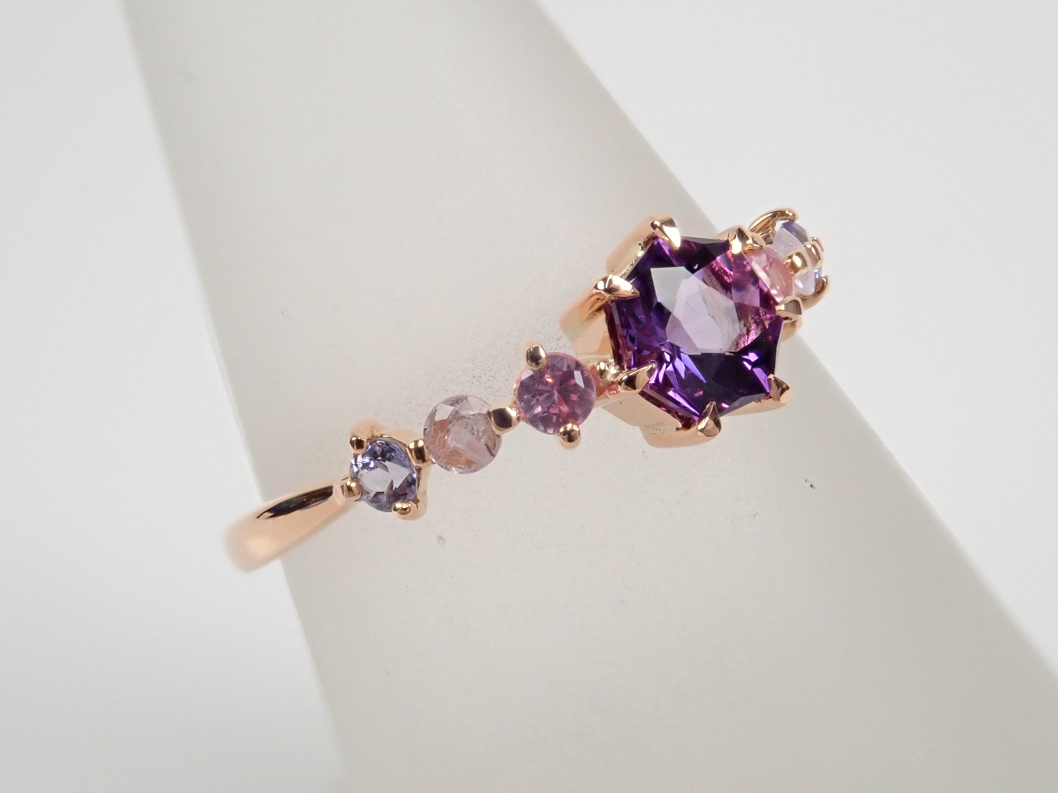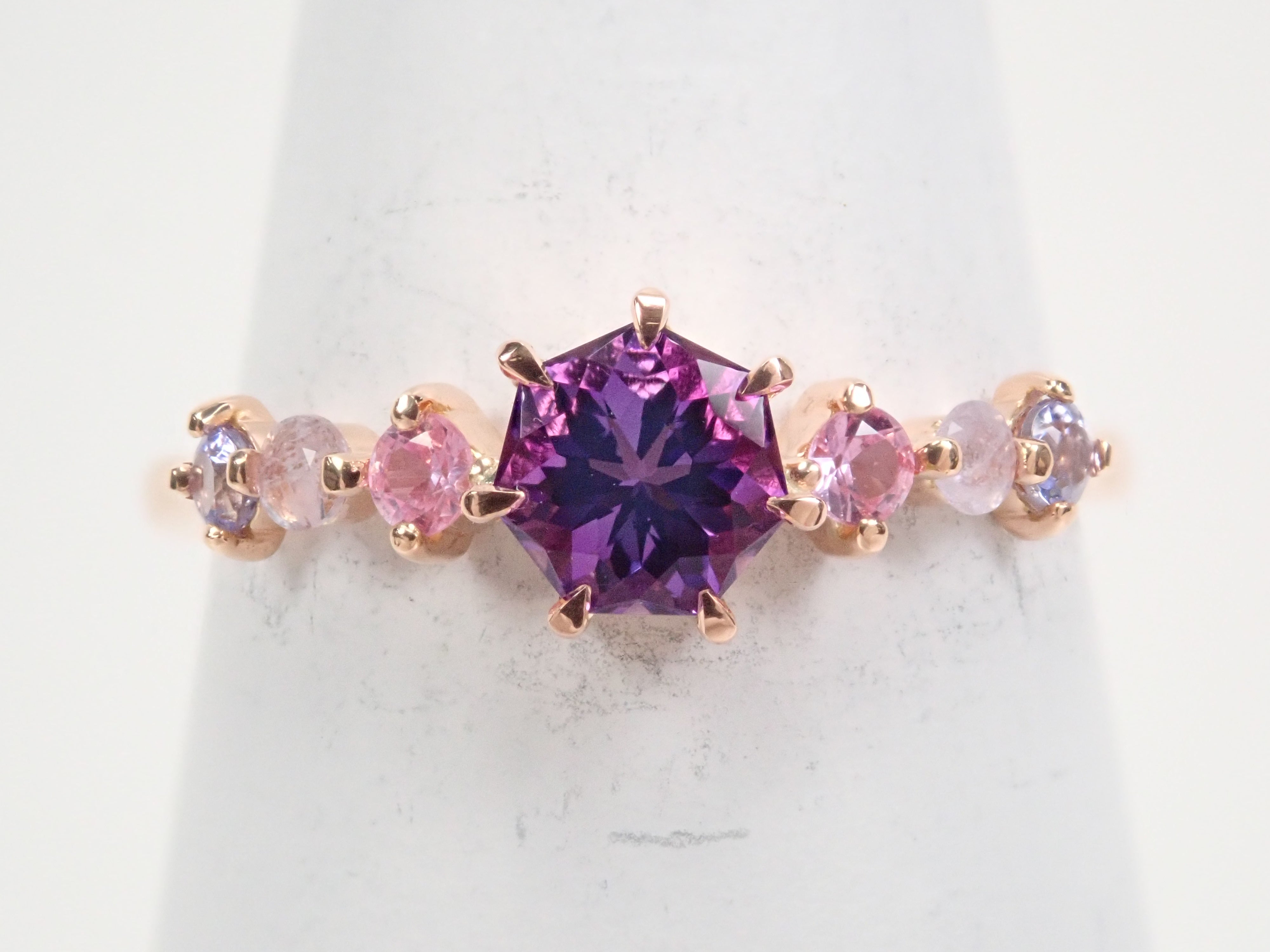 這款戒指鑲嵌著紫水晶和彩色寶石。中央的紫水晶呈現罕見的七邊形,散發出迷人的深紫色。側石鑲嵌著粉紅色藍寶石、黑曜石和坦桑石等色彩繽紛的彩色寶石,給人一種可愛的感覺。黑曜石在紫外光下會發出螢光,因此您可以用燈光來欣賞它。