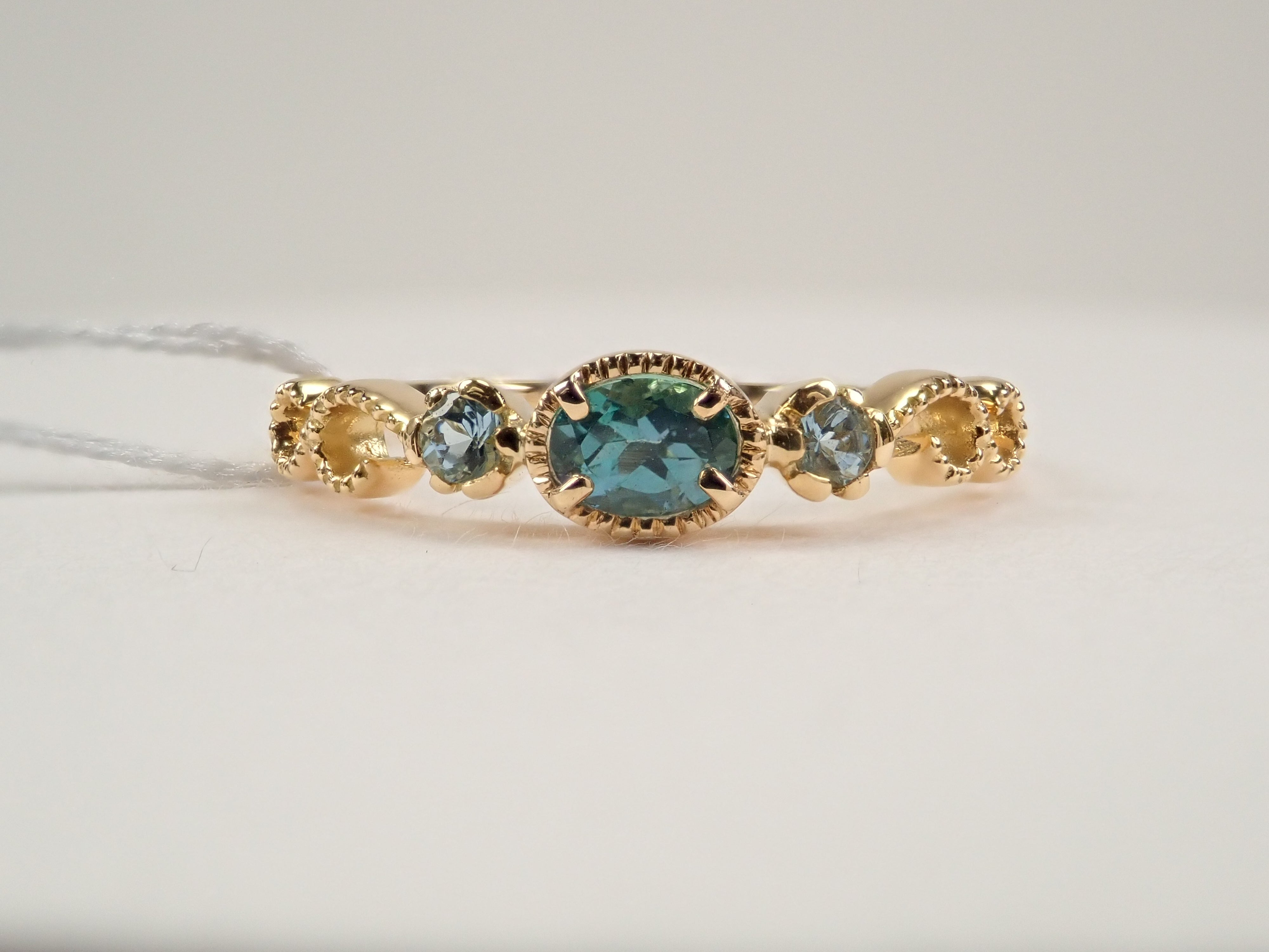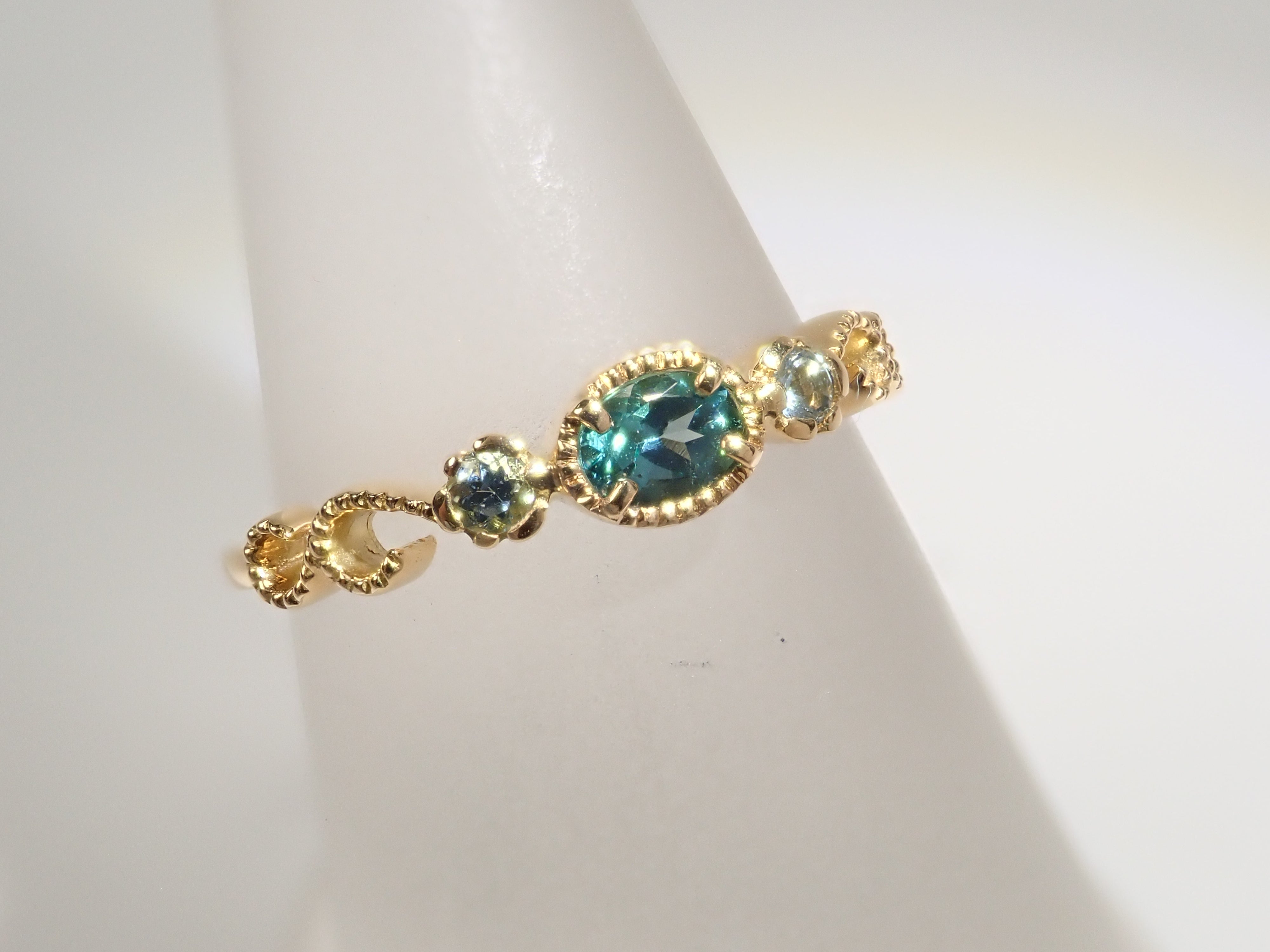這枚戒指採用坦尚尼亞科納魯石精製而成。其鮮豔的藍綠色與黃金形成絕美對比。海藍寶石鑲嵌於副石上,使整體配色和諧統一。