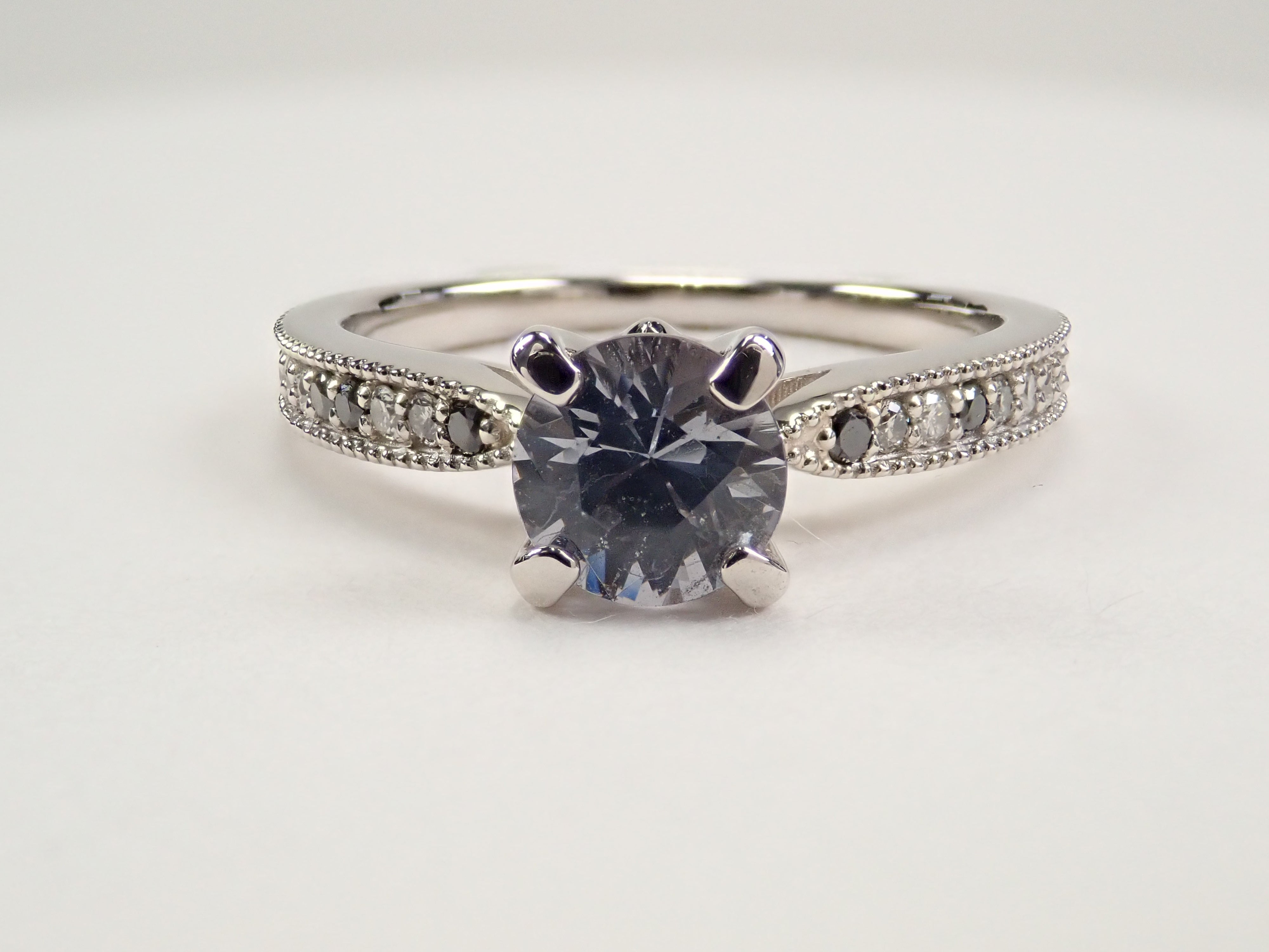 這枚戒指的特色是尖晶石,因其豐富的色彩而廣受歡迎。這種特殊的灰色尖晶石,又稱為鉑金尖晶石,以其低調的美感散發出獨特的氣質。主石是一顆5.5毫米的灰色尖晶石,副石包括黑色鑽石和椒鹽色鑽石,營造出協調的氛圍。戒托上鑲嵌兩顆VS級無色鑽石。