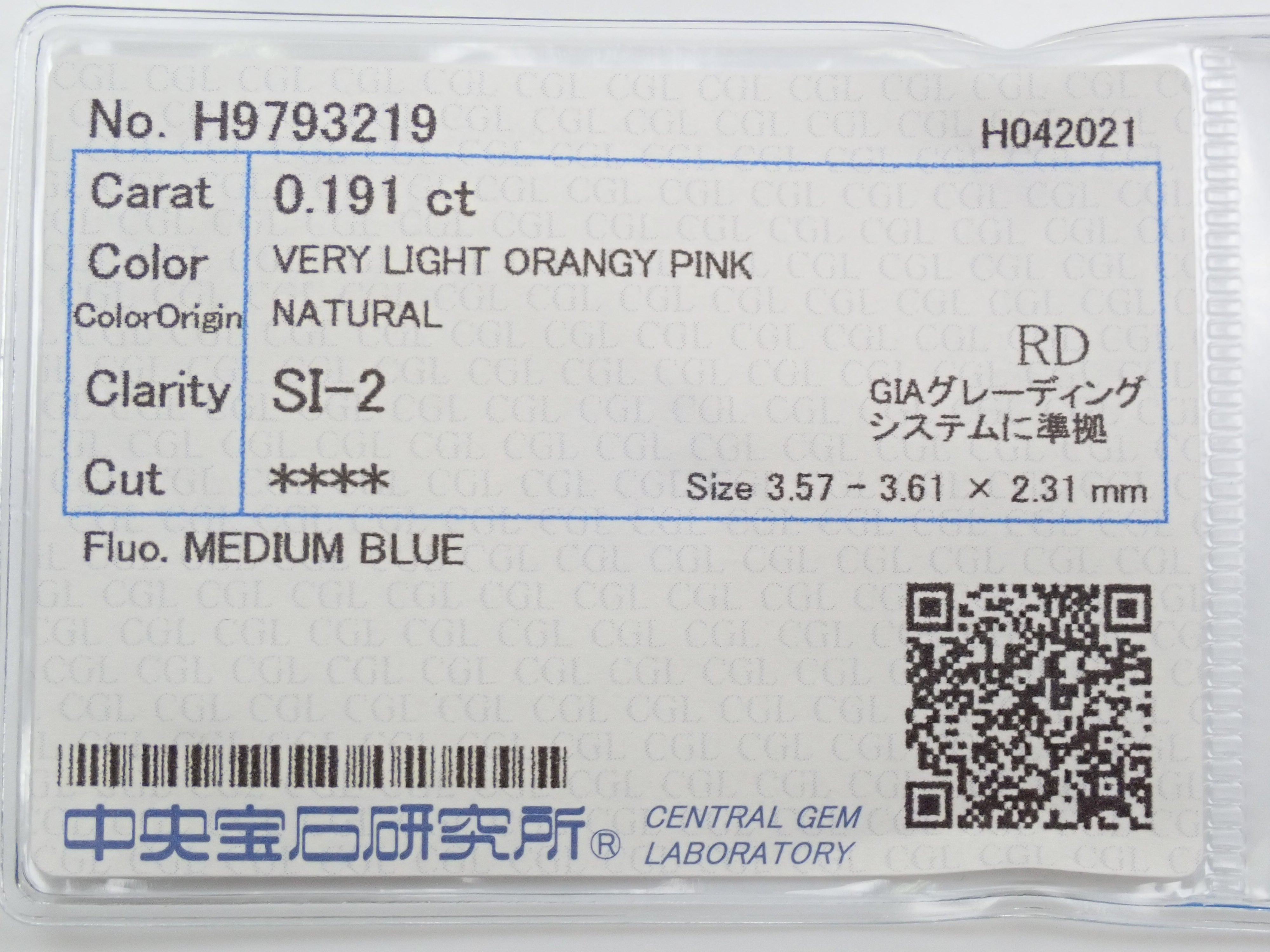 粉紅鑽石 0.191 克拉裸鑽(極淺橙粉色,SI2)。