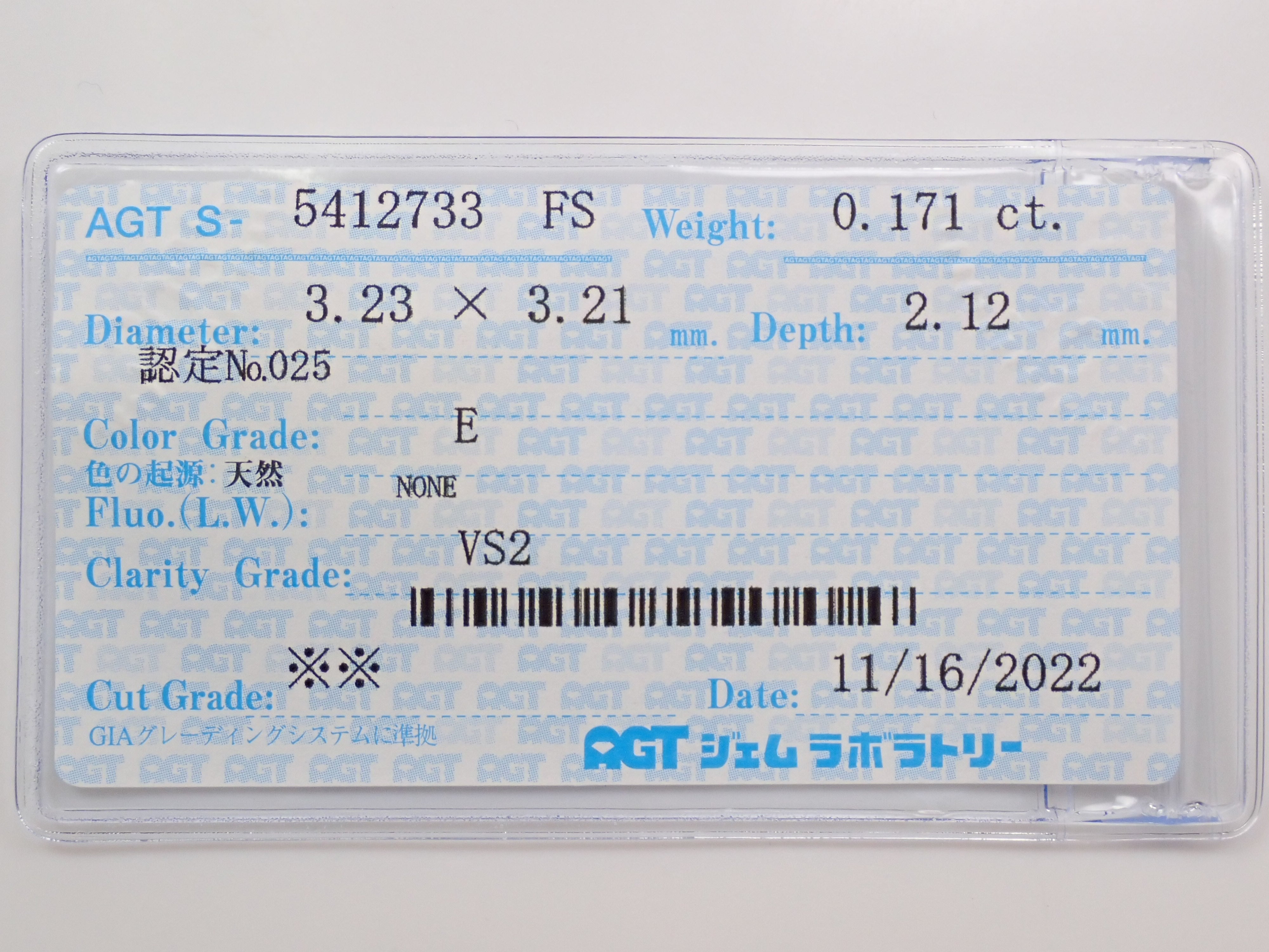 這是一顆 0.171 克拉的明亮式切割鑽石裸石(E,VS2)。