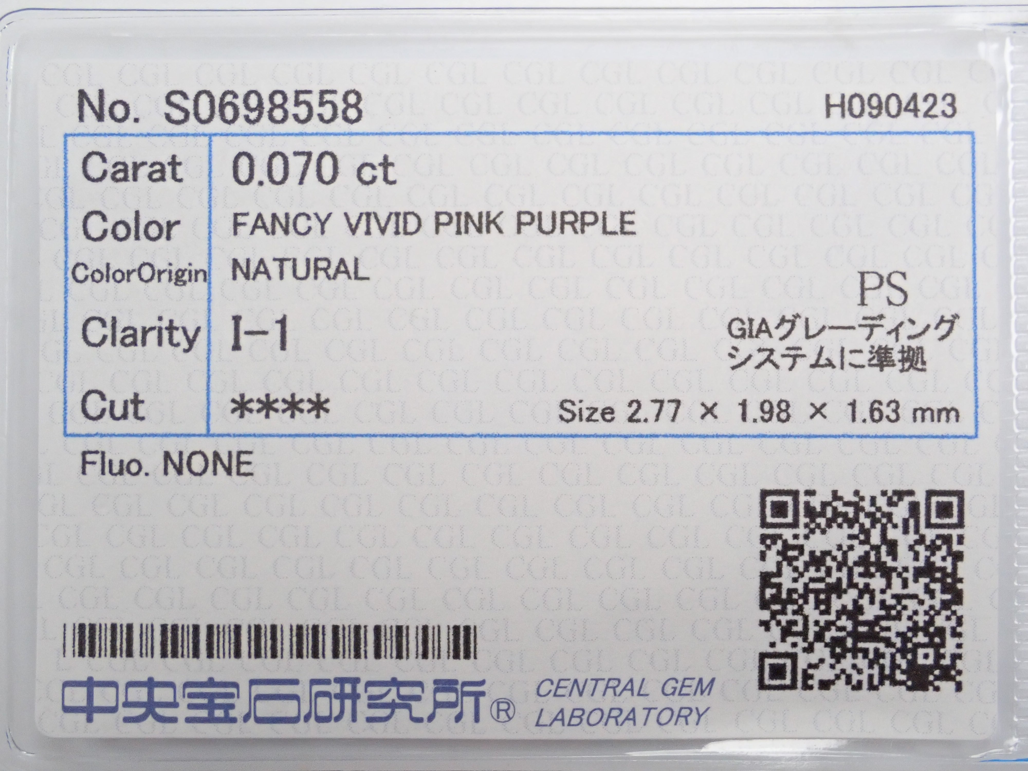 在眾多寶石中,鑽石是最特別的寶石之一。歷史上出現的許多著名的鑽石首飾都為我們帶來了各種各樣的軼事和傳說。事實上,這顆寶石有多種顏色變化,但這顆是一顆特別華麗的粉紅色鑽石。享受美麗的光澤。 FANCY VIVID PINK PURPLE 的紫色鑽石。由於它是 FANCT VIVID,因此您可以用肉眼看到粉紫色。由中央寶石研究所進行分類。