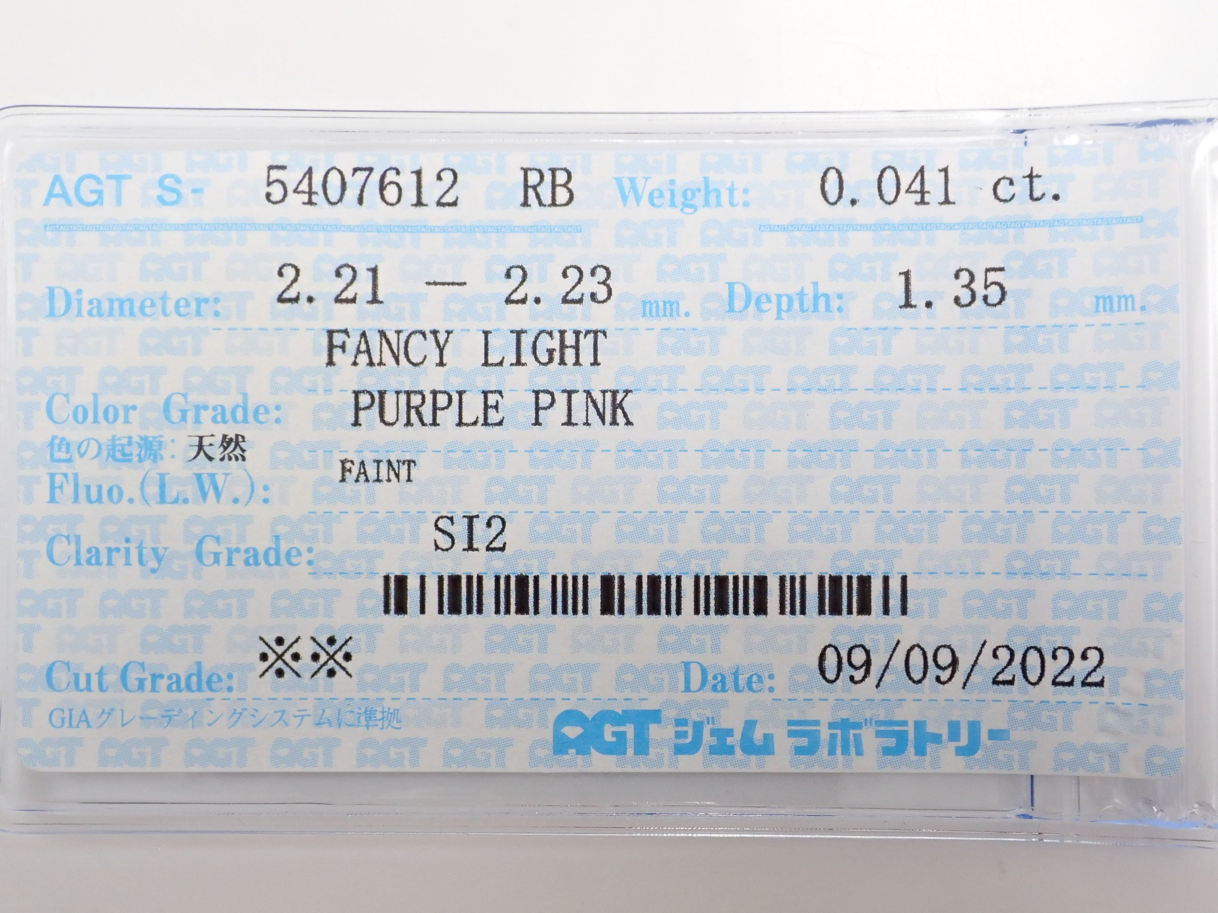 粉紅鑽 0.041 克拉裸鑽(淡紫色粉紅色,SI2)。配備 AGT 寶石實驗室分類。