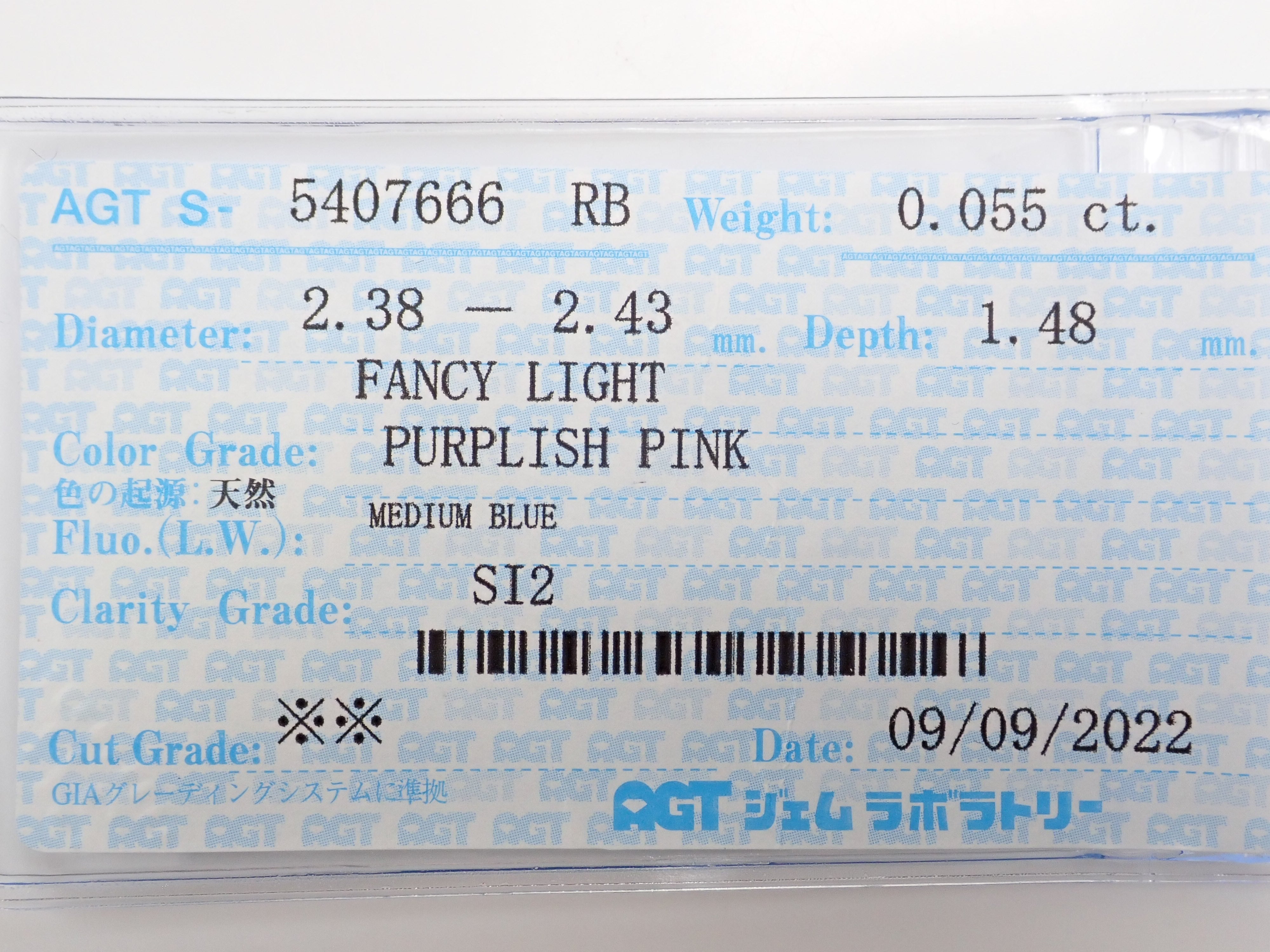 粉紅鑽石 0.055 克拉裸鑽(淡紫色粉紅色,SI2)。配備 AGT 寶石實驗室分類。