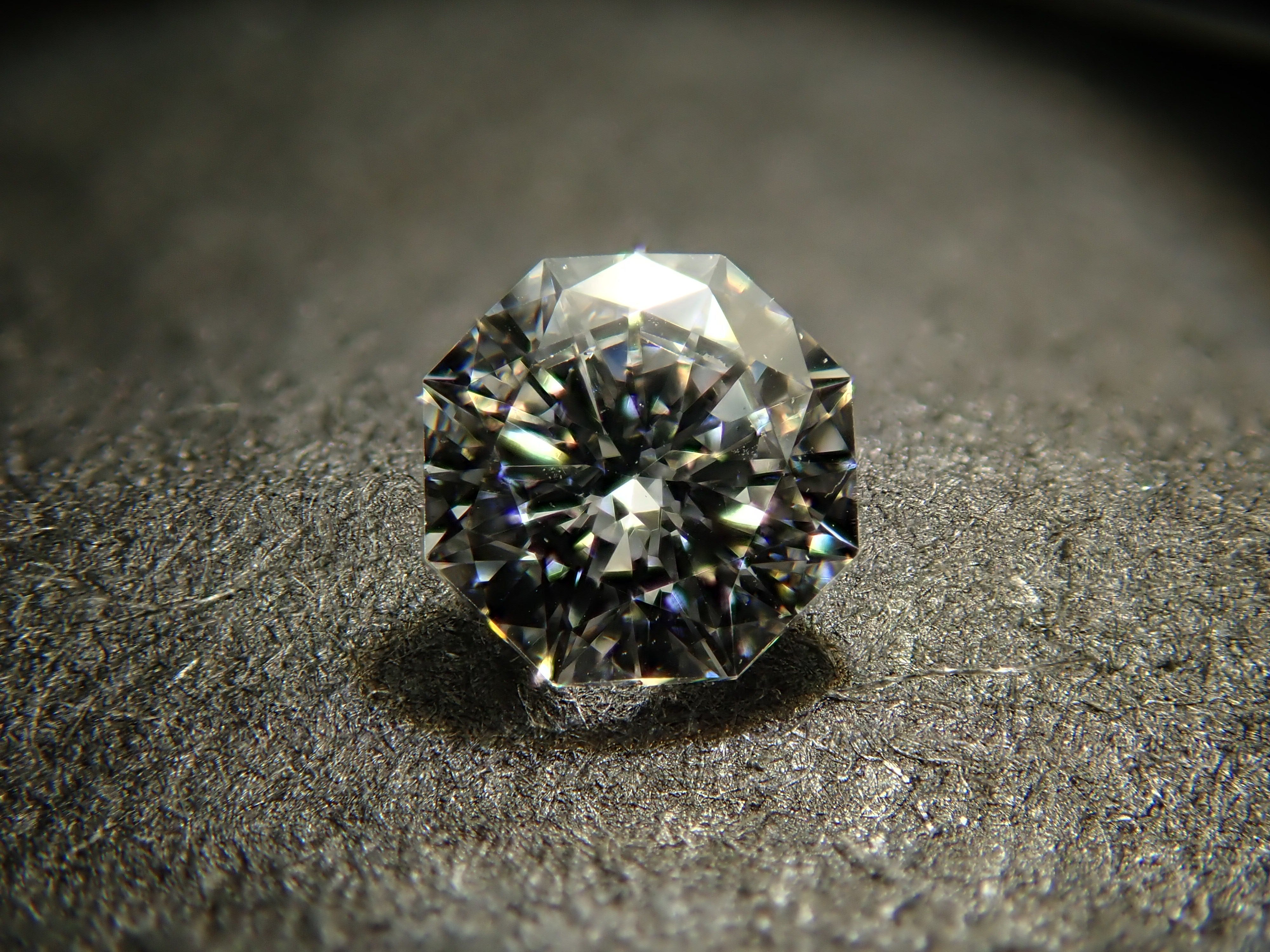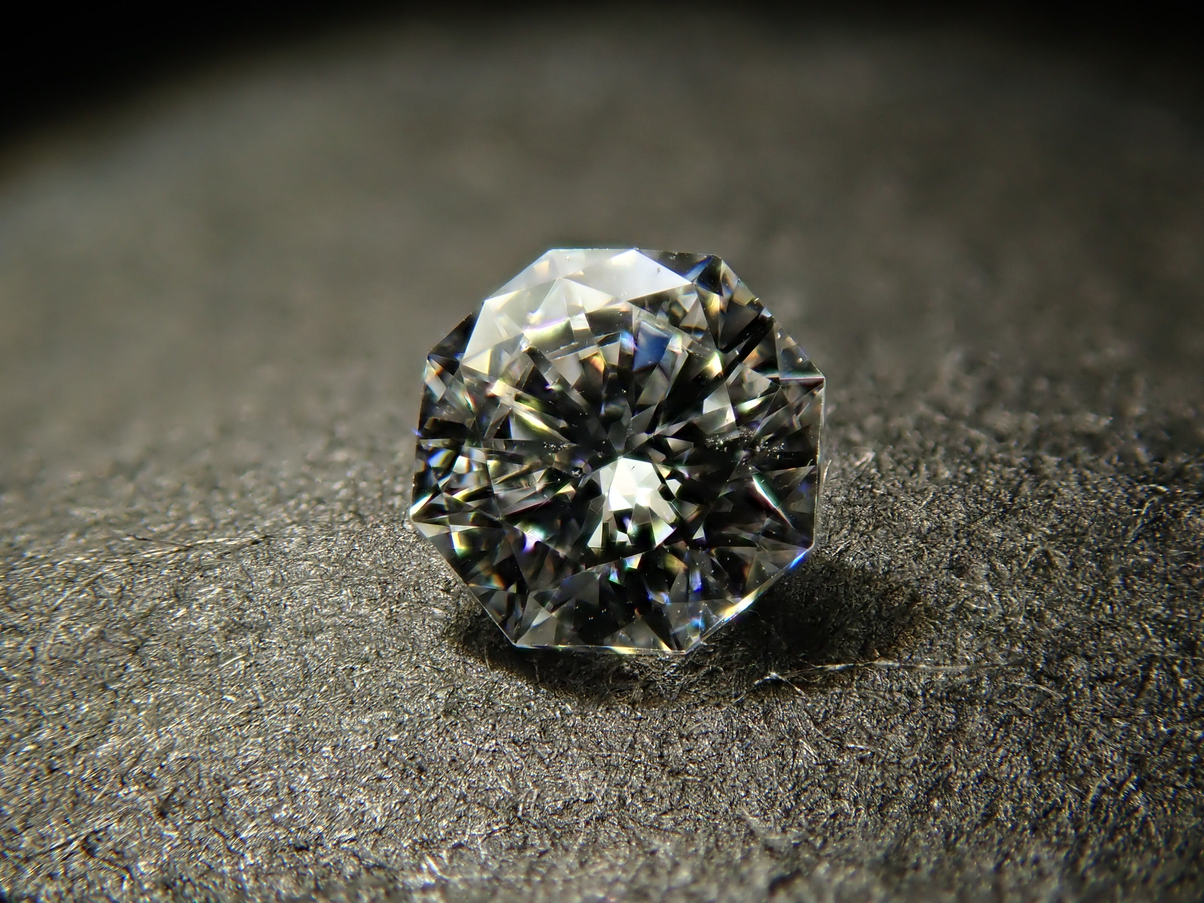 這是一顆 3.0 毫米/0.123 克拉的裸鑽(D、VS2、八角形切割)。經過中央寶石實驗室的分類。