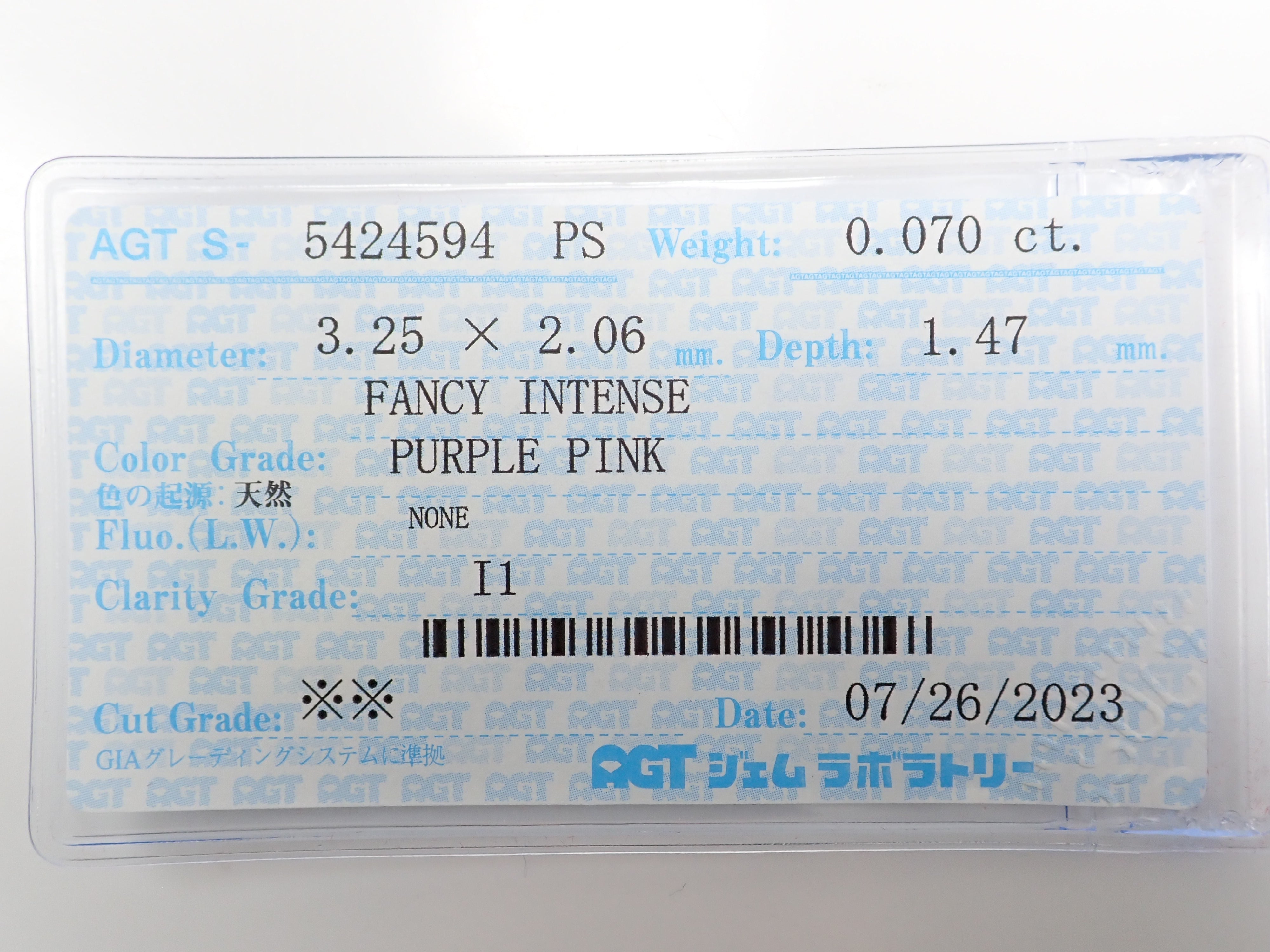 粉紅鑽 0.070 克拉裸鑽(濃彩紫粉紅,I1)。附有 AGT 寶石實驗室。由於花色濃烈,您可以用肉眼清楚地欣賞到粉紅色。