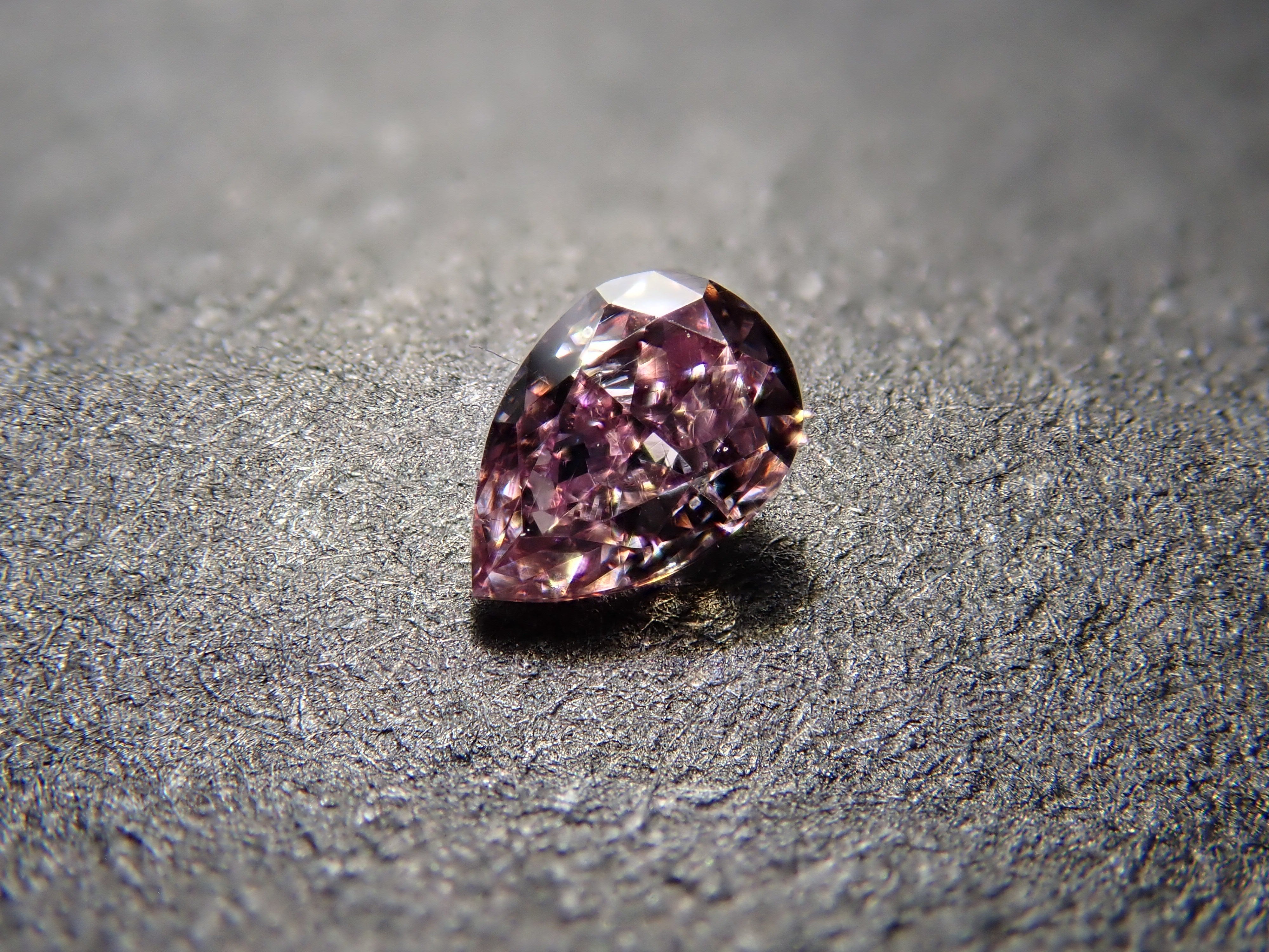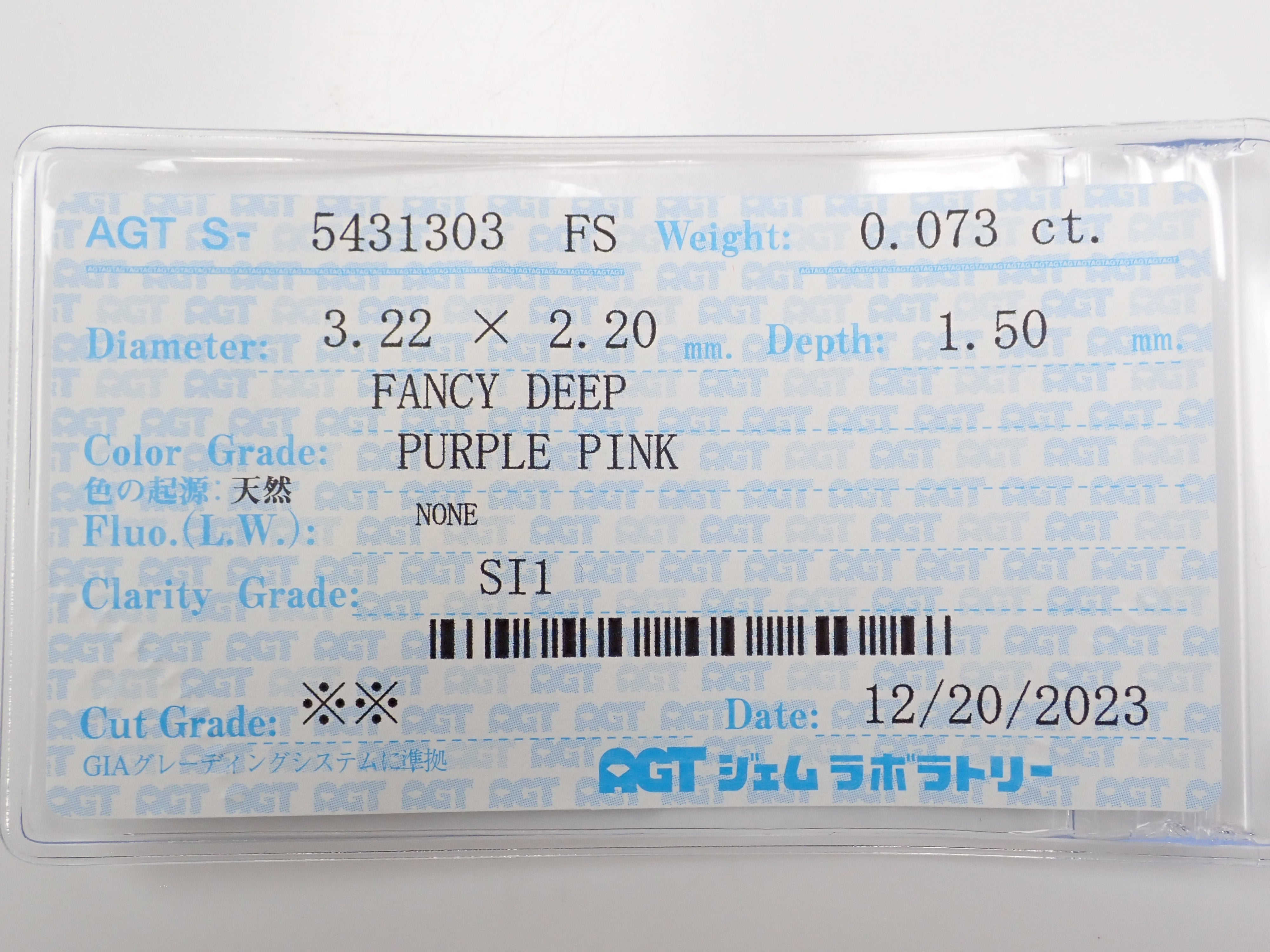 粉紅鑽 0.073 裸鑽(深紫粉紅色,SI1)。因為它是 FANCY DEEP,所以肉眼可以清楚地看到粉紅色。
